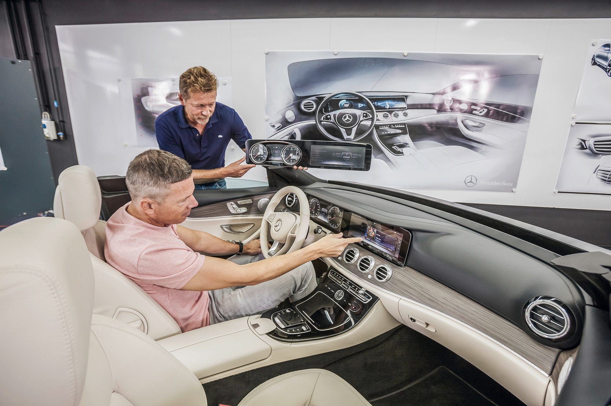 Интерьер нового седана Mercedes-Benz E-класса был рассекречен на прошлой неделе. Теперь я расскажу, что узнал, лично пощупав салон и поговорив с создателями. Фотокамеры у меня забрали: мол, смотри, рисуй потом по памяти, но съёмка ― только фирменная. По словам немцев, роскошный автомобиль должен удивлять прежде всего оснащением. Поэтому передняя панель «ешки» будущего ― как у S-класса настоящего, даже технологичнее. Разрешение пары спрятанных под общим минеральным стеклом жидкокристаллических дисплеев LG с диагоналями по 12,3 дюйма ― 1920×720 против 1440×540.