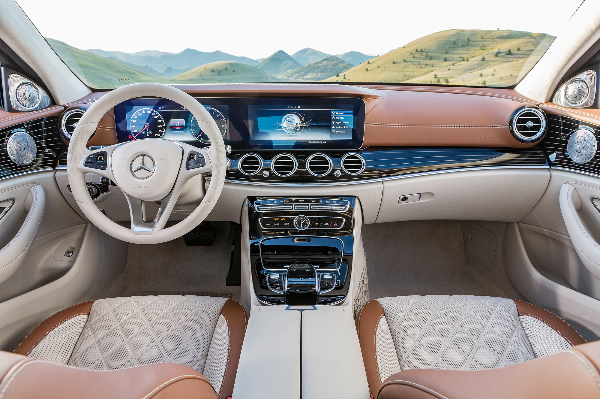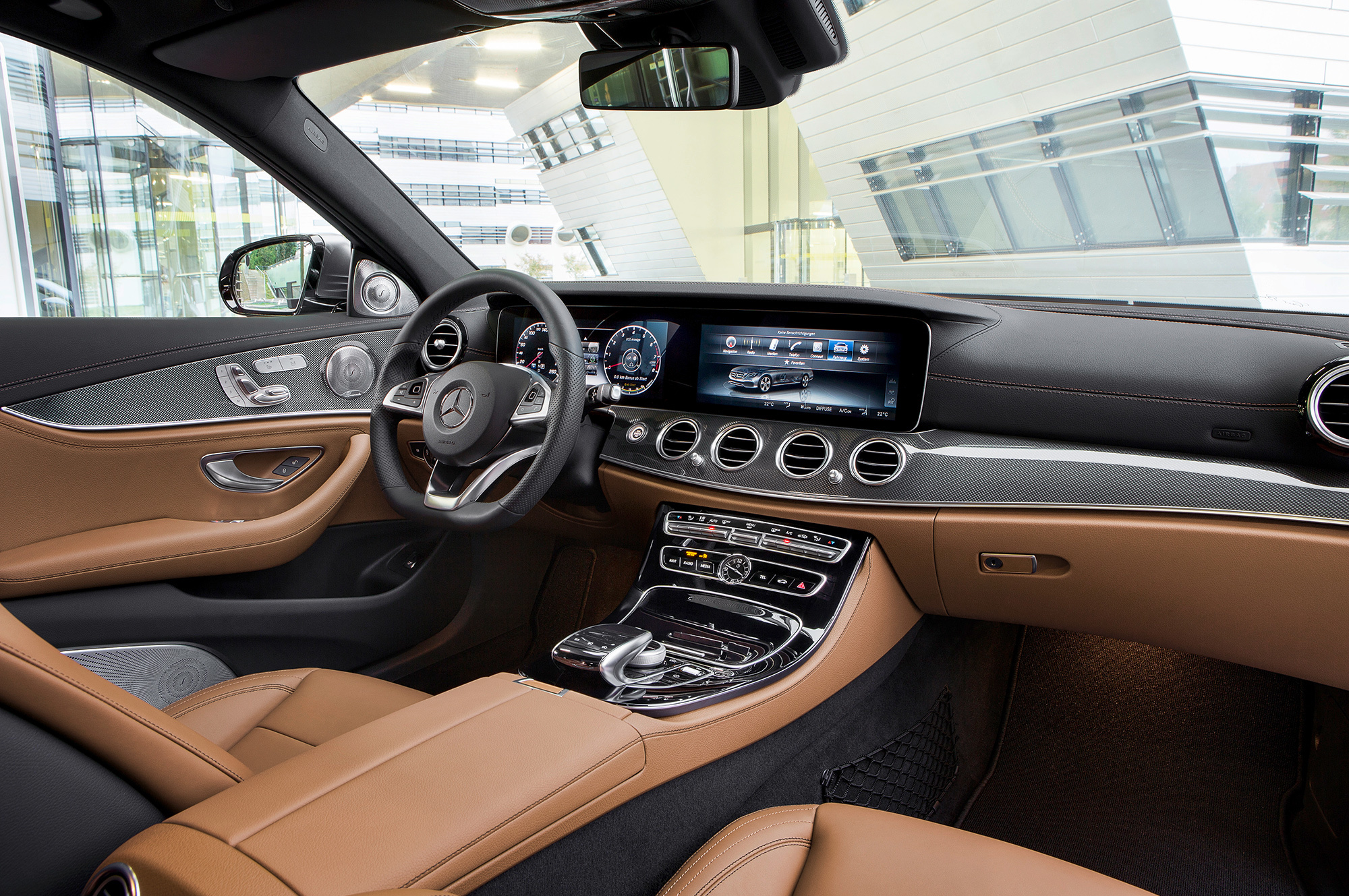 Среди прочего на Е-классе появился помощник смены полосы Active Lane-change Assistant. Водитель задаёт желаемый ряд движением рычажка указателя поворота, а легковушка выполняет манёвр при условии, что соседняя полоса свободна. Парковать новый Е-класс можно со смартфона. Внедрена здесь и технология связи с соседними машинами Car-to-X, позволяющая получать информацию о движении автомобилей, скрытых за поворотом, и передавать друг другу предупреждения об опасности. Система Pre-Safe Sound перед самым столкновением издаёт громкий звук, готовящий слух пассажиров к удару.