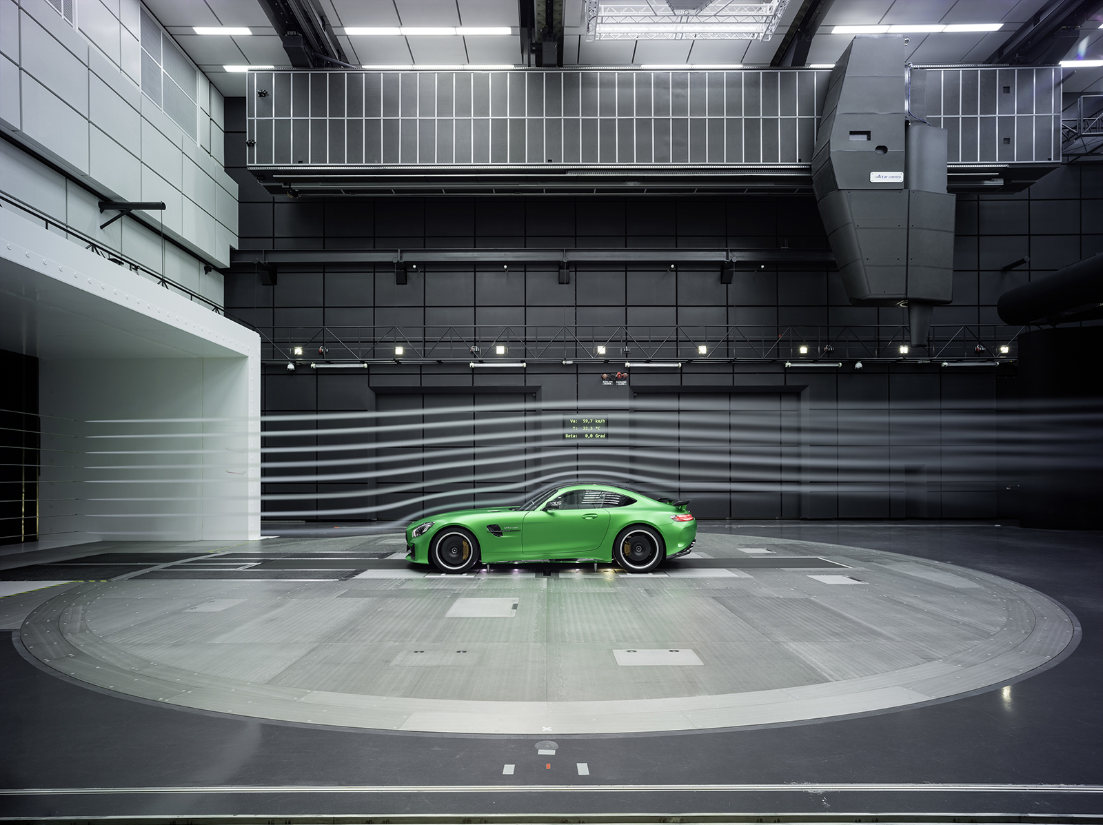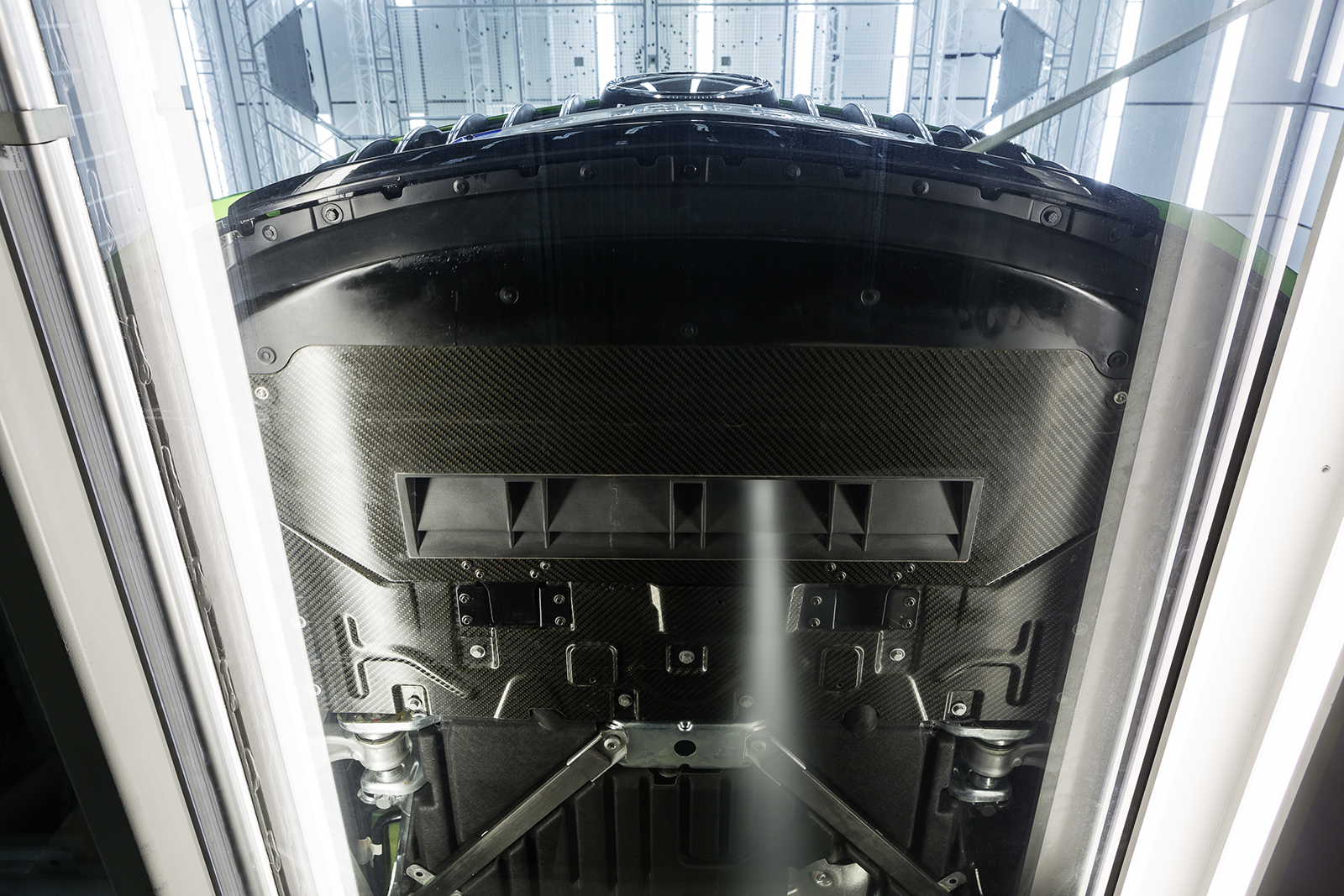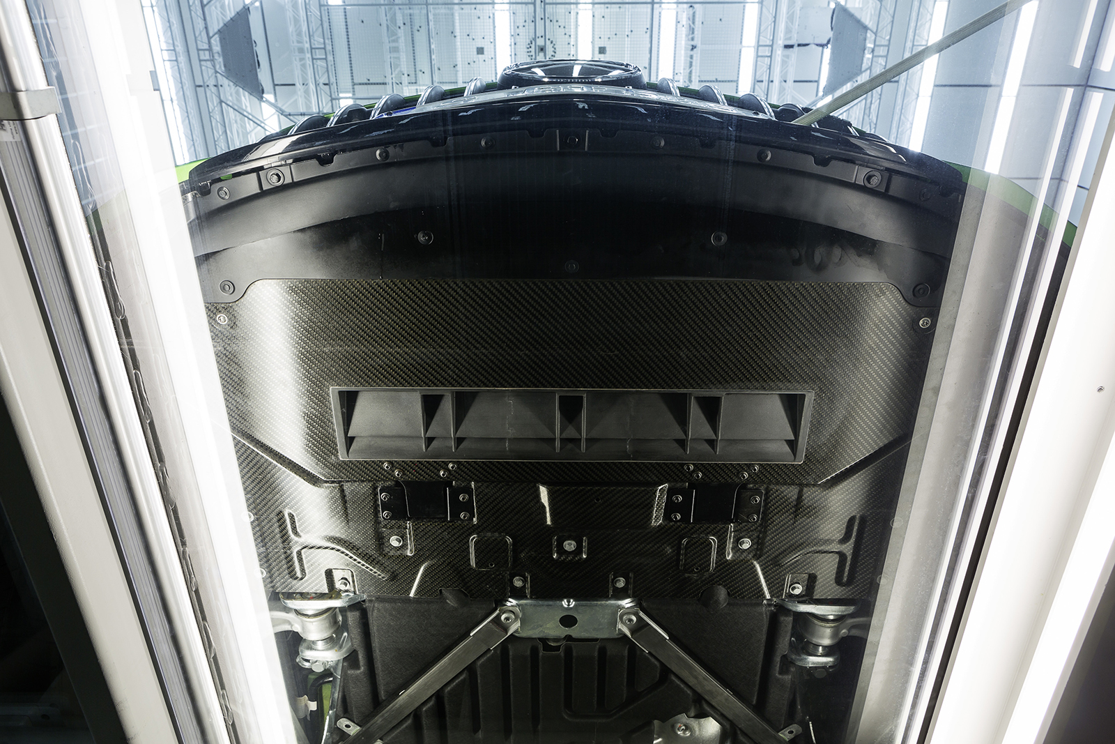 Удивительно, но оптимизация потоков вокруг машины позволила добиться меньшего коэффициента сопротивления воздуху, чем у исходной модели. Это притом, что и передние, и задние крылья были расширены (на 46 и 57 мм соответственно). Шины, Michelin Pilot Sport Cup 2, — тоже шире обычных (275/35 R19 спереди и 325/30 R20 сзади). Одно из важных новшеств в этом плане — активный аэродинамический углепластиковый элемент под моторным отсеком, опускающийся на 40 мм в гоночном режиме при скорости более 80 км/ч. Он увеличивает разрежение под днищем. За передним бампером появились моторизованные вертикальные жалюзи, направляющие потоки воздуха так, чтобы сокращать сопротивление и опять же повышать прижимную силу. При необходимости ускоренного охлаждения радиаторов они поворачиваются.