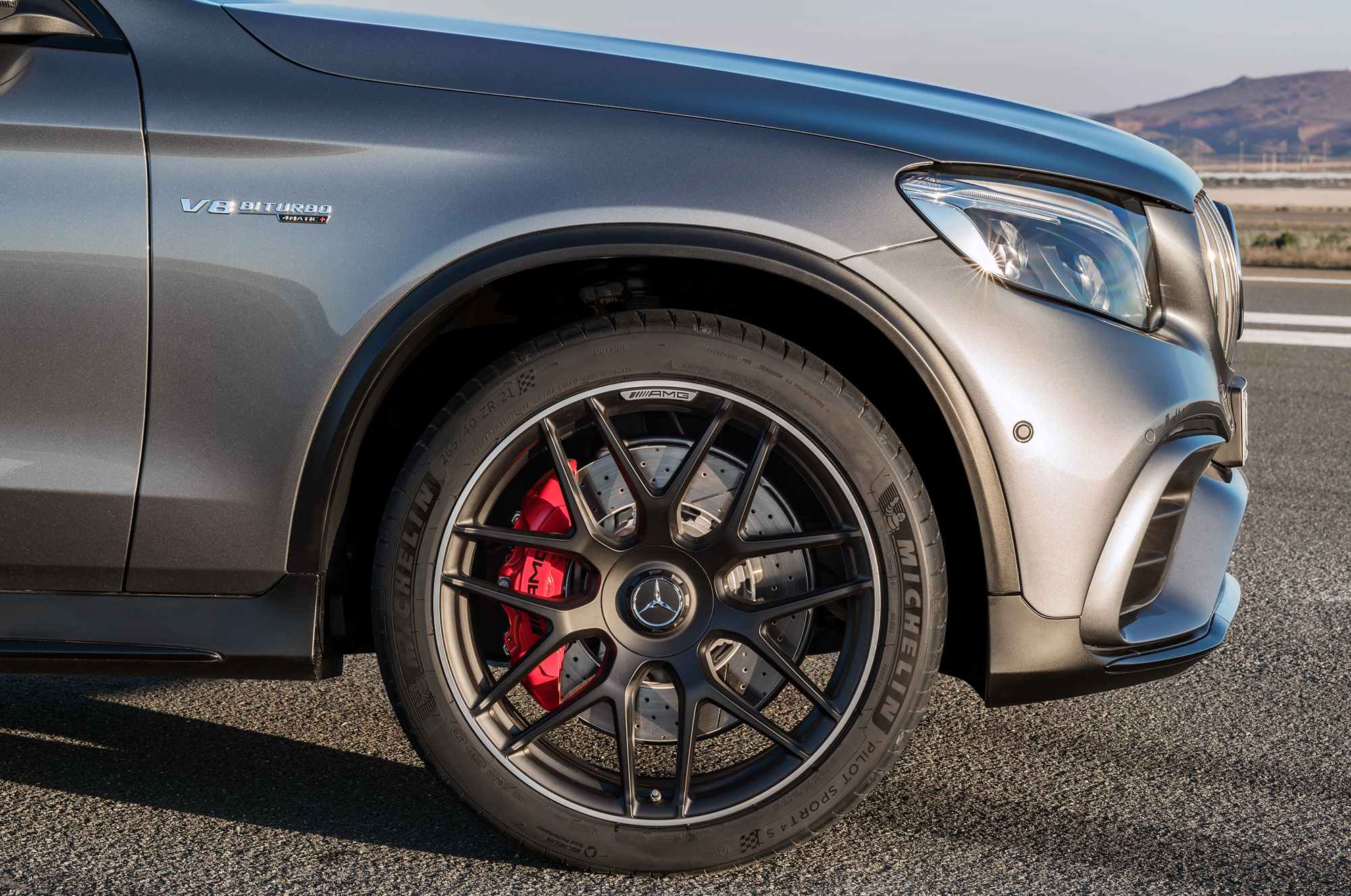 Любому GLC 63 положены трёхрежимные адаптивные амортизаторы с независимой регулировкой на сжатие и отбой и многокамерная пневмоподвеска с тем же количеством преднастроек, откалиброванные в сторону более плотного хода. Кроме того, инженеры пересмотрели эластокинематику передней подвески и установили иные поворотные кулаки, а сзади повысили жёсткость креплений элементов многорычажки, оптимизировали геометрию, расширили колею и увеличили угол развала задних колёс. Также доработано рулевое управление с электромеханическим усилителем и его переменной производительностью в зависимости от выбранного режима движения и скорости.