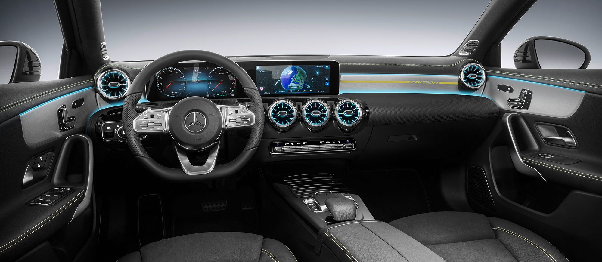 Не всем пришлась по вкусу новая тенденция, появившаяся с седаном W222, но нельзя отрицать тот факт, что новый A-класс отныне внутри смотрится намного дороже предшественника. Немцы переделали чуть ли не всё. Слоёная передняя панель стала строже, но её удачно разбавляют металлизированные кругляши воздуховодов климатической установки с контурной подсветкой. Больше стало пространства (по сравнению с уходящей моделью): в районе плеч на первом и втором рядах прибавка составляет 9 и 22 мм, на уровне локтей ― 35 и 36 мм соответственно, над головами — семь и восемь миллиметров (спереди и сзади).