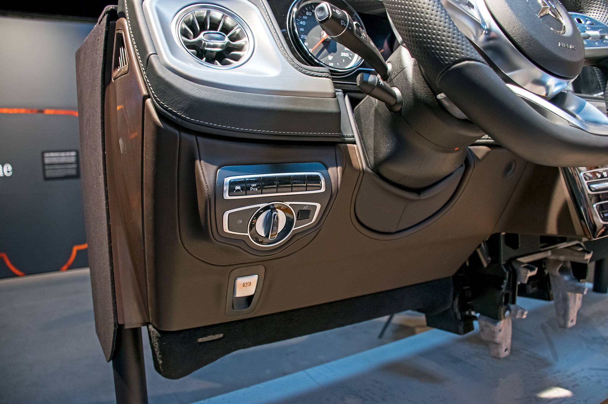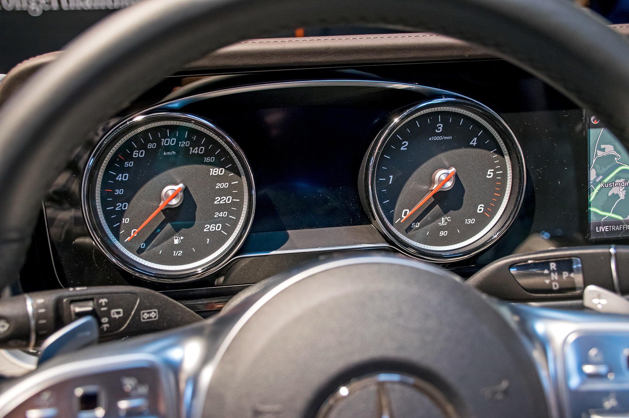 От архаики не осталось и следа. Ни убого пластика по бокам сидений, ни ужасного бардачка, ни грубых дефлекторов. Всё аккуратно и качественно. Многие клавиши знакомы по современным Мерседесам. Джойстик трансмиссии — на рулевой колонке. Для олдскульщиков базовые приборы остались аналоговыми. Привычные планшеты вписались в интерьер неплохо, но рисунок циферблатов без изменений — как у Е-класса. Кнопка понижающей передачи скромно притаилась справа от привычного клюва-тачпада.