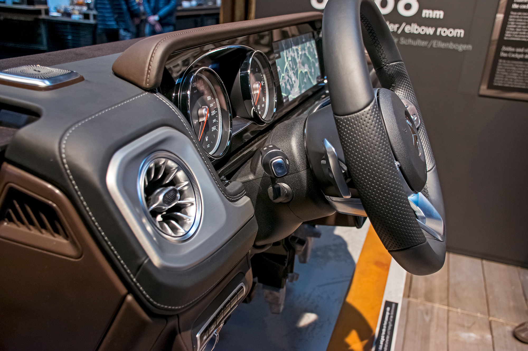 В салон по-прежнему забираешься, хватаясь за руль, — поручень на стойке так и не появился. Роскошные мультиконтурные кресла позаимствованы у Е-класса. Высота посадки и наклон лобового стекла почти не изменились, зато в плечах и в коленях будто стало шире сантиметров на десять, хотя официально — всего на четыре. Теперь не нужно неестественно сильно сгибать правую ногу, чтобы пользоваться педалями. После этого интерьер нынешнего G-вагена кажется ущербно узким и неуютным.