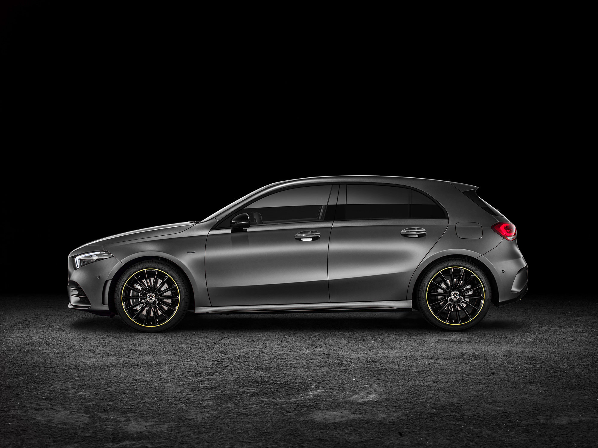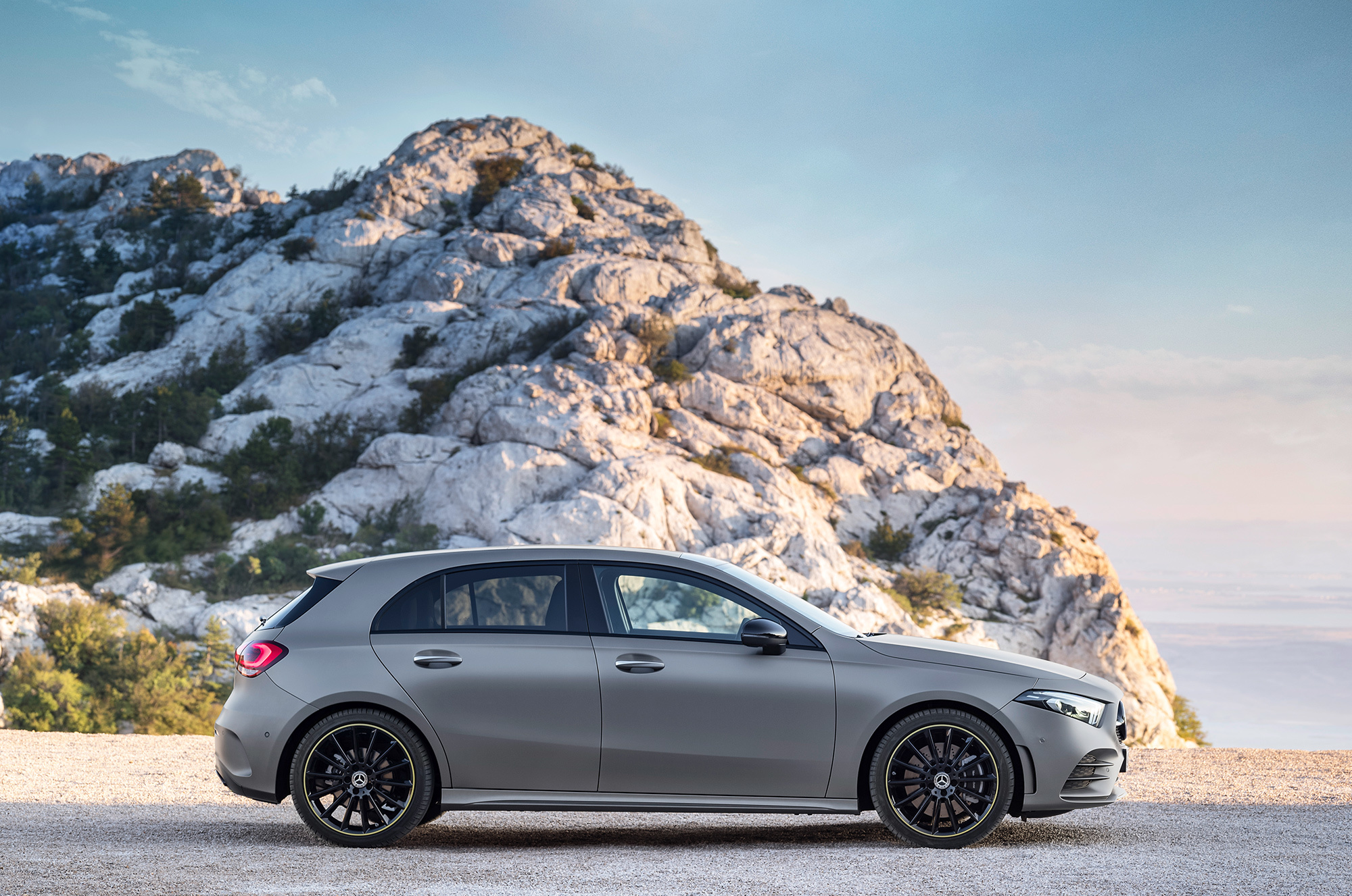 Колёсная база растянута на 30 мм, в длине А-класс прибавил 127 мм, передняя колея расширилась на 14 мм — и у машины наконец-то появилась статная осанка. Коэффициент аэродинамического сопротивления снизился с 0,27 до 0,25. В арках — более крупные колёса диаметром от 16 до 19 дюймов, на дюйм больше, чем раньше.