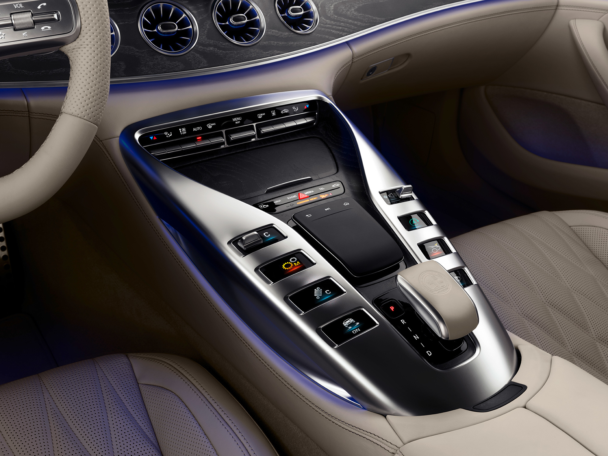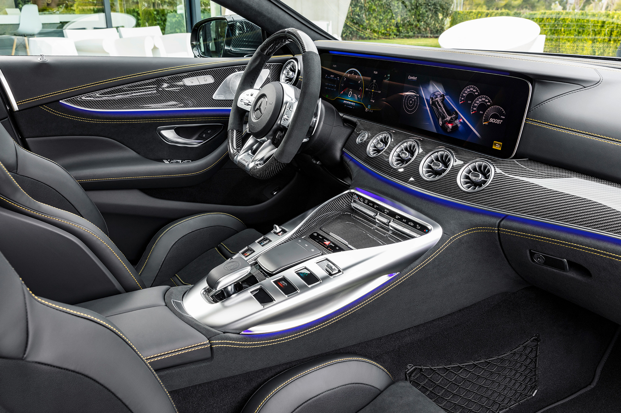 А самый быстрый в линейке ― Mercedes-AMG GT 63 S с электронноуправляемой блокировкой и дрифт-режимом трансмиссии, доступными в базовом оснащении. У топ-версии тот же двухнаддувный четырёхлитровый V8, но с активными гидроопорами (опция для обычного «шестьдесят третьего»). И форсирован он до 639 л.с. и 900 ньютон-метров. Время разгона до сотни составляет всего 3,2 с при максимальной скорости 315 км/ч. Тут даже Panamera Turbo S E-Hybrid (680 сил, 850 Н•м) не угонится ― 3,4 с и 310 км/ч соответственно. Правда, бензоэлектрический Porsche заметно тяжелее ― 2310 кг против 2045.