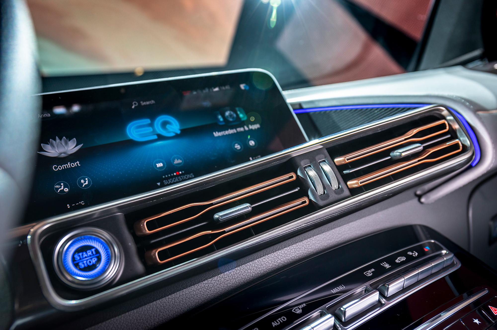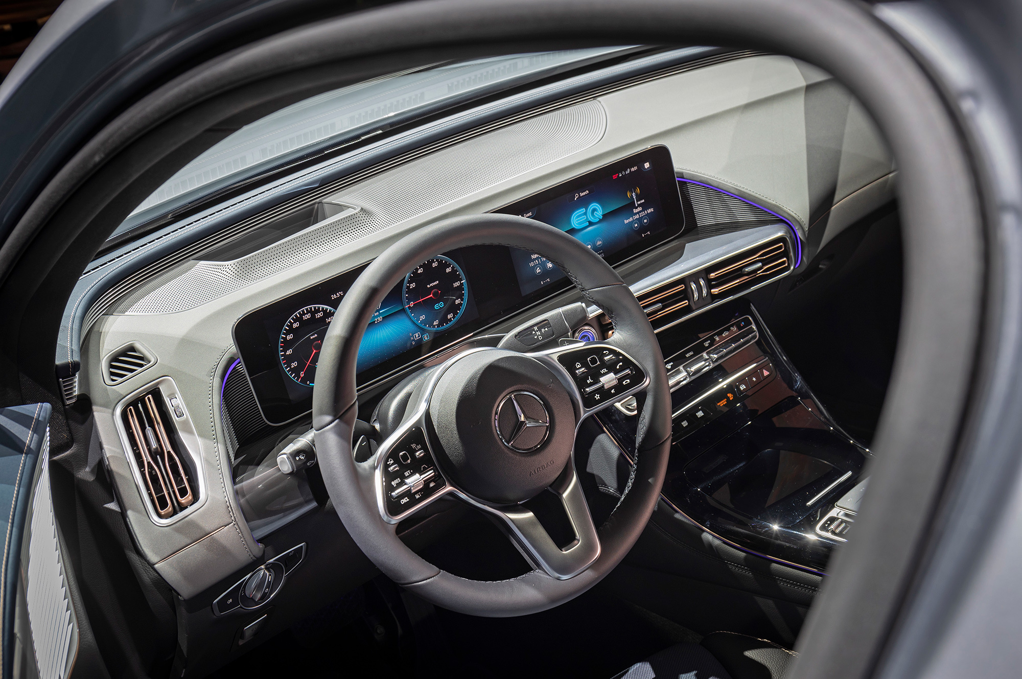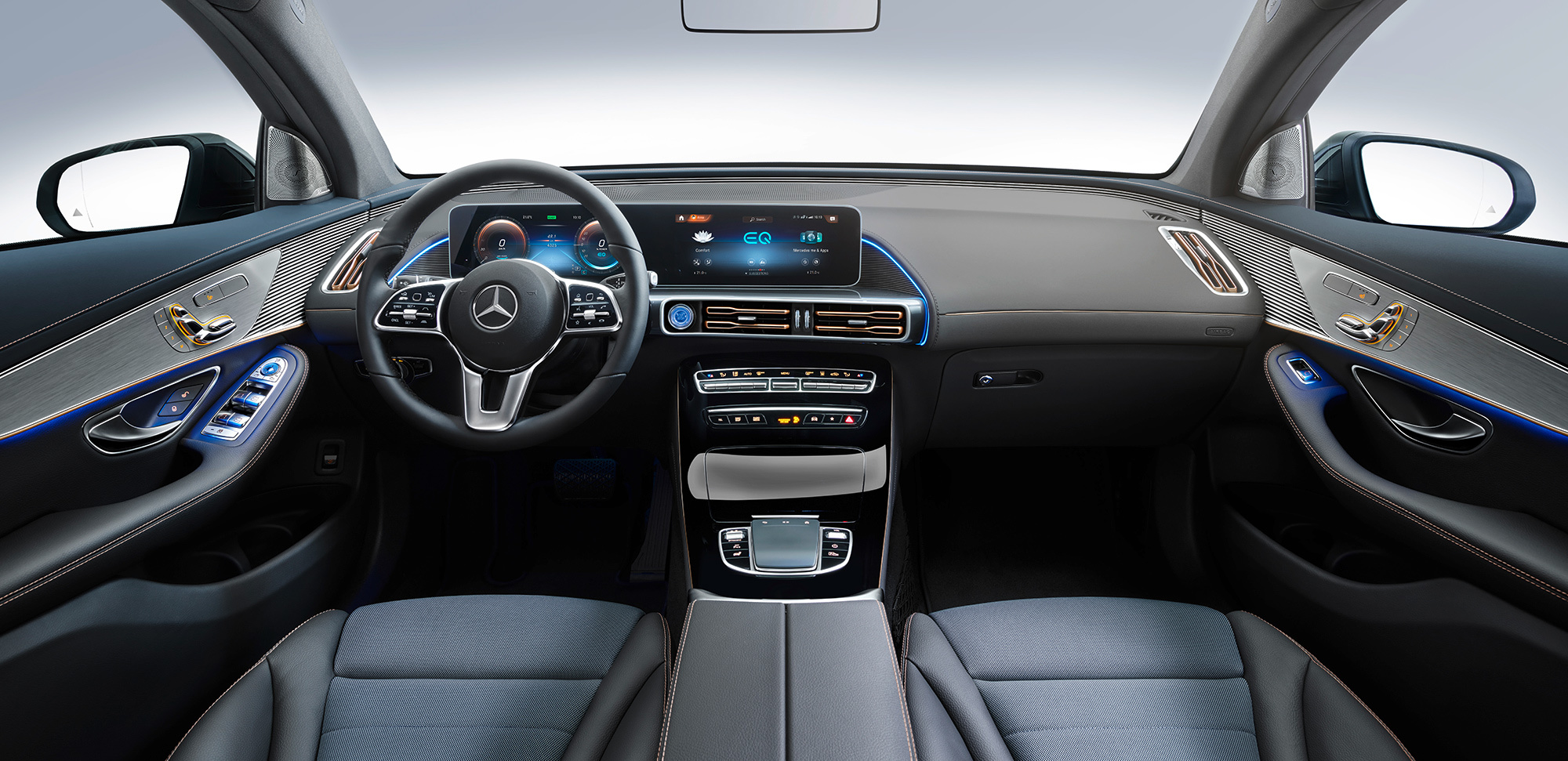 В новый интерфейс MBUX внедрено несколько специфических для суббренда EQ разделов, от оптимизированной под электромобиль навигации до программирования настроек климата ещё до поездки (возможно как из машины, так и через мобильное приложение). Как и в случае с последними моделями Мерседеса, предусмотрено улучшенное голосовое управление.