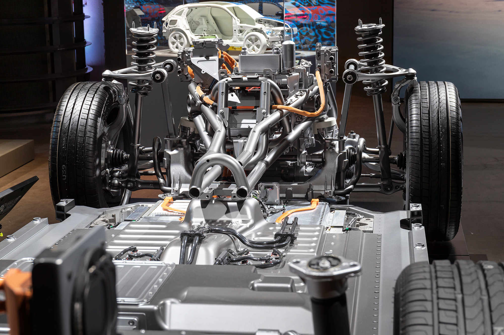 Батарея ёмкостью 80 кВт•ч (на десять выше, чем в шоу-каре) обеспечивает запас хода более чем 450 км по циклу NEDC (этот параметр может быть уточнён ближе к запуску производства). Для максимального подавления любых вибраций силовые модули установлены с помощью резиновых опор на подрамниках, а те на своих резиновых опорах уже крепятся к кузову.