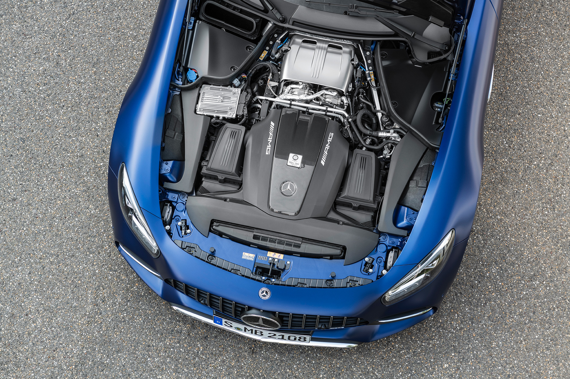 Отдача битурбовосьмёрки 4.0 при нынешнем обновлении семейства не поменялась. На исходных купе и родстере AMG GT она выдаёт 476 л.с. и 630 Н•м, на AMG GT S — 522 л.с. и 670 Н•м, на AMG GT C — 557 л.с. и 680 Н•м, а на топовых спорткарах AMG GT R/GT R Pro — 585 л.с. и 700 Н•м. При этом серийному родстеру по-прежнему доступны только первые три уровня мощности. Задуманная было версия AMG GT R Roadster, которая даже тестировалась, в каталог модели так и не была добавлена.