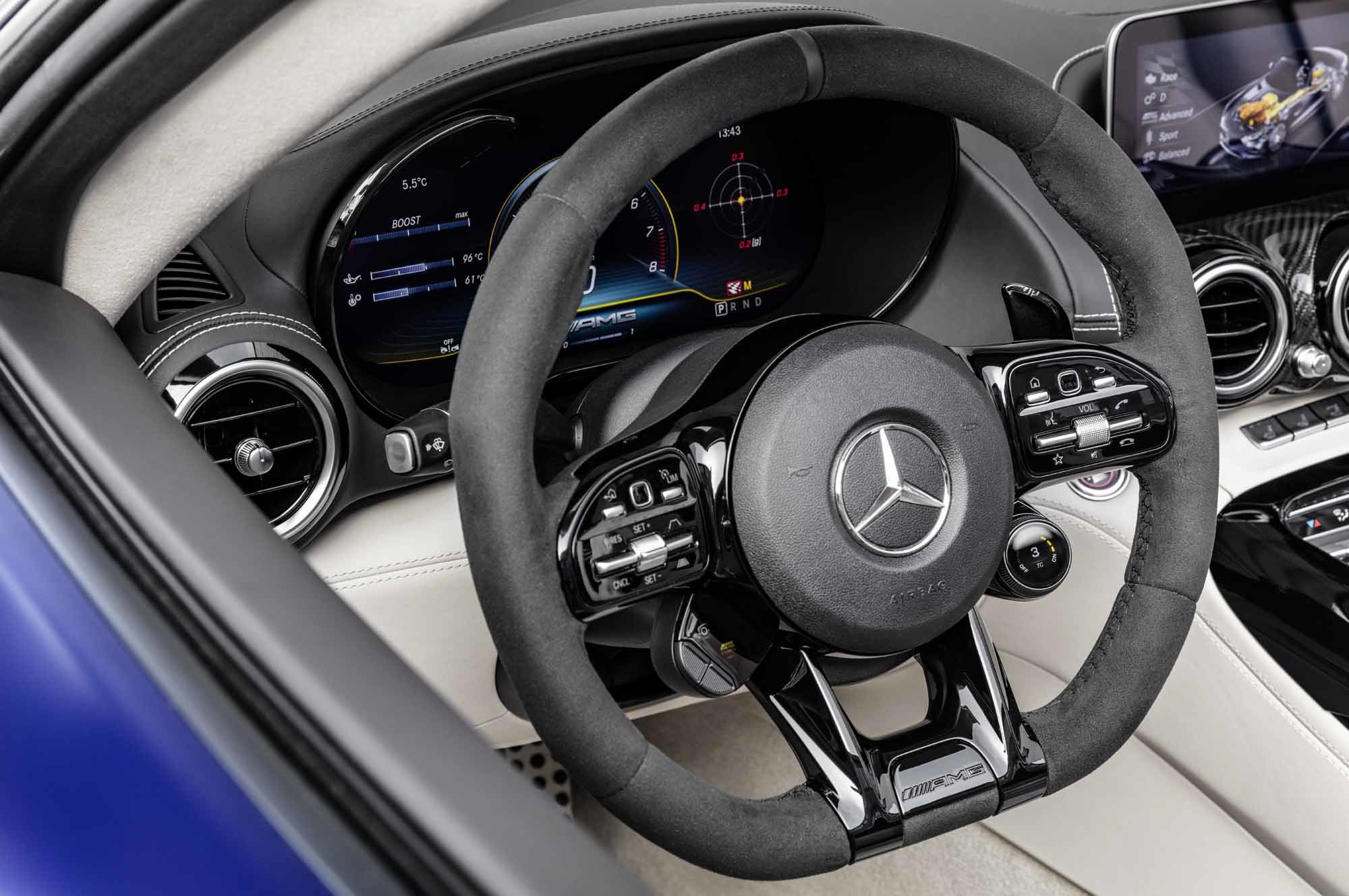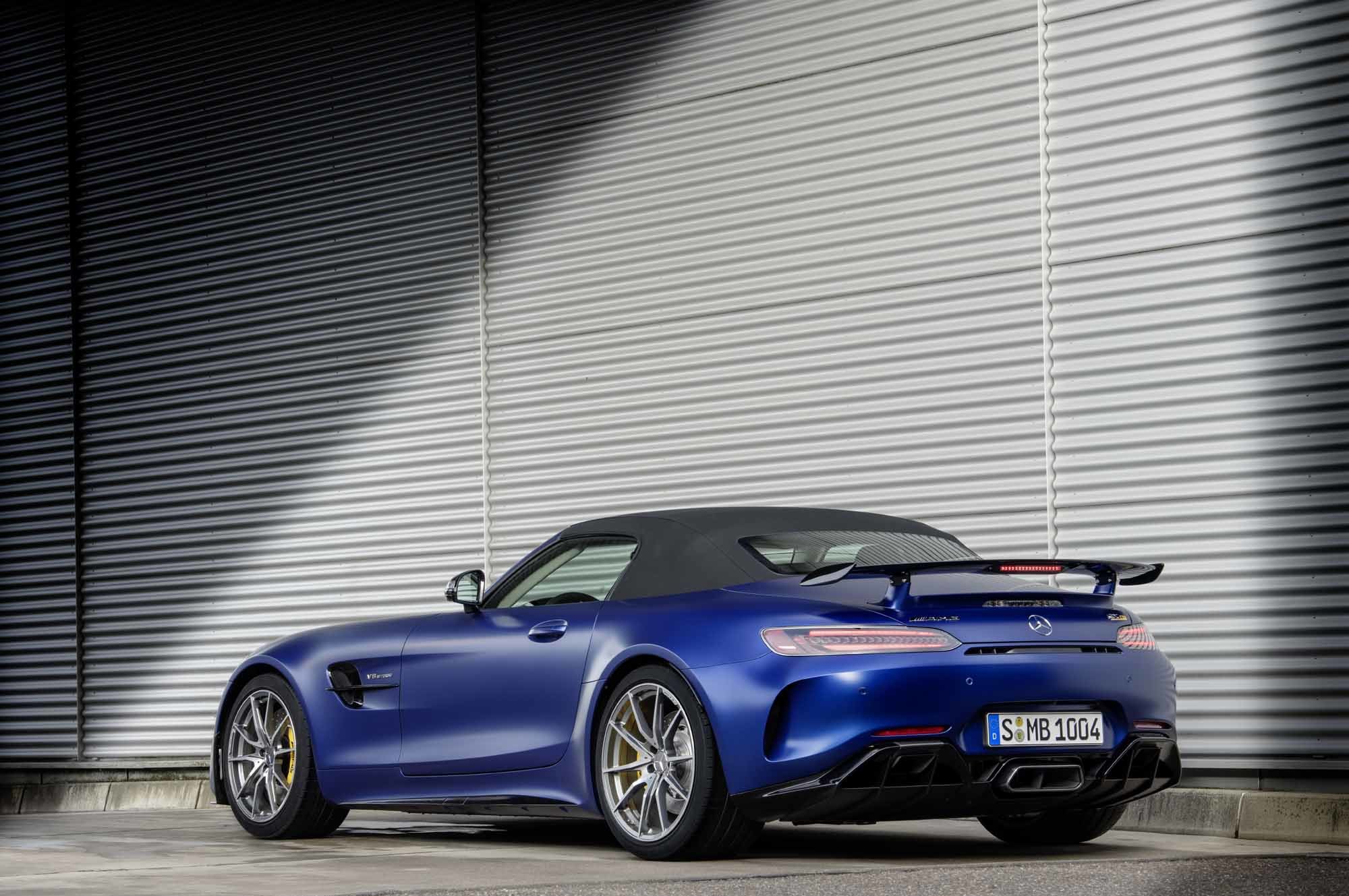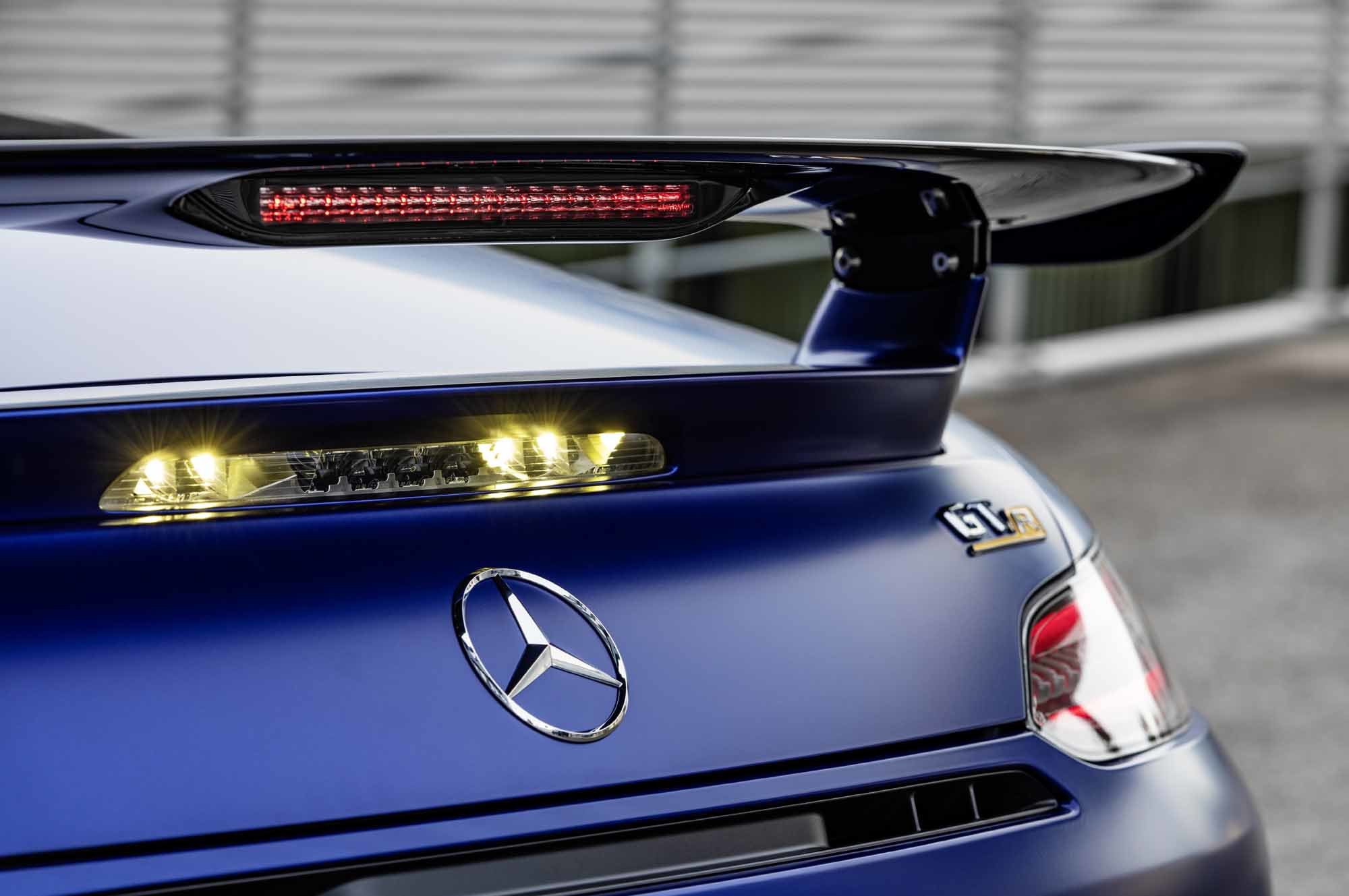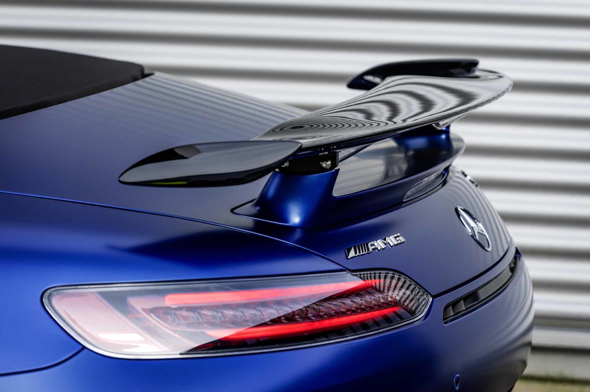 У родстера AMG GT R передние и задние крылья шире, чем у простых собратьев GT и GT S. Это не только дизайнерский приём, но и необходимость, ведь тут шире колея и более широкие шины (275/35 R19 спереди и 325/30 R20 сзади, Michelin Pilot Sport Cup 2). Сзади не только появилось регулируемое вручную антикрыло, но и были перекроены бампер, диффузор, выпускные патрубки. Изменения направлены и на создание дополнительной прижимной силы, и на отвод горячего воздуха от глушителя.