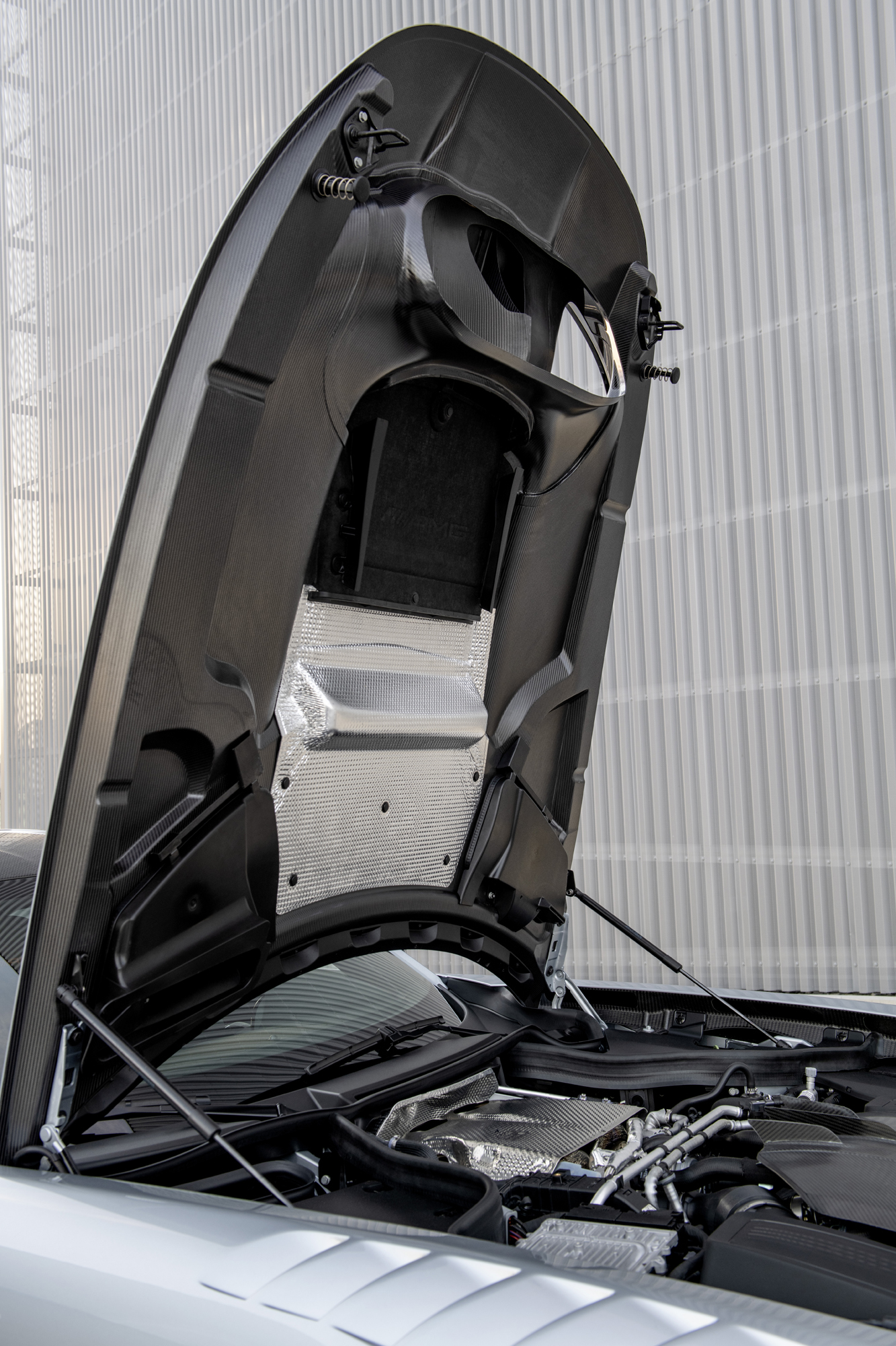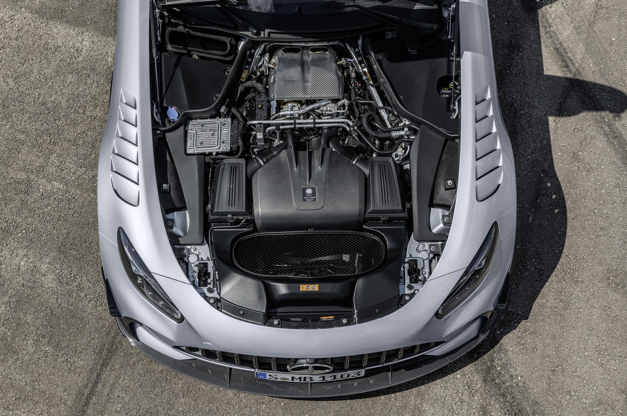 Установленные турбокомпрессоры типа twin scroll с подшипниками качения щеголяют более крупным компрессорным колесом, чем в исходнике. Суммарно они прокачивают до 1100 кг воздуха в час против 900 кг на AMG GT R. Мотор также получил крупные интеркулеры, иные распределительные валы и выпускные коллекторы, нежели на обычных M178.