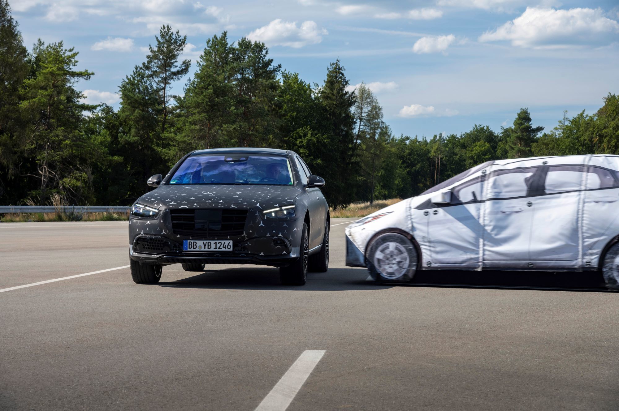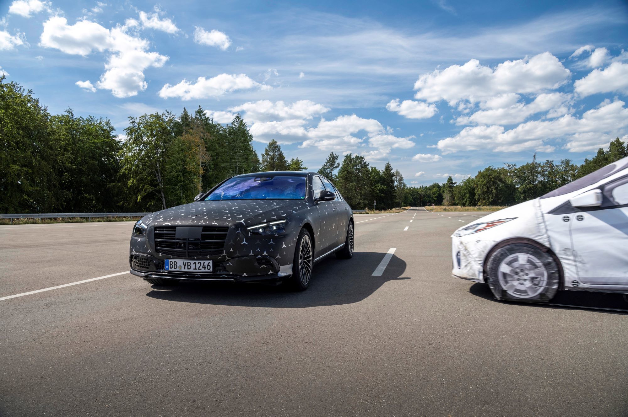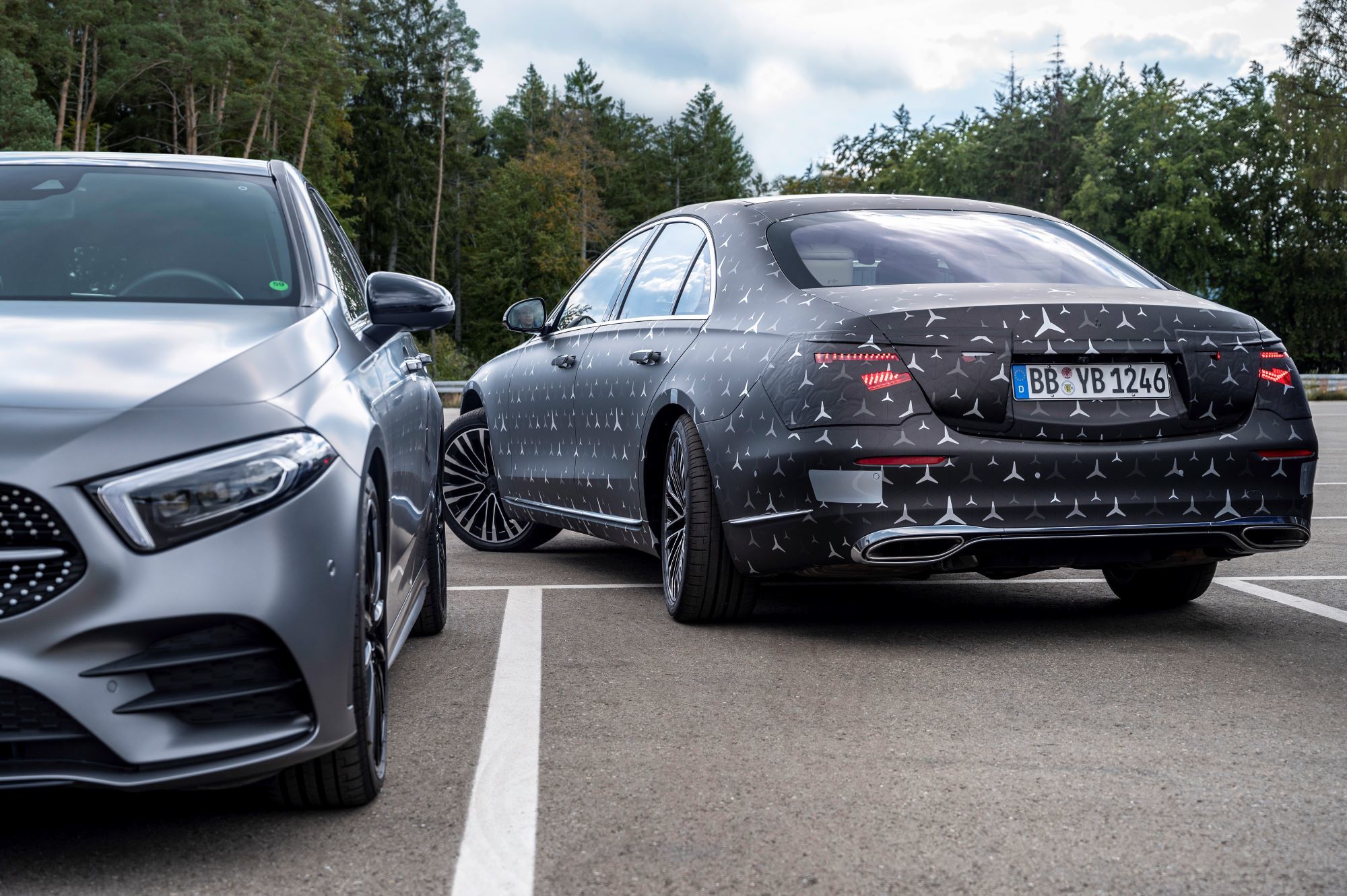Как и внедорожники Mercedes GLE и GLS, «эска» обзаведётся активной гидропневматической подвеской E-Active Body Control, работающей от 48-вольтовой бортовой сети. Она способна контролировать степень упругости пружин и сопротивление амортизаторов на каждом колесе по отдельности, потому лучше противостоит неровностям, кренам и клевкам, а также может приподнять кузов перед боковым ударом (привет, A8!). А вот реальная инновация в индустрии — фронтальные подушки безопасности для пассажиров второго ряда, зашитые в спинки передних кресел. Плюс для «эски» подготовят ещё и эйрбэг между сиденьями первого ряда, не дающий седокам удариться головами.
