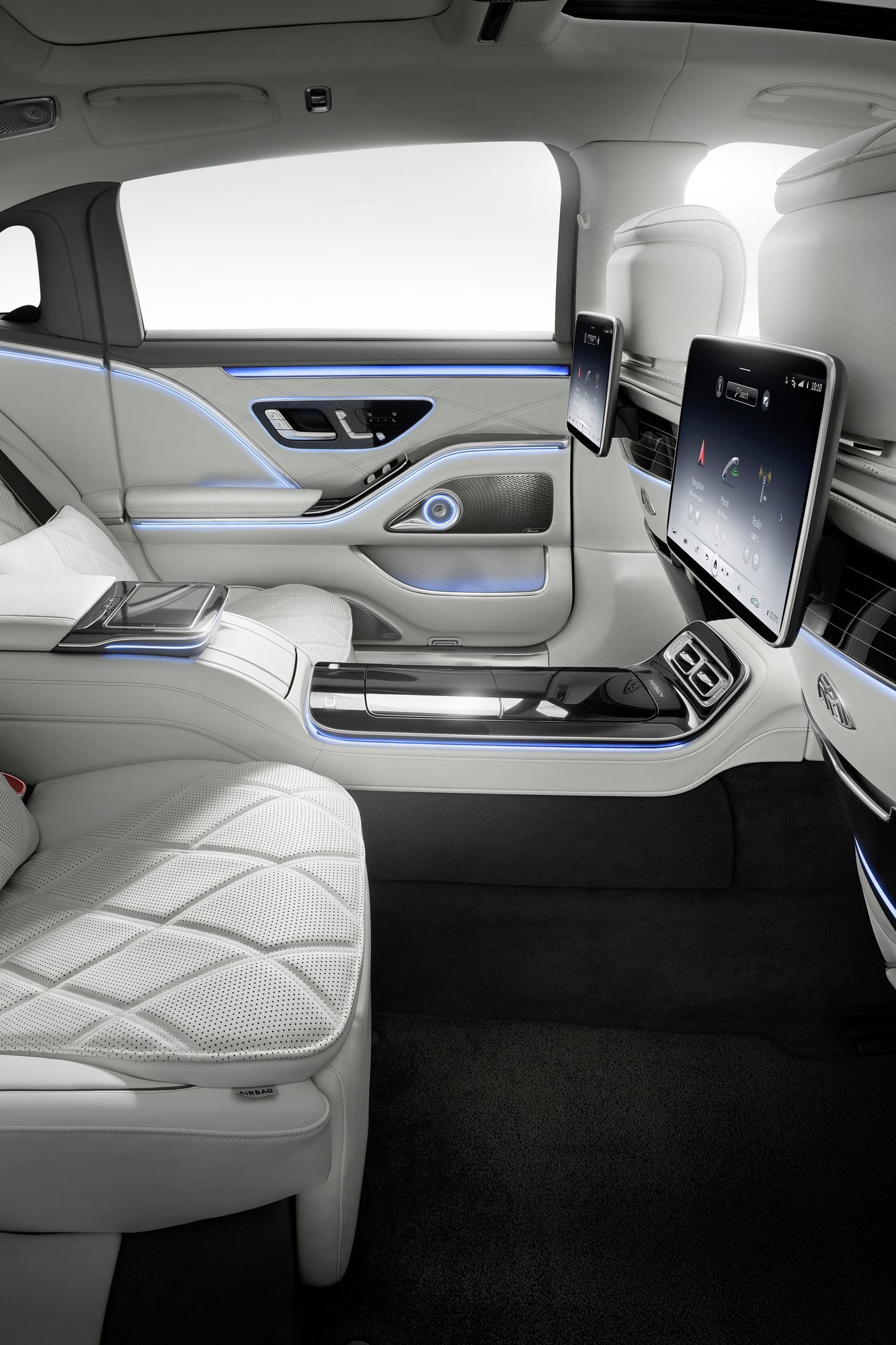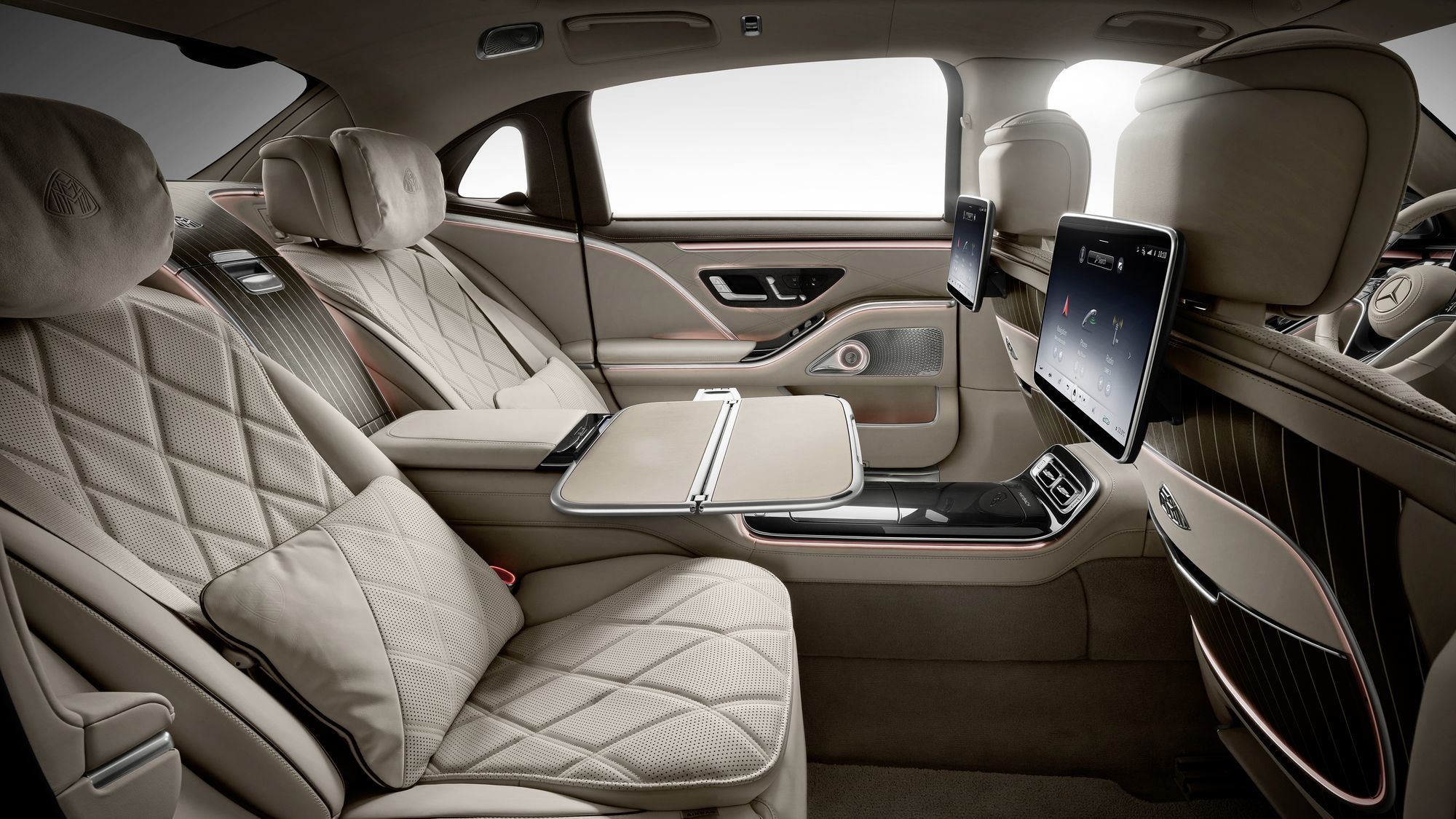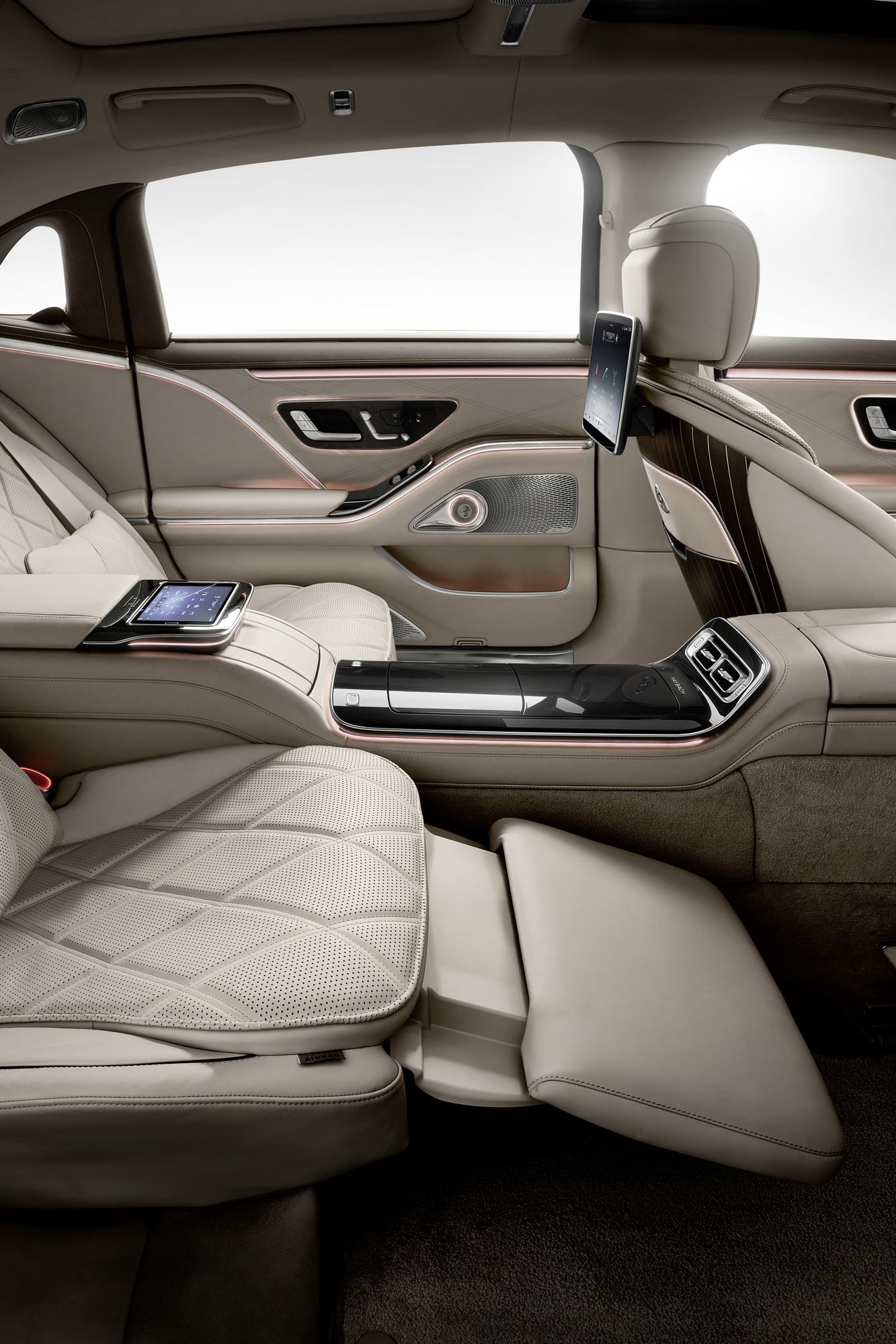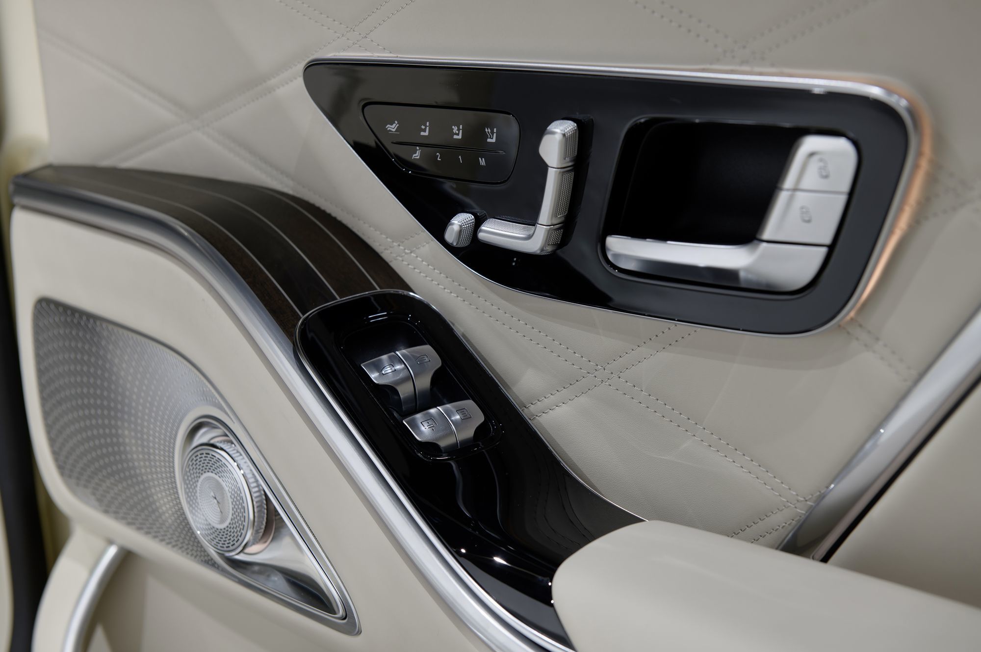 При опции First-Class в машине появляется несколько примечательных деталей на втором ряду вроде двойных подстаканников с функцией нагрева и охлаждения, лотка для заднего планшета управления развлекательной системой MBUX, выдвижных столиков и других приятных мелочей. Опциональный холодильник в заднем подлокотнике регулируется в диапазоне температур от одного до семи градусов. Задние двери повышенной комфортности с электроприводом (опция) открываются и закрываются не менее чем семью способами (в том числе с места водителя, с передних и задних дисплеев, прикосновением к сенсорной ручке). И этот привод блокируется, если система контроля слепых зон видит приближающийся сзади объект.