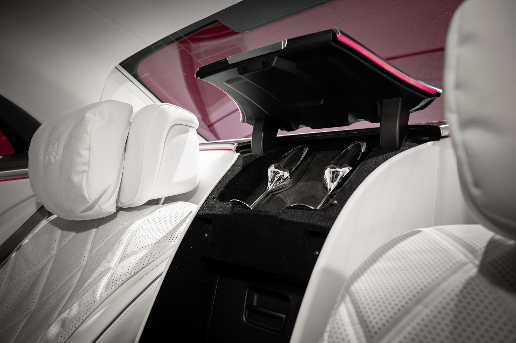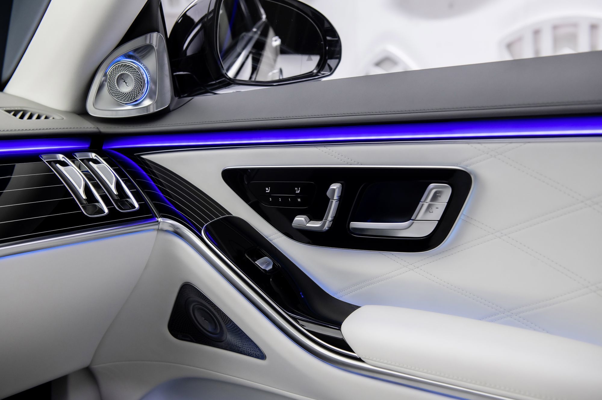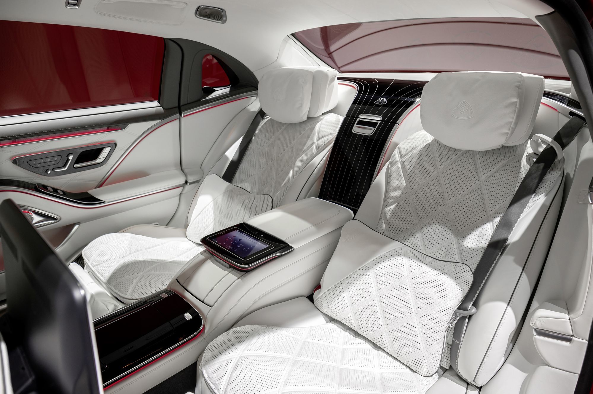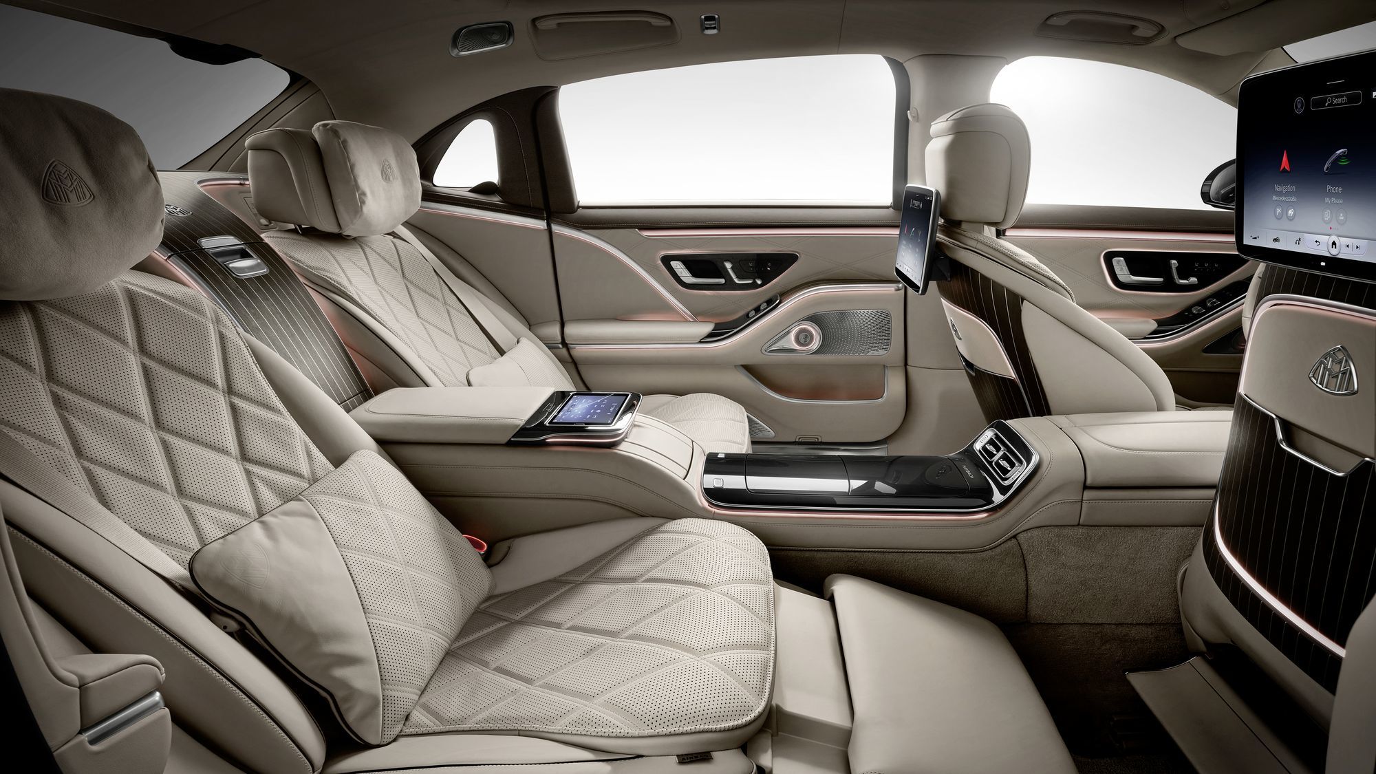При опции First-Class в машине появляется несколько примечательных деталей на втором ряду вроде двойных подстаканников с функцией нагрева и охлаждения, лотка для заднего планшета управления развлекательной системой MBUX, выдвижных столиков и других приятных мелочей. Опциональный холодильник в заднем подлокотнике регулируется в диапазоне температур от одного до семи градусов. Задние двери повышенной комфортности с электроприводом (опция) открываются и закрываются не менее чем семью способами (в том числе с места водителя, с передних и задних дисплеев, прикосновением к сенсорной ручке). И этот привод блокируется, если система контроля слепых зон видит приближающийся сзади объект.