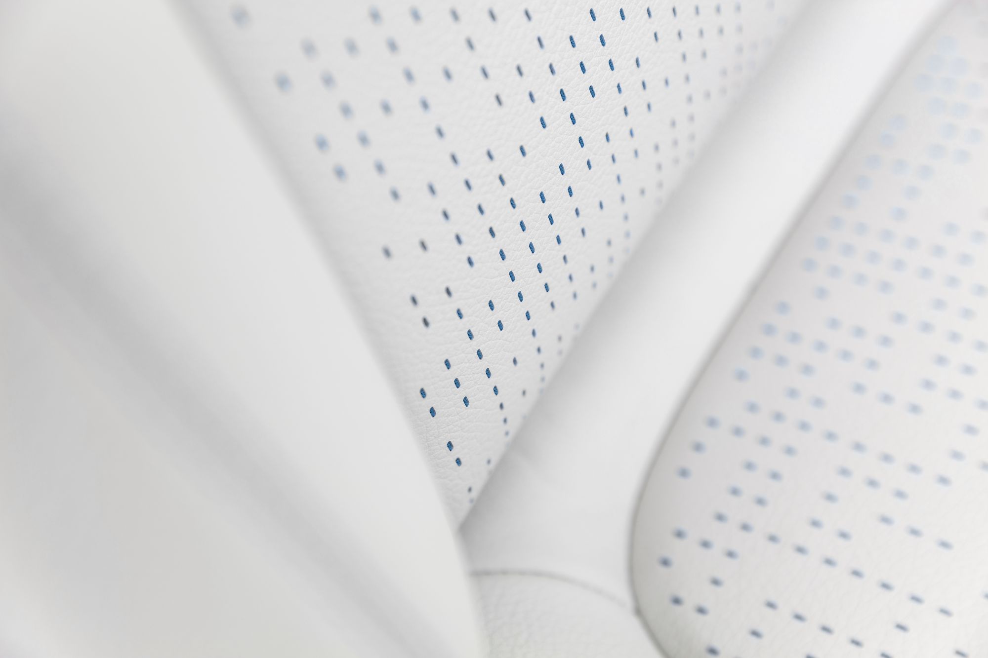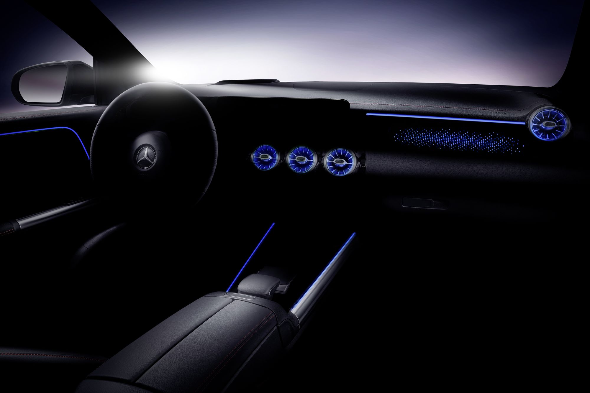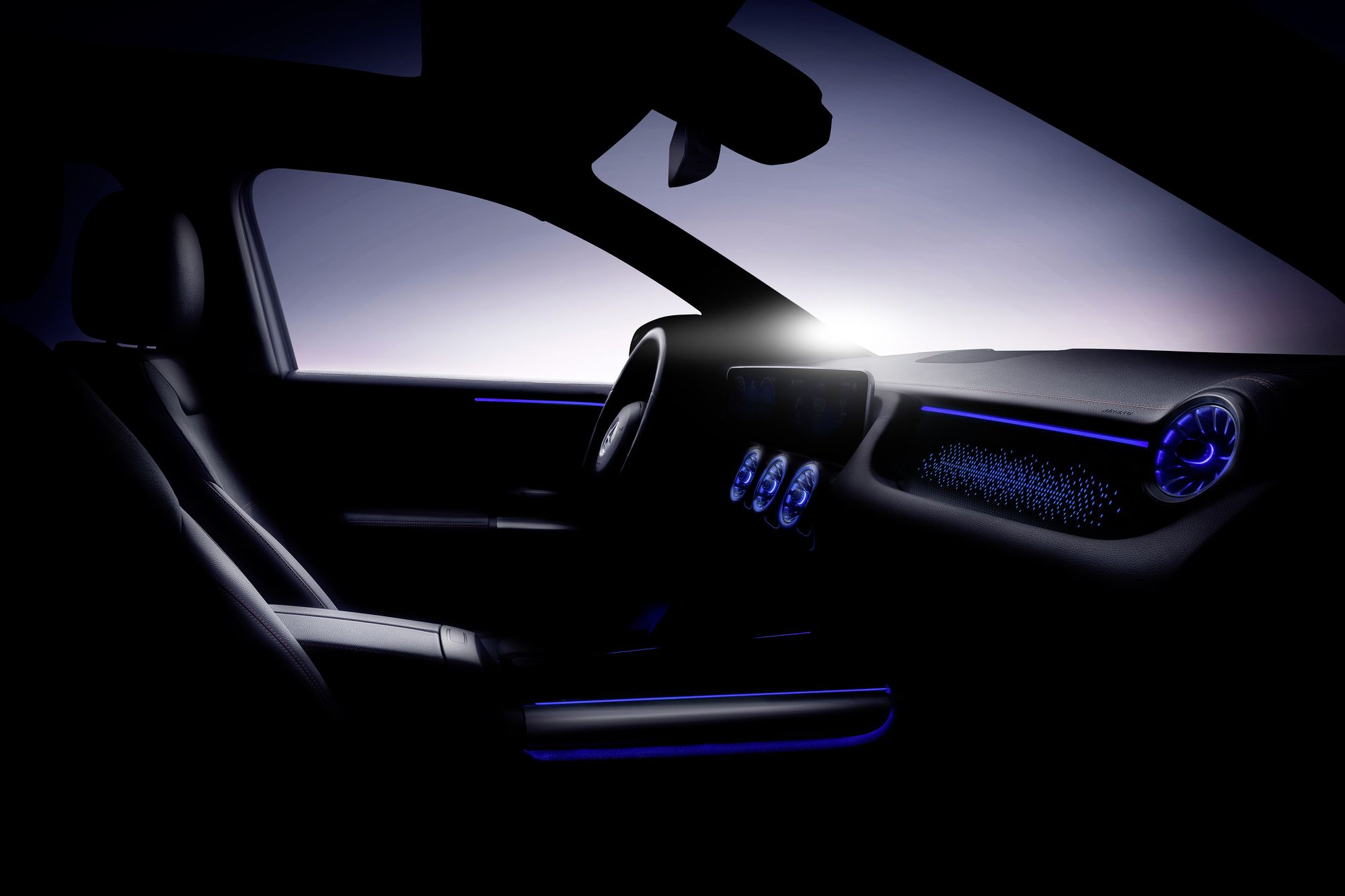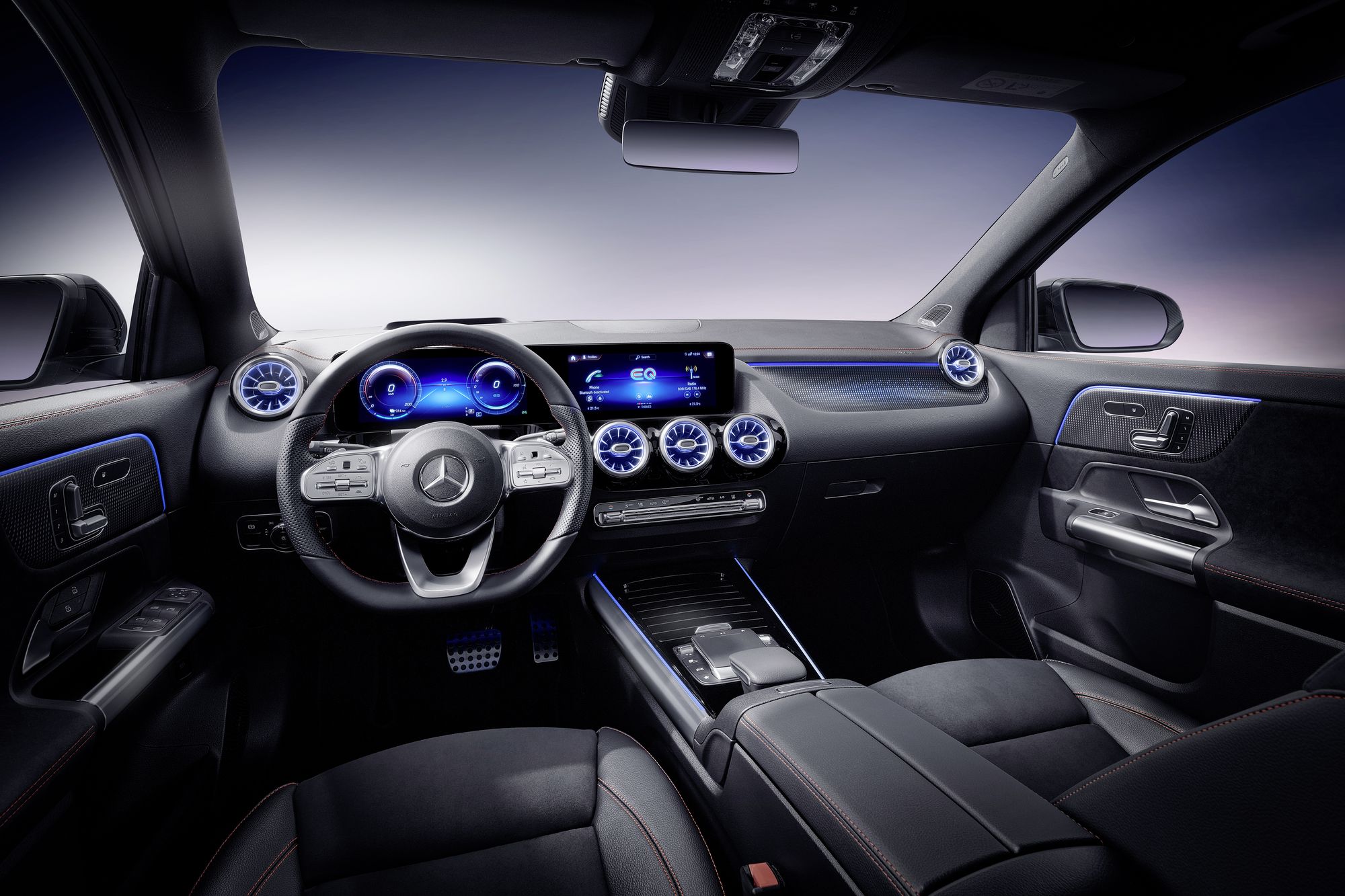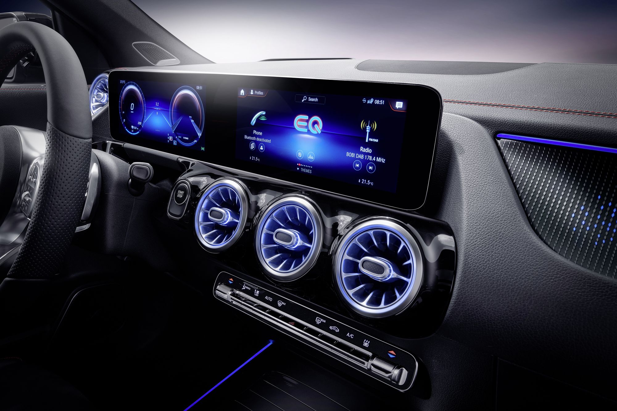 В штатное оснащение электрокара входят адаптивные светодиодные фары, электропривод пятой двери (открывание/закрывание), информационно-развлекательная система MBUX, 18-дюймовые легкосплавные диски, окружающая подсветка на 64 цвета и тепловой насос для минимизации затрат на обогрев салона. В зависимости от комплектации тут также можно увидеть панорамную крышу, специфические для электромобиля декоративные элементы цвета розового золота на дефлекторах вентиляции, сиденьях и ключе. А в исполнении Edition 1 на сиденьях появляется перфорированная кожа, сквозь отверстия которой проглядывает синяя ткань Mercedes-EQ.