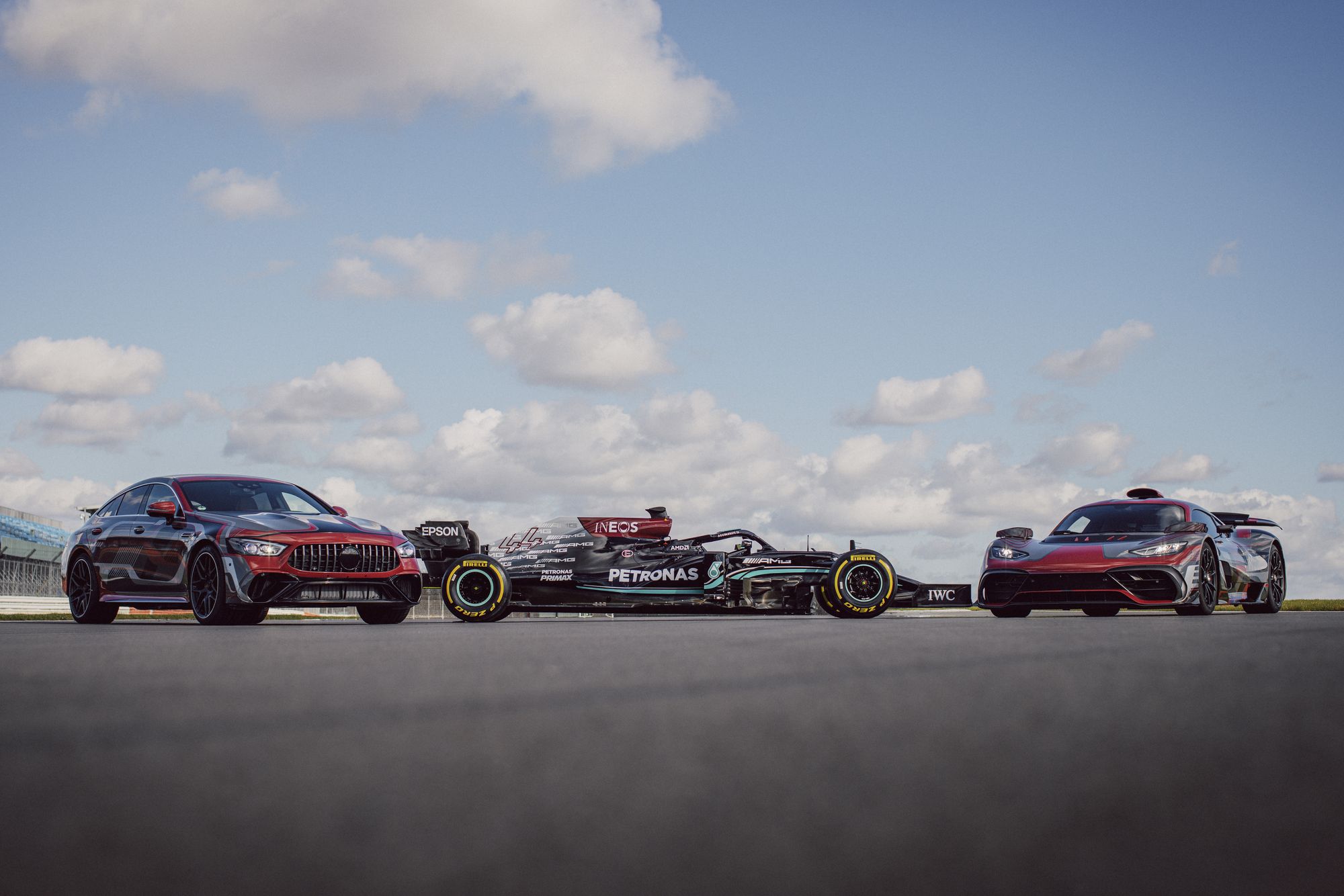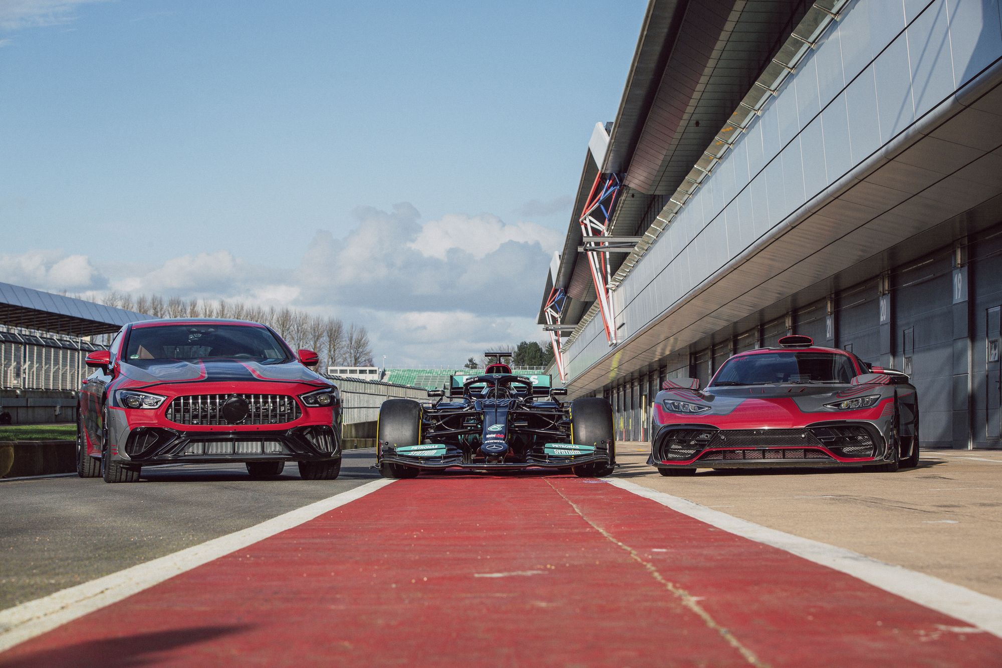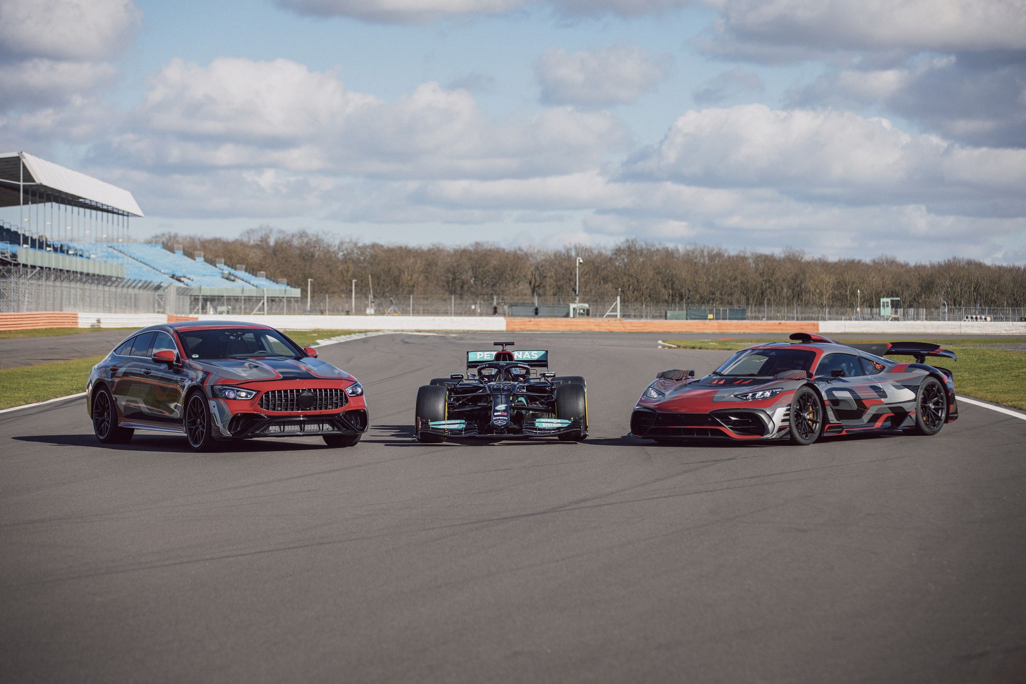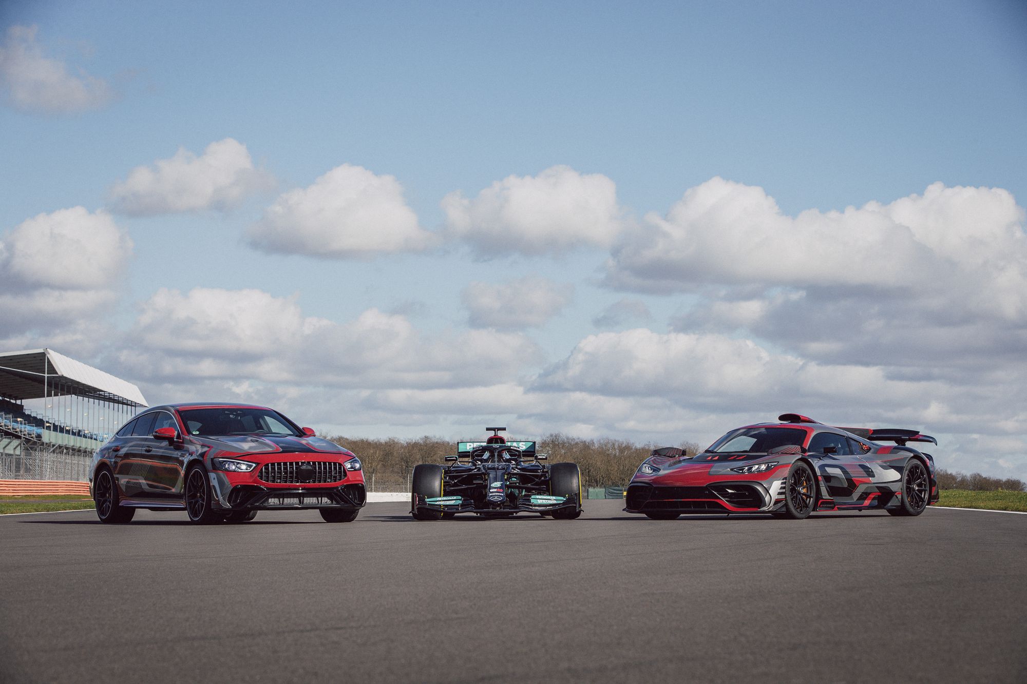 В этом году исполняется девять лет с тех пор, как отделение Mercedes-AMG и автоспортивная команда Mercedes-AMG Petronas F1 начали тесно сотрудничать. Об этом вспомнили на презентации гоночного автомобиля Mercedes-AMG F1 W12 E Performance. Но нас больше интересуют другие участники мероприятия. Это две гражданские модели — предсерийный гиперкар Mercedes-AMG One и пятидверный супергибрид Mercedes-AMG GT, который, скорее всего, получит приставку в названии «73». Последний впервые появился на официальных фотографиях и с минимальным количеством маскировки на кузове.