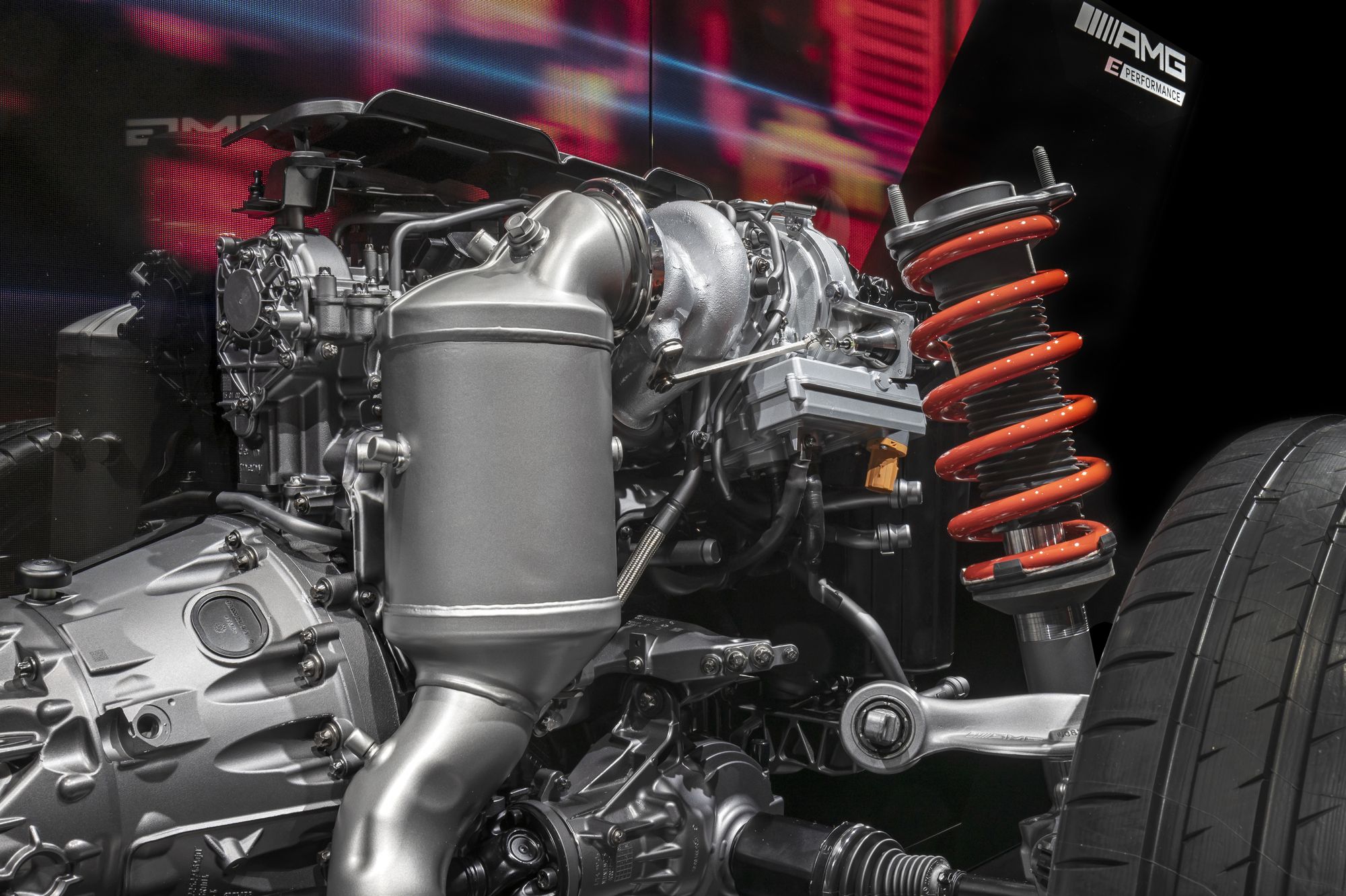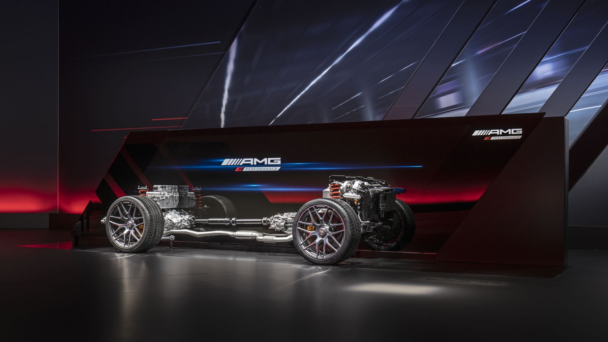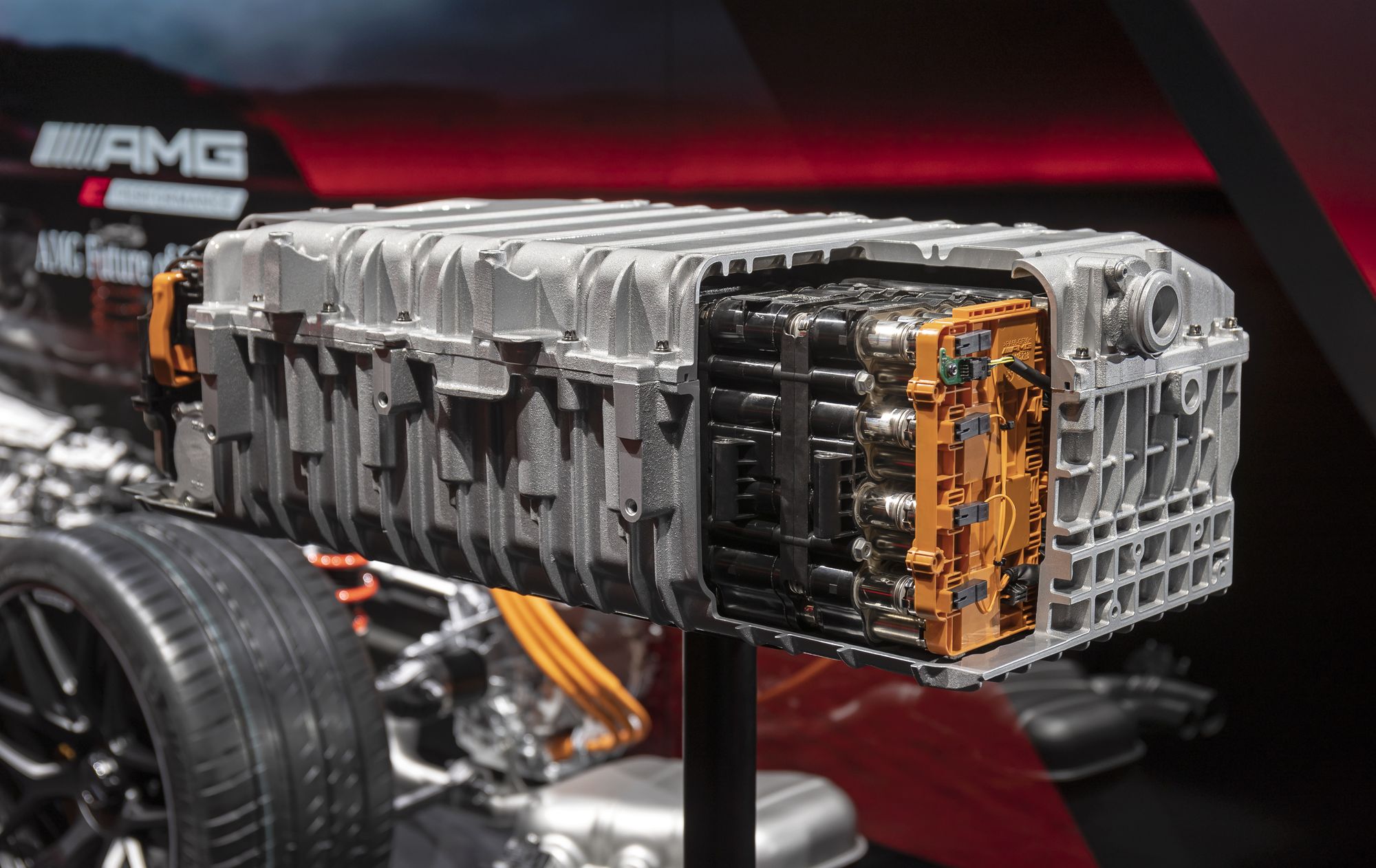 Над электромотором, который по умолчанию приводит задние колёса и никак не связан с девятидиапазонной коробкой передач AMG Speedshift MCT с набором мокрых фрикционов вместо гидротрансформатора, установлена 400-вольтовая тяговая батарея. Она весит 89 кг, а каждая из 560 литий-ионных ячеек получила собственное охлаждение и помещена в отдельную специальную оболочку с толщиной стенок в миллиметр. В блоке аккумуляторов благодаря электрическому насосу циркулирует 14 л охлаждающей жидкости, которая поддерживает оптимальные 45 градусов по Цельсию. Батарея заряжается не только рекуперацией, но и от сети с помощью бортового чарджера на 3,7 кВт.