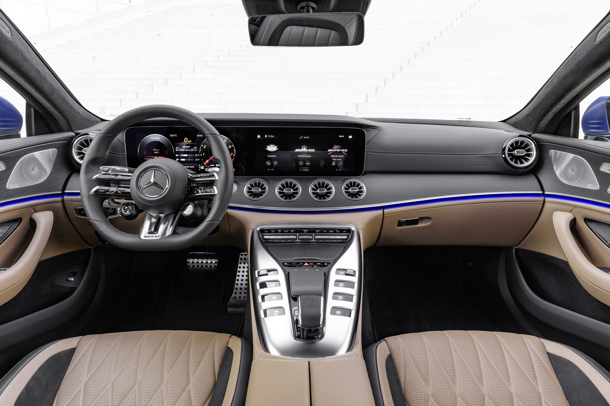 Рулевое колесо AMG Performance со сдвоенными спицами — одно из важных приобретений модели AMG GT как таковой. Стандартным для лифтбека стал широкоэкранный цифровой кокпит с последней версией мультимедийной системы MBUX. В гамму цветов кузова добавлено три новых (Spectral Blue Metallic и матовые Spectral Blue Magno, Cashmere White Magno). Для большей индивидуализации придуман пакет AMG Night Package II (чёрные шильдики и значки, тёмный хром на решётке радиатора).