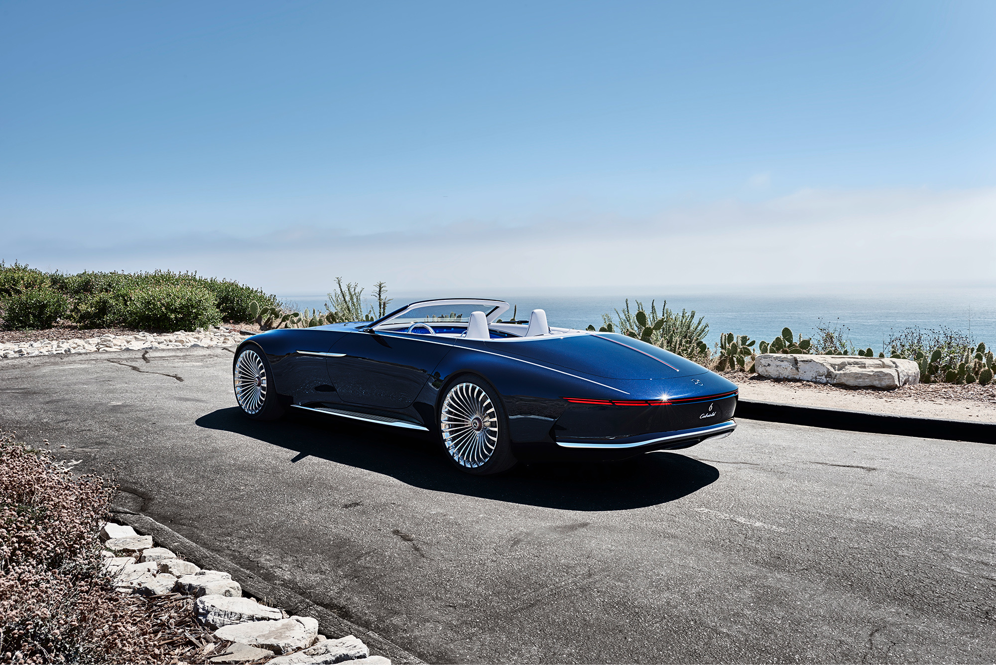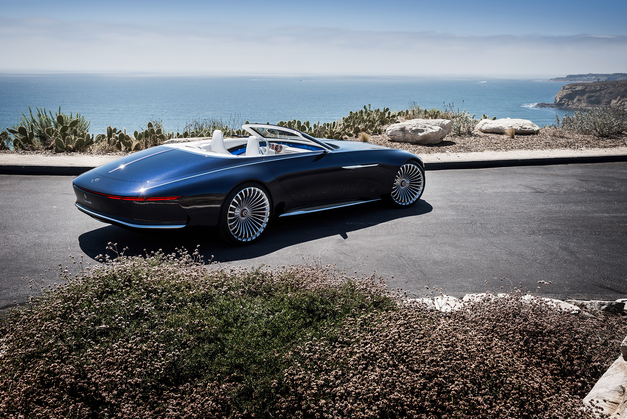 Большой сюрприз от шеф-дизайнера Мерседеса Гордена Вагенера, как мы и предсказывали, оказался кабриолетом на базе прошлогоднего купе Vision Mercedes-Maybach 6. Перед нами снова батарейная машина с четырьмя электромоторами суммарной мощностью 550 кВт (747,8 л.с.). Полноприводник разменивает сотню менее чем за четыре секунды, развивает 250 км/ч (дальше мешает ограничитель скорости) и проезжает без подзарядки 500 км по циклу NEDC, или более 320 км по стандарту EPA.