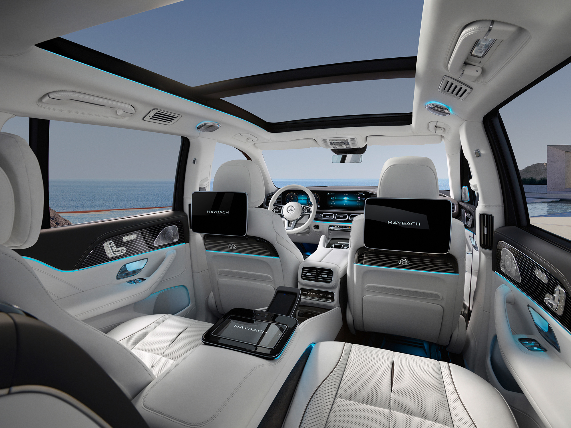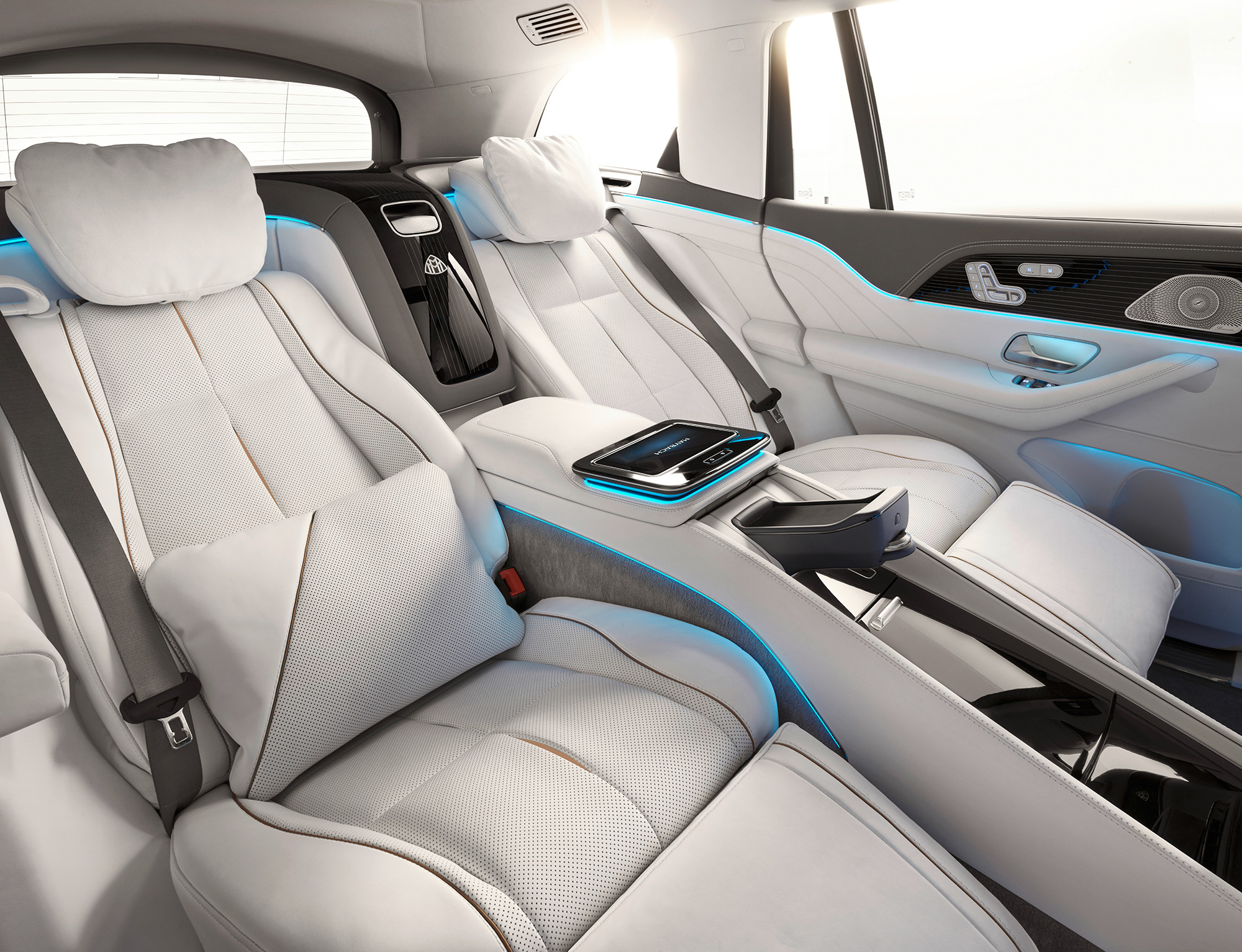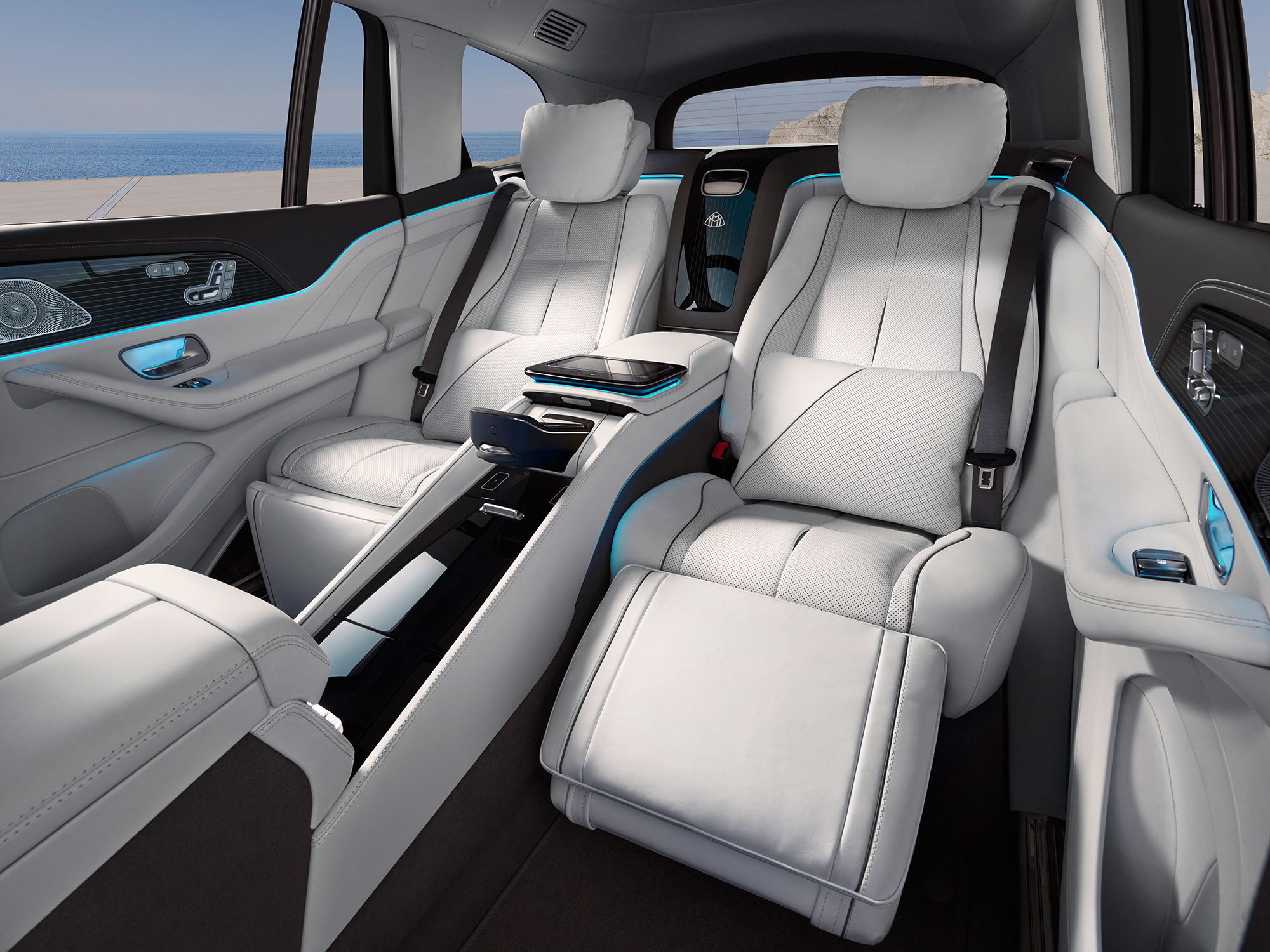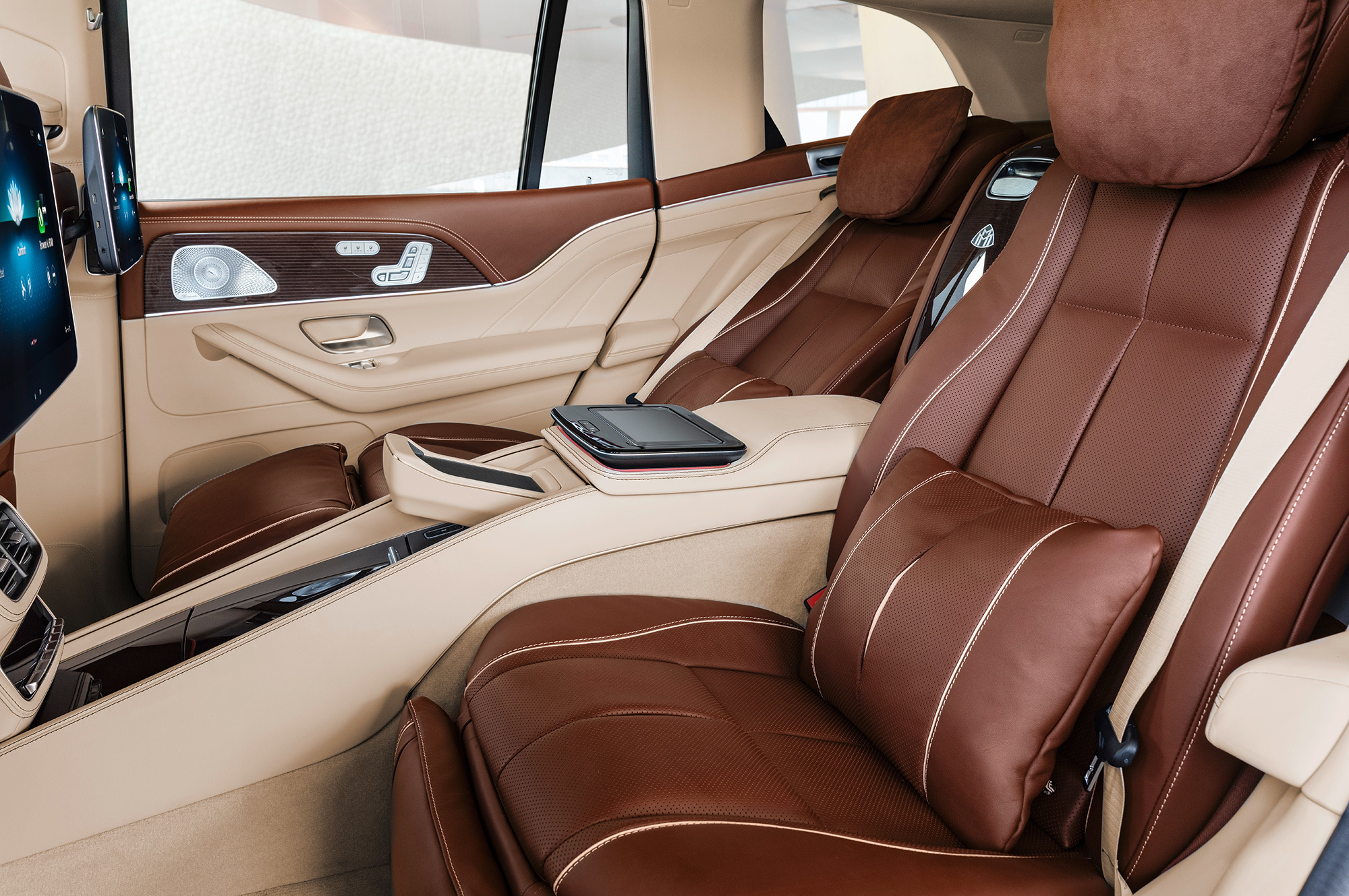 Передние двери можно не открывать ― в этой части салона всё как у обычного Мерседеса GLS. А вот задние двери открыть стоит. Меркнет даже длиннобазный Range Rover. В модели Mercedes-Maybach GLS установлены два раздельных кресла, которые могут наклоняться на угол до 43,5 градуса и которые расположены на 120 мм ближе к багажнику, нежели в Мерседесе GLS. Пассажирам второго ряда доступны не только море свободного пространства, но и собственный двухзонный климат-контроль, подогрев и вентиляция сидений, массаж, самолётные столики, планшет для управления мультимедийкой и холодильник, спрятанный в неподвижную центральную консоль между шезлонгами.