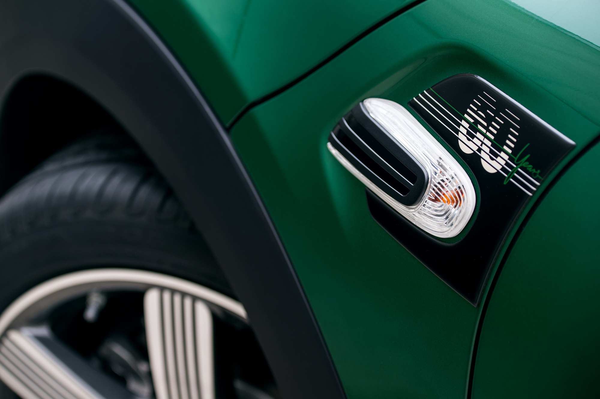 Декор снаружи в виде надписей и «гоночных» полос здесь дополнен эксклюзивными 17-дюймовыми легкосплавными колёсными дисками: двухцветными в дизайне 60 Years Spoke. Помимо цвета кузова British Racing Green IV покупатели юбилейной серии могут также заказать оттенки Midnight Black, Moonwalk Grey, Melting Silver и MINI Yours Lapisluxury Blue. Контрастная крыша при этом может быть чёрной или цвета Pepper White, такой же колер получат зеркала.