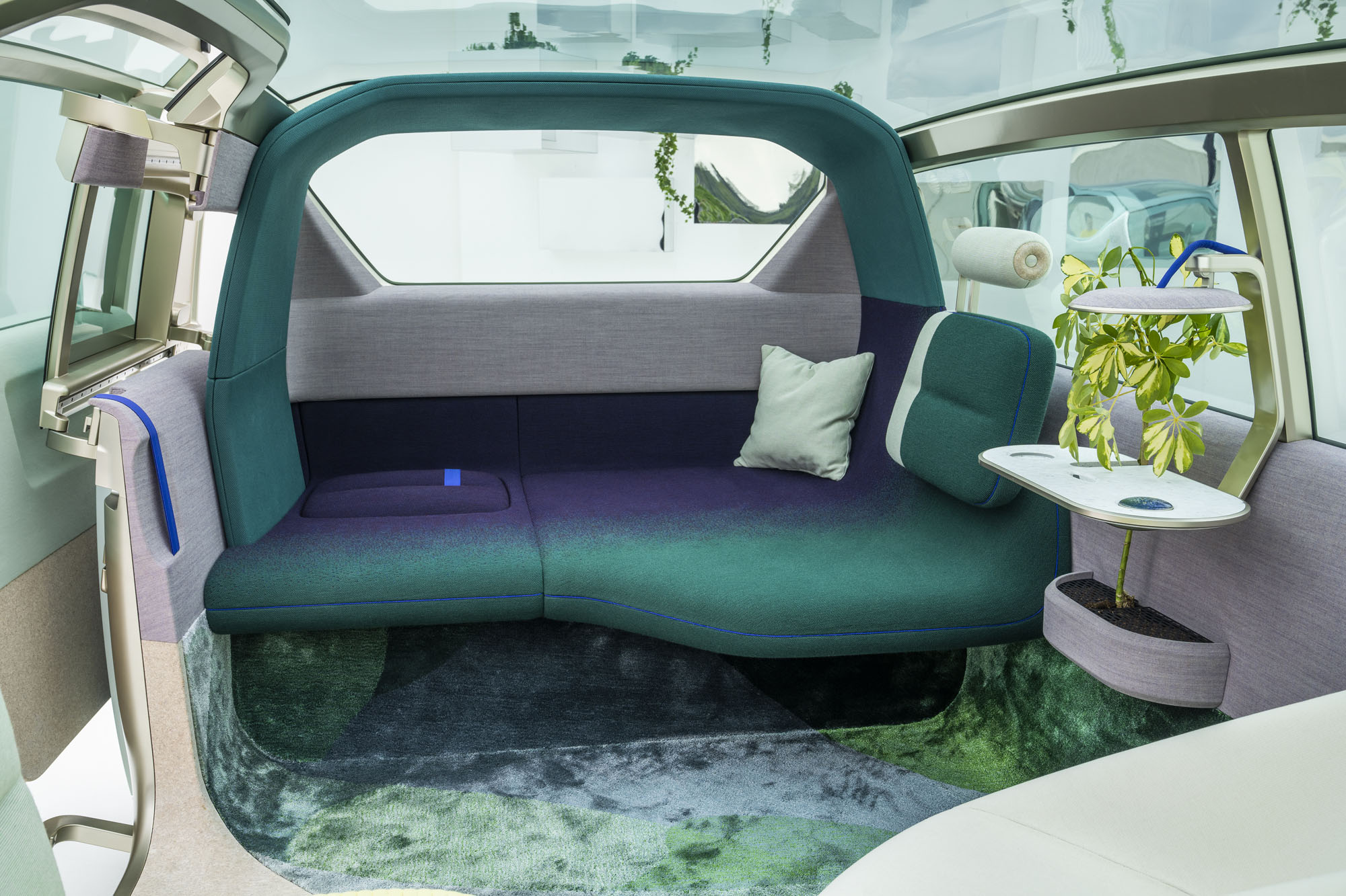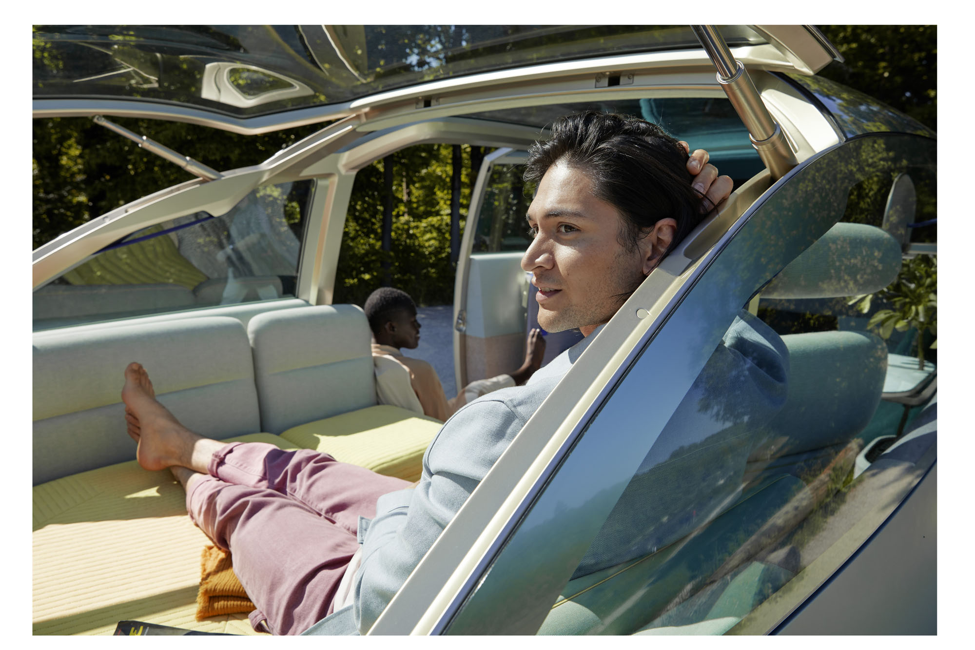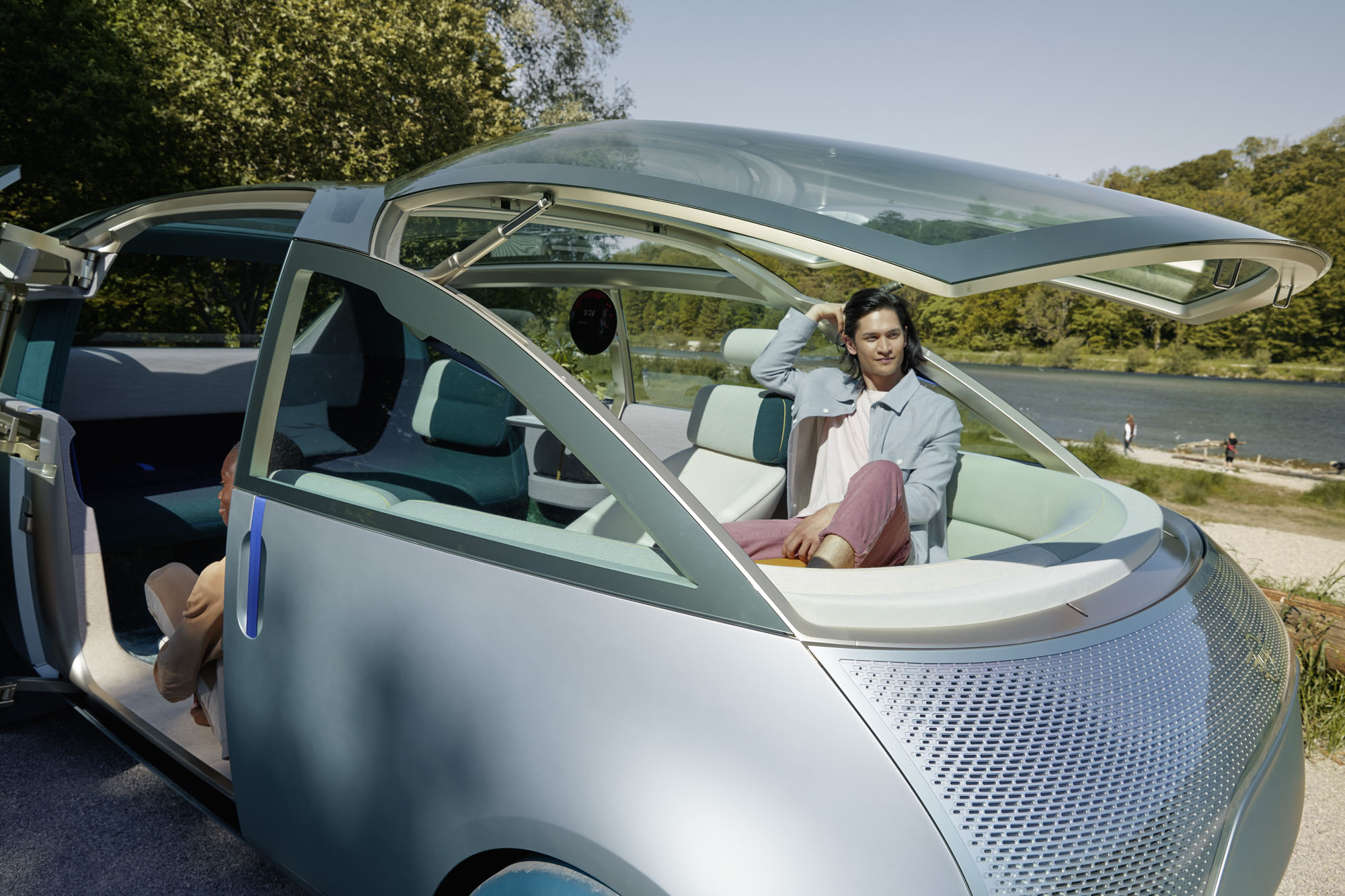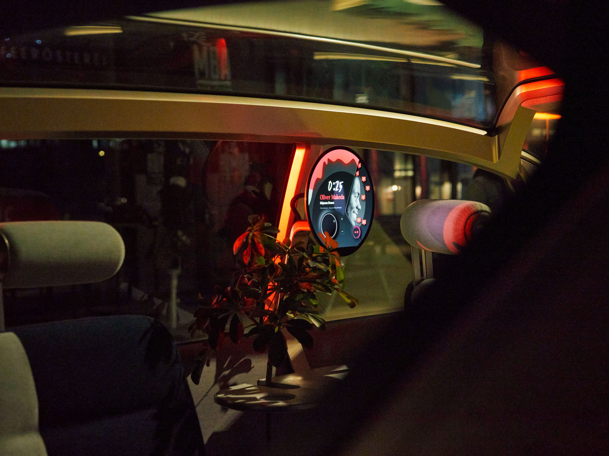 Наконец, режим общения Vibe (на стоянке) предполагает максимальное погружение пассажиров в комфортную обстановку, при этом стирая границу между машиной и окружающим миром. Тут распахивается боковая дверь, открывается лобовое стекло, а центральный круглый экран превращается в пульт управления мультимедийным комплексом. Подсветка на задней дуге, а также диоды в колёсных дисках становятся графическими эквалайзерами, меняясь в такт музыке. А ещё добавлен четвёртый режим салона — My moment — с возможностью индивидуальной настройки работы элементов интерьера.