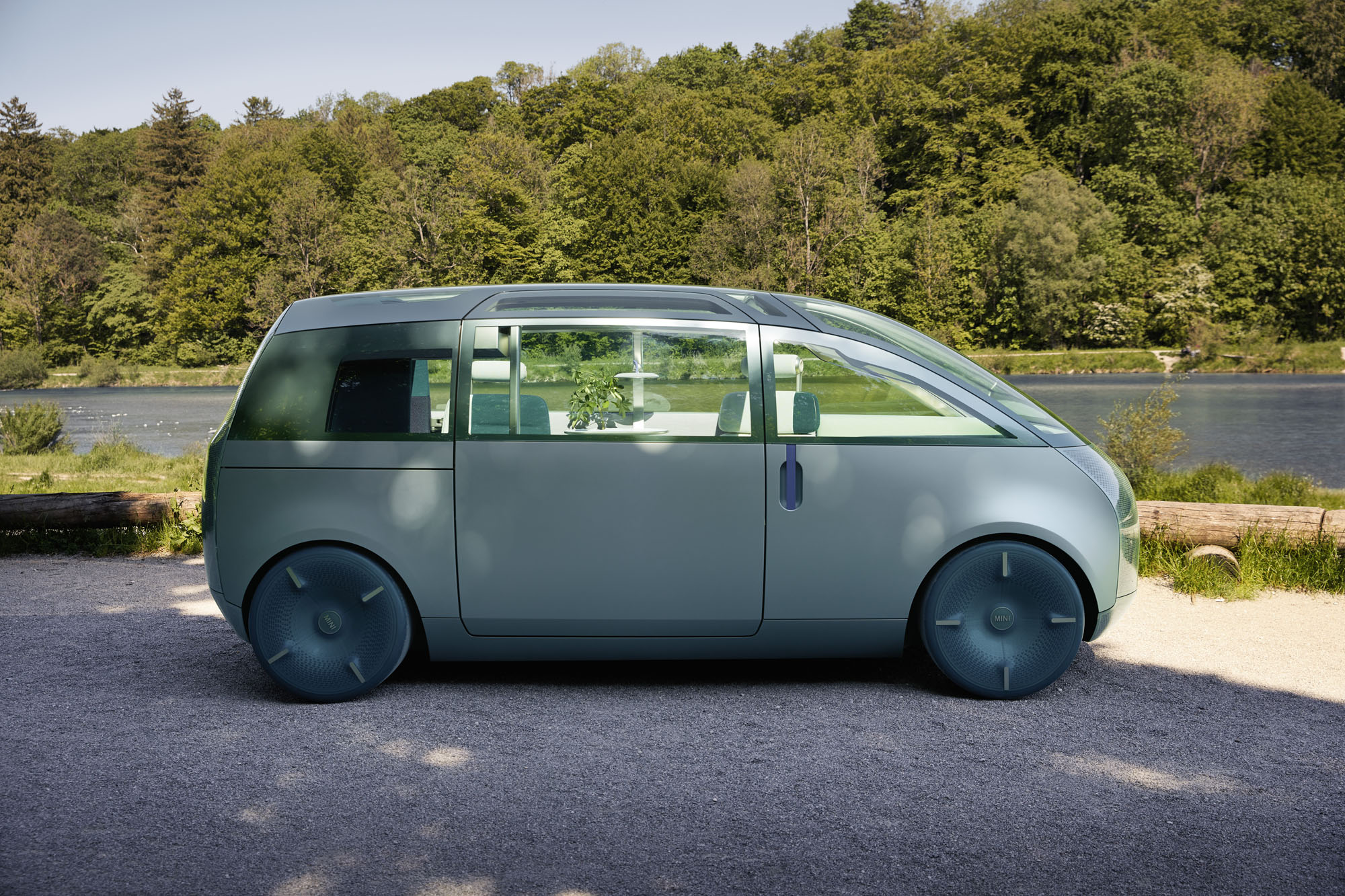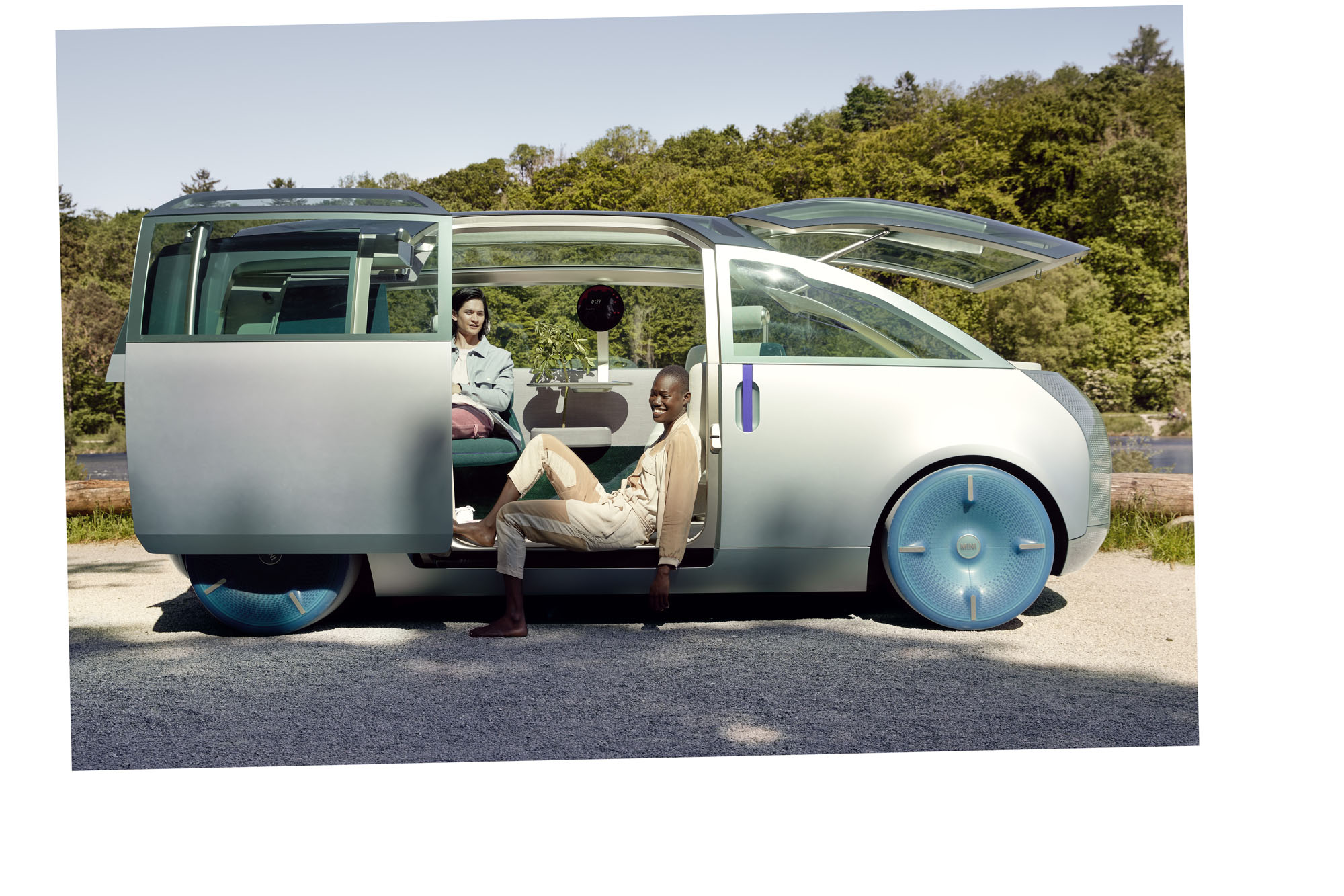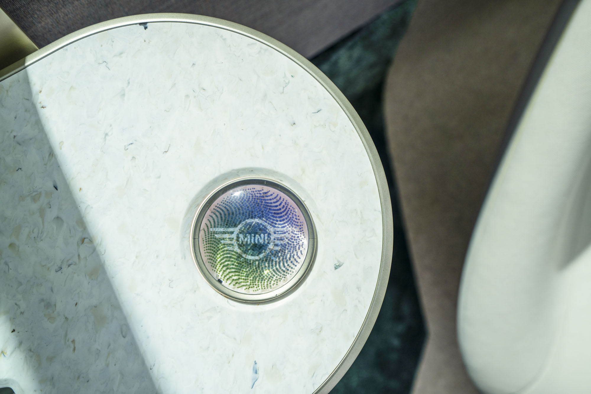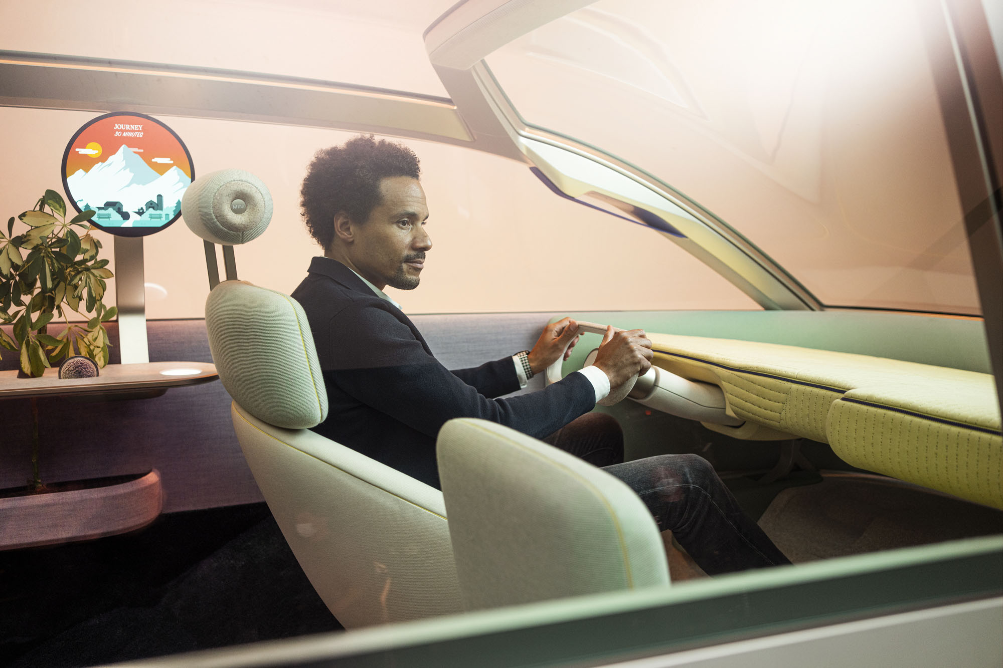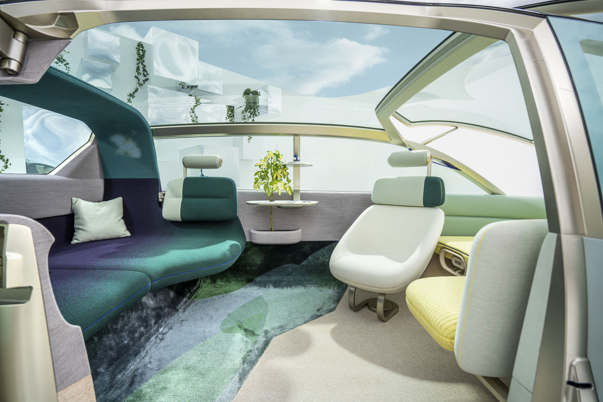 Три «момента MINI», фактически три режима интерьера, заявлены те же, о которых говорилось ранее. Теперь разработчики раскрыли больше подробностей. Трансформация запускается перемещением жетона MINI Token в один из слотов на столике. В расслабленном режиме Chill арка над задним диваном изображает зелёный навес леса (она является экраном под тканью). Одновременно OLED-дисплей над столиком опускается вниз, превращаясь в лампу. Wanderlust — это вождение как вручную, так и в автоматическом режиме. Нажав на логотип MINI в центре салона, можно «извлечь» спрятанные руль и педали. Круглый дисплей в центре начинает показывать маршрут и информацию о достопримечательностях.