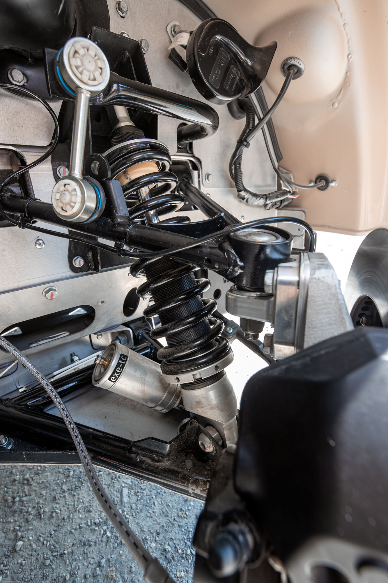 В подвеске были применены гоночные койловеры EXE-TC с внутренними отбойниками, а ради роста клиренса (до 230 мм) и колеи пришлось поменять не только амортизаторы и пружины, но и поставить модифицированные поперечные рычаги от Моргана Plus Six на специально подобранных втулках. Перекроить потребовалось и колёсные арки, чтобы они вмещали колёса с большим внешним диаметром.