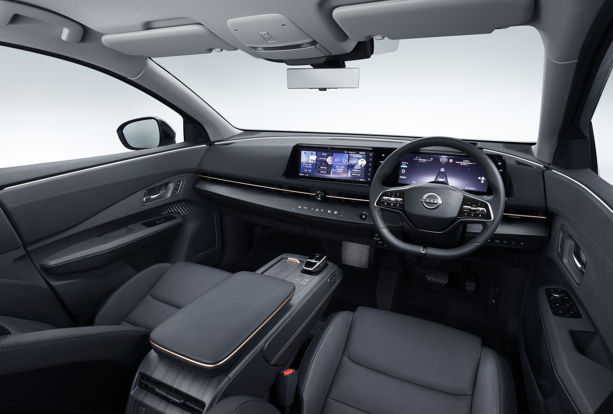 Бесключевой доступ означает автоматическое восстановление настроек по профилю водителя, к услугам которого два экрана по 12,3 дюйма (приборка и центральный, информацию между ними можно переносить). Плюс тут есть один из самых больших в сегменте цветных проекционных дисплеев и голосовой помощник, откликающийся на «эй, Ниссан» и консультирующийся с «облачным» сервисом по сети 4G для лучшего понимания естественной речи. Всё это великолепие подсвечивается мягким окружающим светом в стиле традиционного японского бумажного фонаря. Авторы машины считают её смесью японского футуризма с историческими традициями. Пересечение это отражено и в логотипе компании: он в целом похож на прежний, но всё же — новый, со скорректированным дизайном. И такой постепенно появится на других моделях бренда.