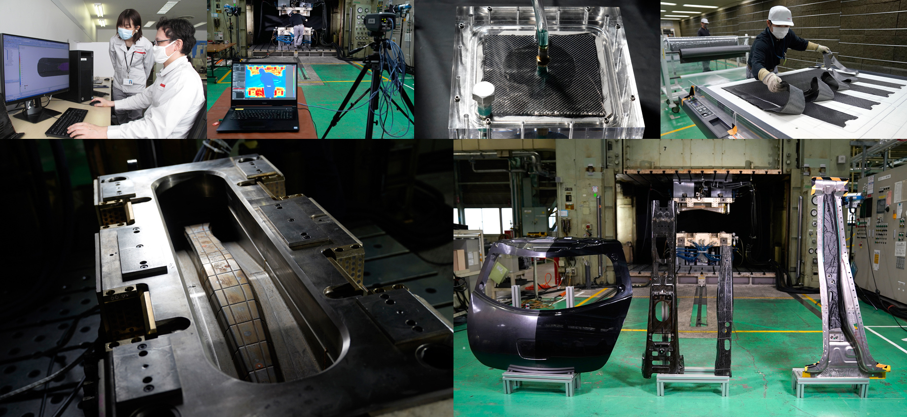 Японцы разработали метод точного моделирования проницаемости углеродного волокна для смолы и визуализации поведения её потоков с помощью опытов с датчиком температуры в штампе и прозрачного штампа. Далее компьютер по двум десяткам параметров материалов помогает определить оптимальные места для тонких бороздок внутри, которые ускоряют распределение связующего материала. В результате срок разработки инструмента сокращается наполовину, а время формовки одной детали — на 80% (с десяти минут до двух). Заодно исключается изготовление нескольких экспериментальных штампов, на которых ранее проверялась равномерность пропитки детали смолой. Это снижает цену конечного продукта.