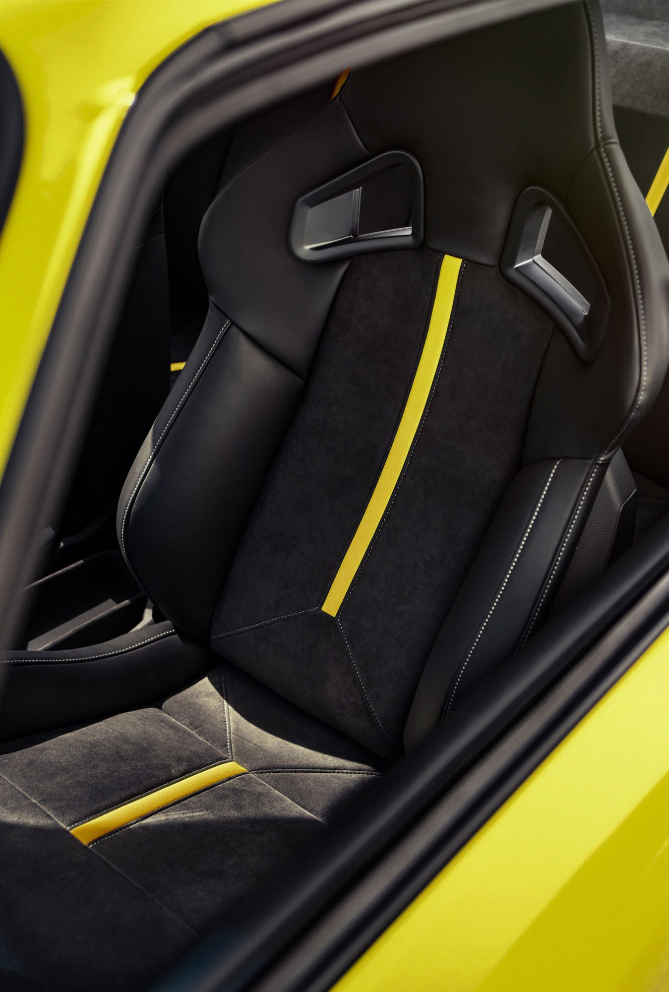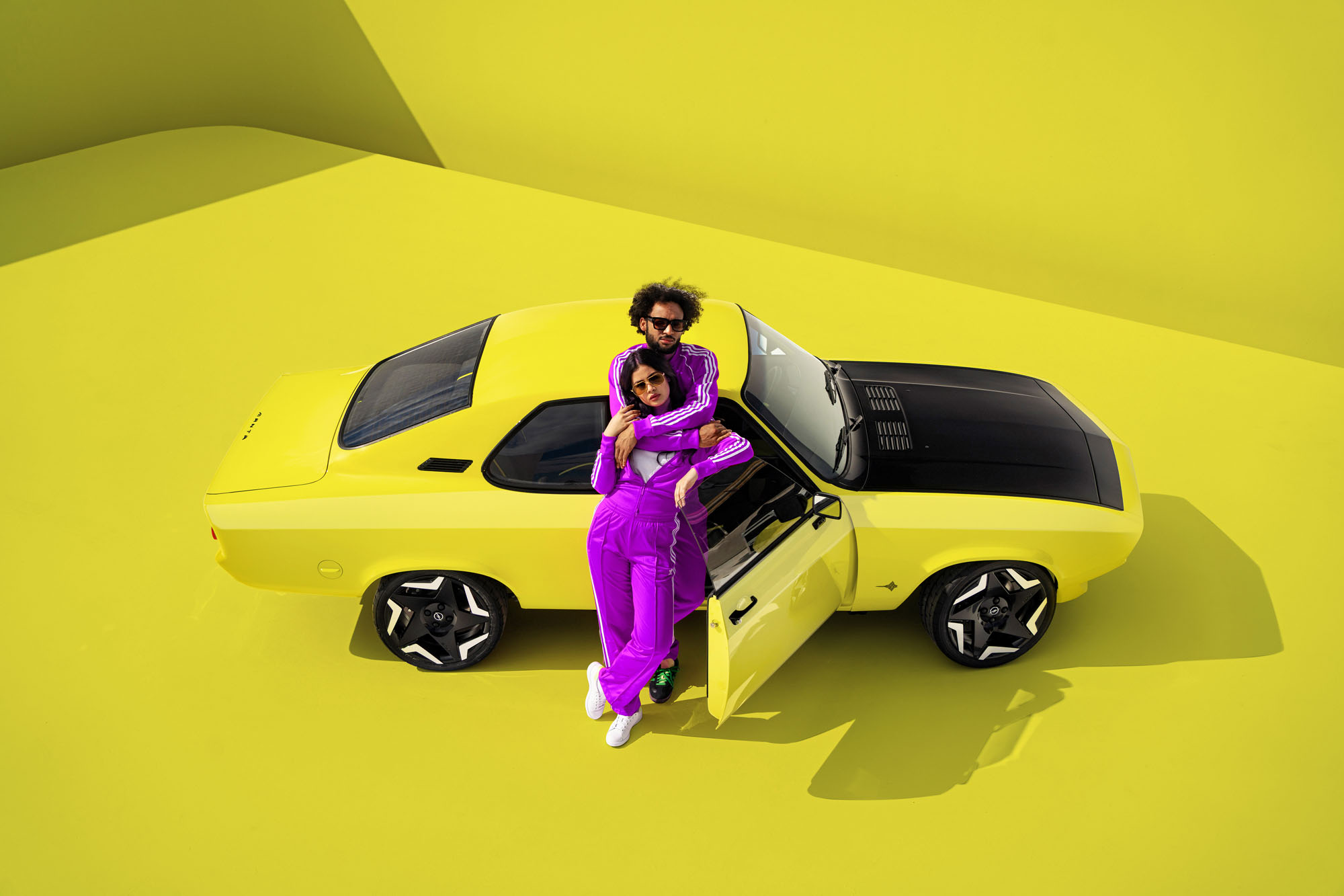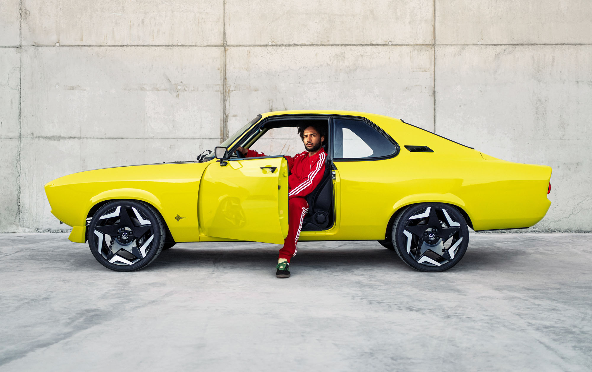 Внутри Манту также отличает смесь ретро-мотивов и современных деталей. Трёхспицевый руль от Petri доработан Опелем и получил жёлтый маркер на 12 часов. Выглядит он в стиле Опелей 1970-х. А вот спортивные кресла заимствованы у Адама S. Потолок отделан алькантарой, а сочетание в интерьере чёрного, жёлтого и матово-серого цветов компания назвала неоклассицизмом. Единичная электрическая Manta, таким образом, соединяет прошлое и будущее компании.