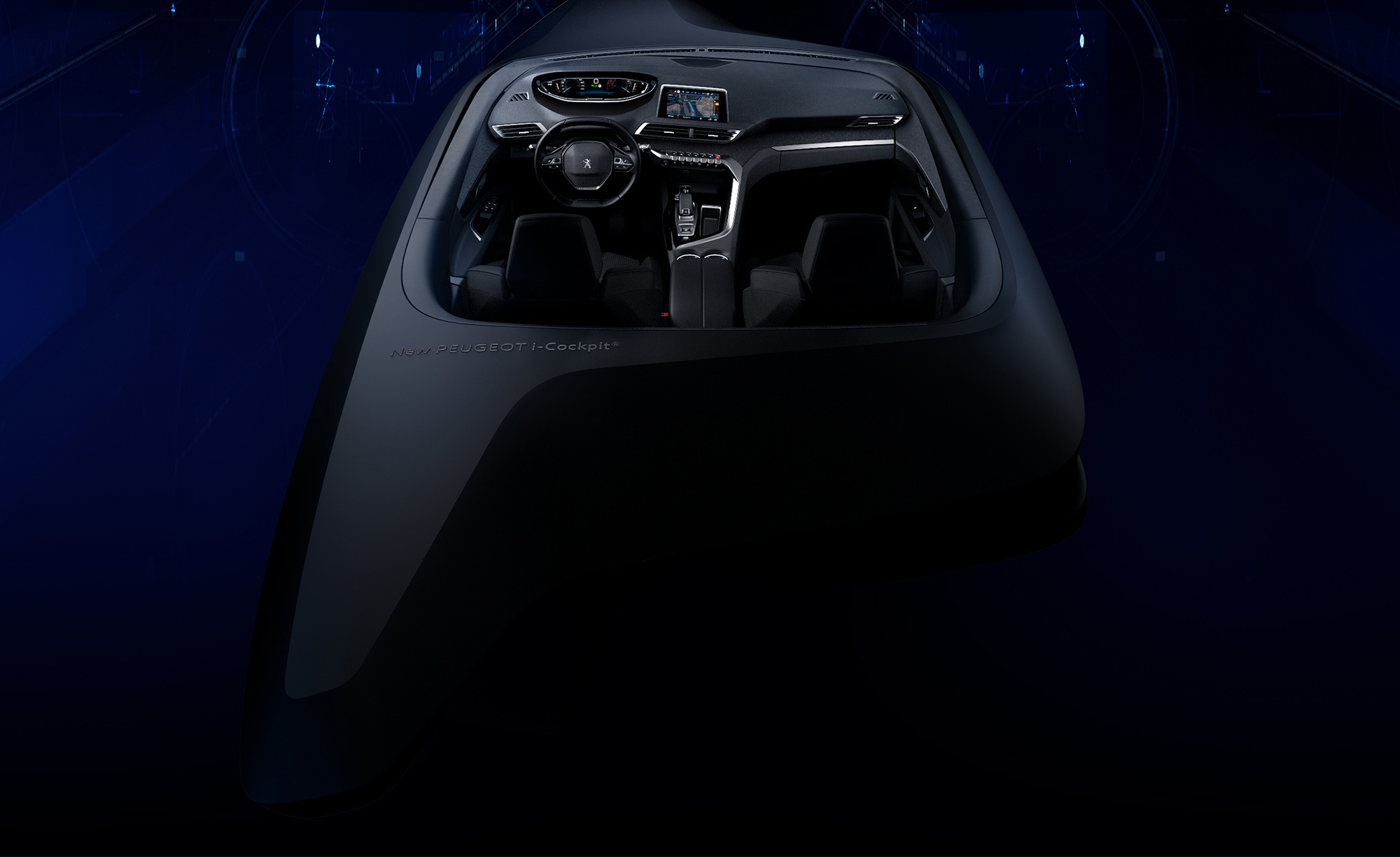 Новое поколение интерьера i-Cockpit — не революционное, а эволюционное развитие концепции. Как и прежде, приборная панель расположена на уровне глаз водителя, а вот руль теперь установлен ниже и скошен не только снизу, но сверху. Приборка стала полностью цифровой, на неё можно, например, вывести 3D-изображение с навигатора. Доступны два варианта атмосферных подсветок — Boost для динамичного вождения и Relax для более спокойных поездок.