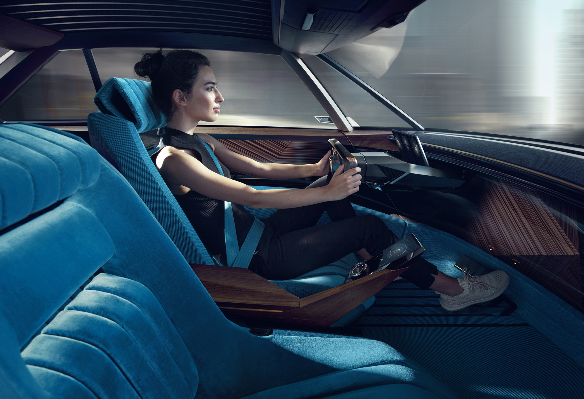 В планы развития марки включены также модные слова «подключение» и «автономность». Беспилотных режимов у концепта два: Soft и Sharp. В первом обеспечен максимальный комфорт, даже вывод информации на экраны сокращён до минимума. Во втором автомобиль динамичнее, а пассажиры погружаются в цифровое окружение (социальные сети, музыка, кино, видеоигры). Салон приспосабливается: руль прячется под переднюю панель, открывая полный вид на изогнутый экран диагональю 49 дюймов, протянувшийся в нижней части передней панели, а спинки кресел откидываются.