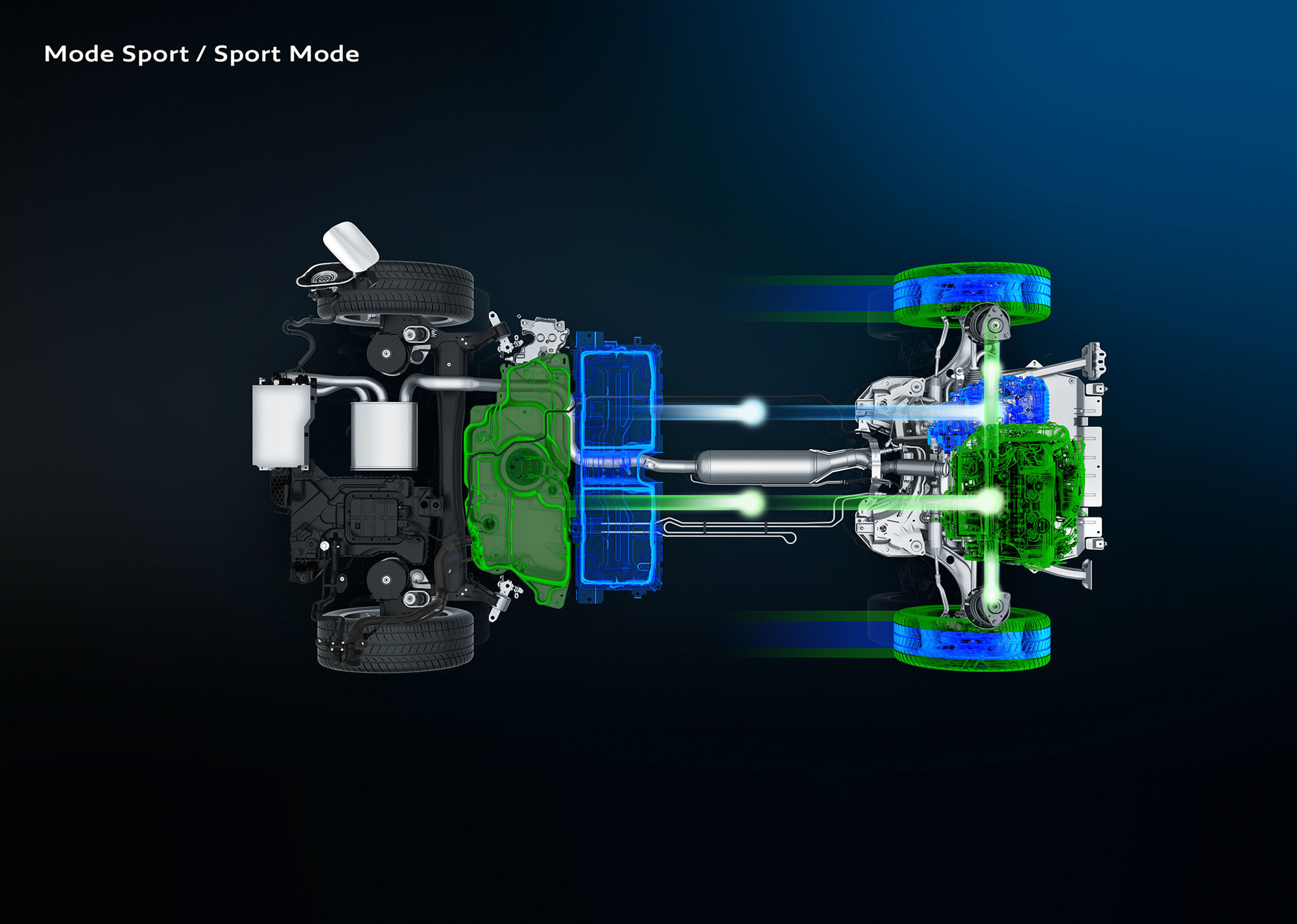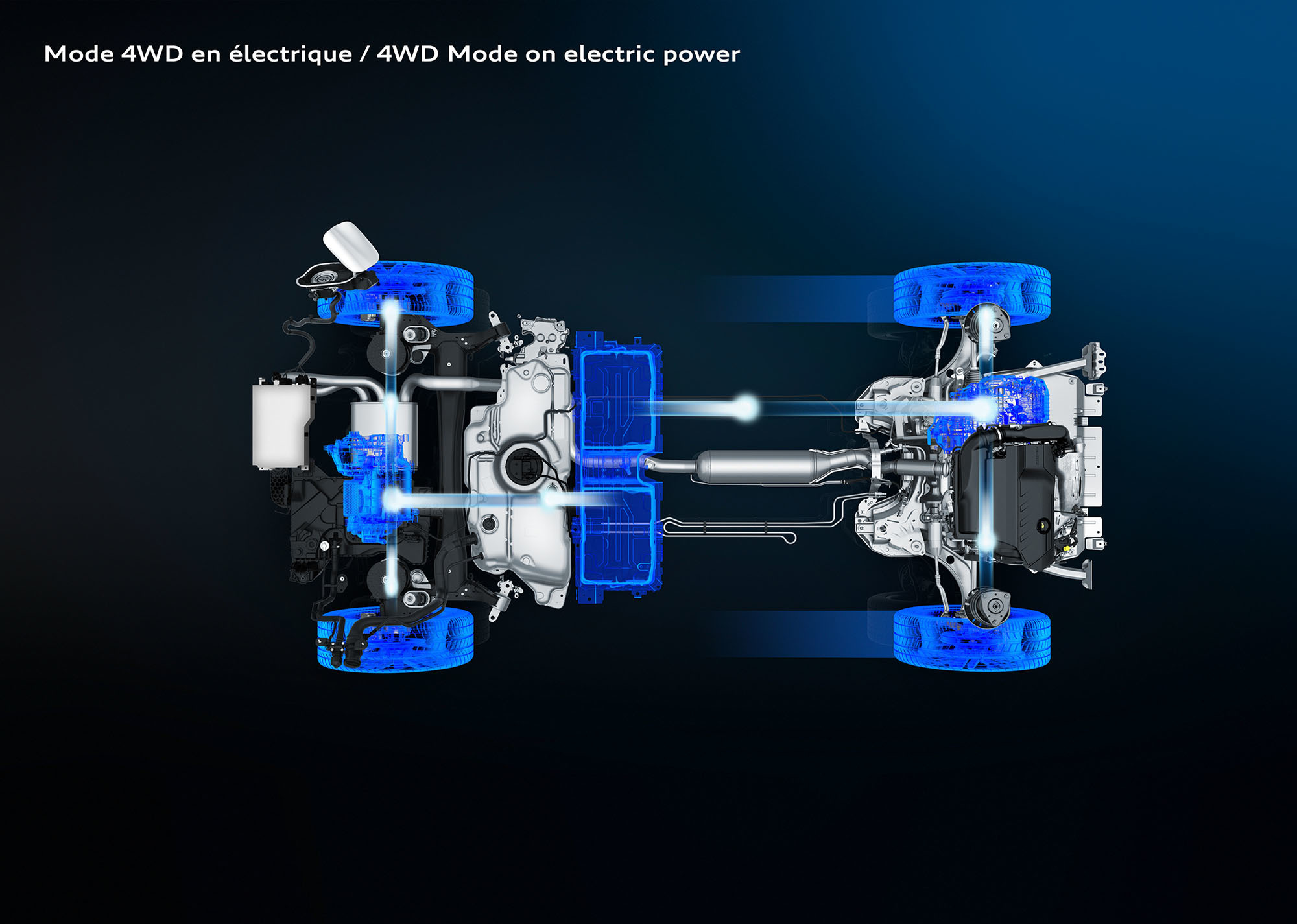Модуль задней многорычажной подвески кроссовера получил встроенный электромотор с инвертором и редуктором. Его максимальная мощность аналогична переднему электродвигателю — 110 л.с. Из-за особенностей распределения энергии отдача ДВС и двух электродвигателей не складывается полностью. Тем не менее суммарная мощность системы Hybrid4 достигает 300 л.с., позволяя паркетнику ускоряться с места до сотни за 6,5 с. В электрическом режиме модель может использовать как передний электромотор в одиночку, так и оба электромотора (электрический 4WD). На электротяге можно ехать со скоростью до 135 км/ч, выше подключится ДВС.