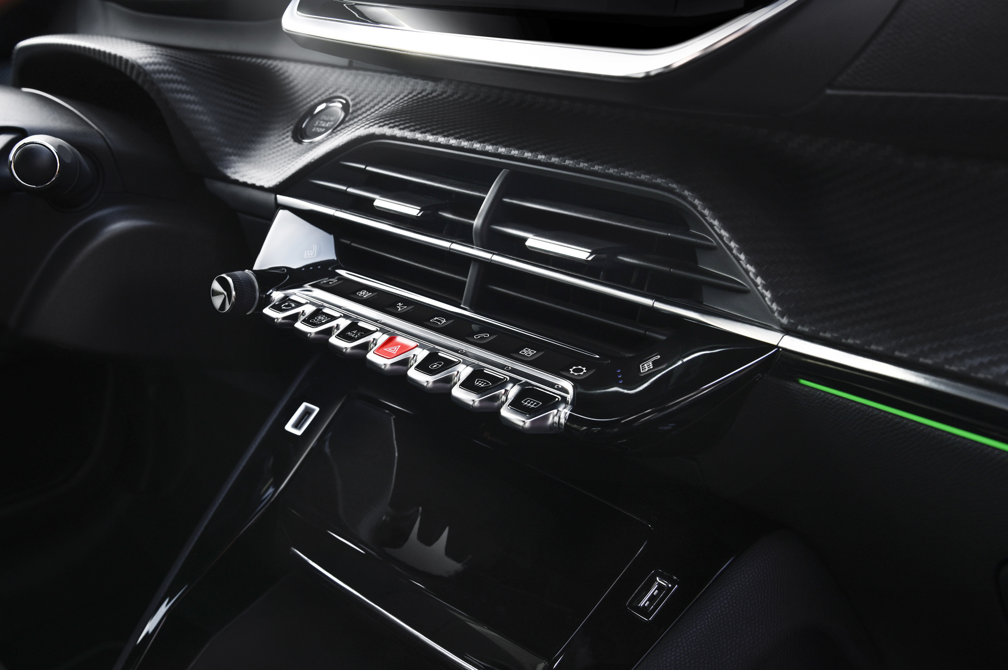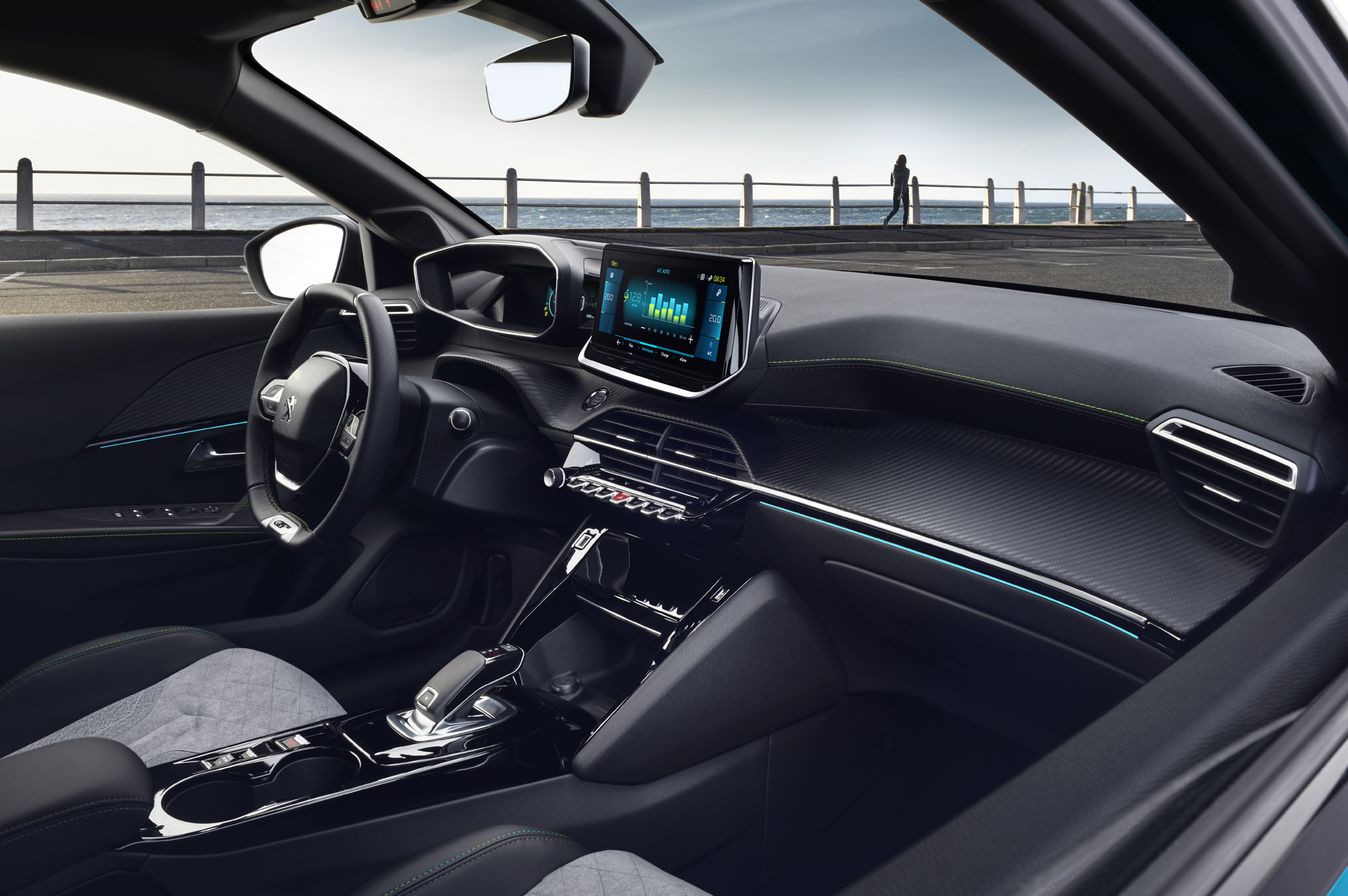 Французы подчёркивают, что батарею на e-208 удалось аккуратно вписать в пространство под полом, и потому ни салон, ни багажник электрической версии хэтчбека от его собрата с ДВС не отличаются. Полная зарядка электрокара от домашней розетки требует 16 ч, от настенного зарядника Wall Box — восемь часов (однофазный вариант на 7,4 кВт) или пять часов пятнадцать минут (трёхфазный на 11 кВт). Наконец, от публичной станции быстрой зарядки (до 100 кВт) аккумулятор наполнится на 80% за полчаса.