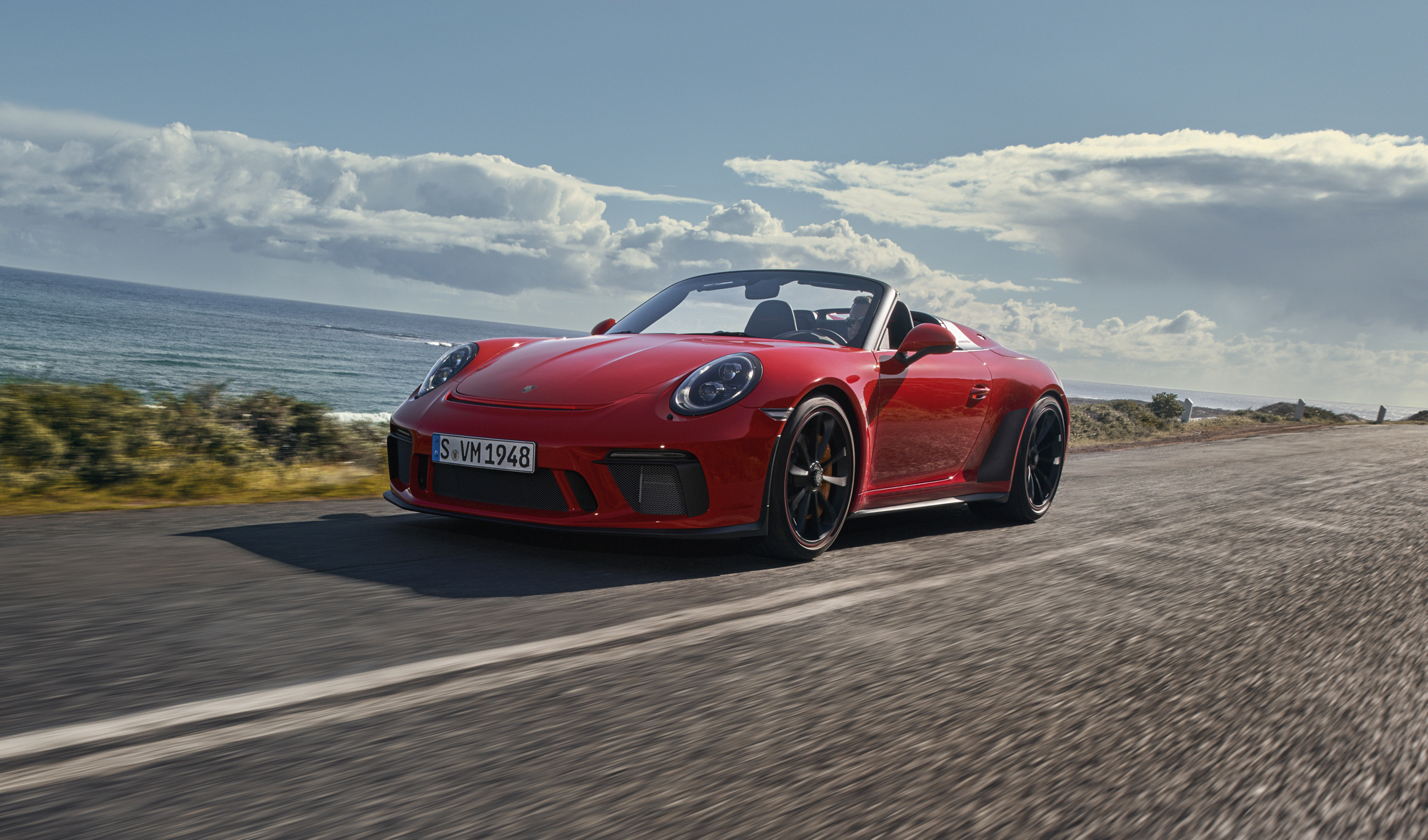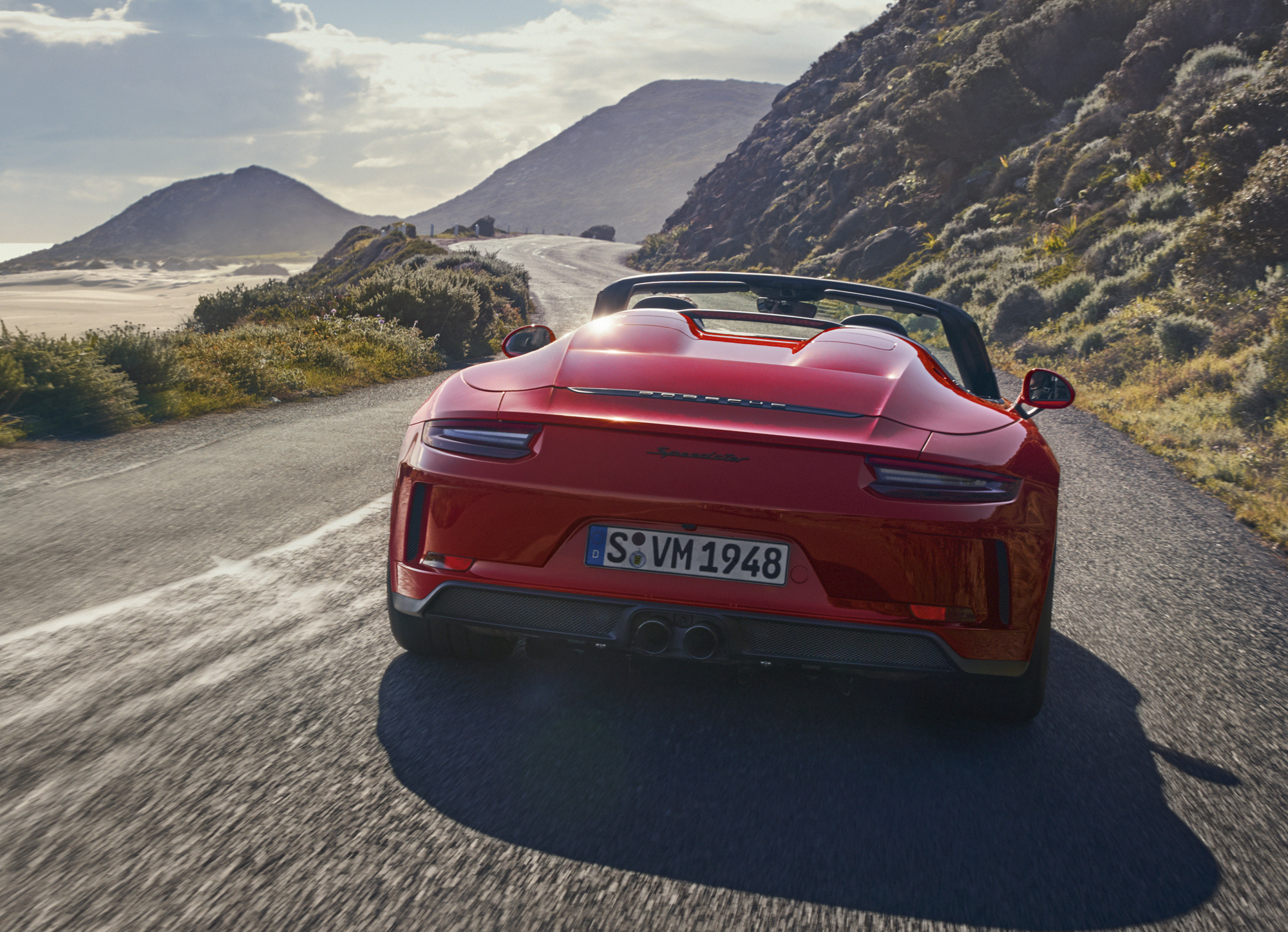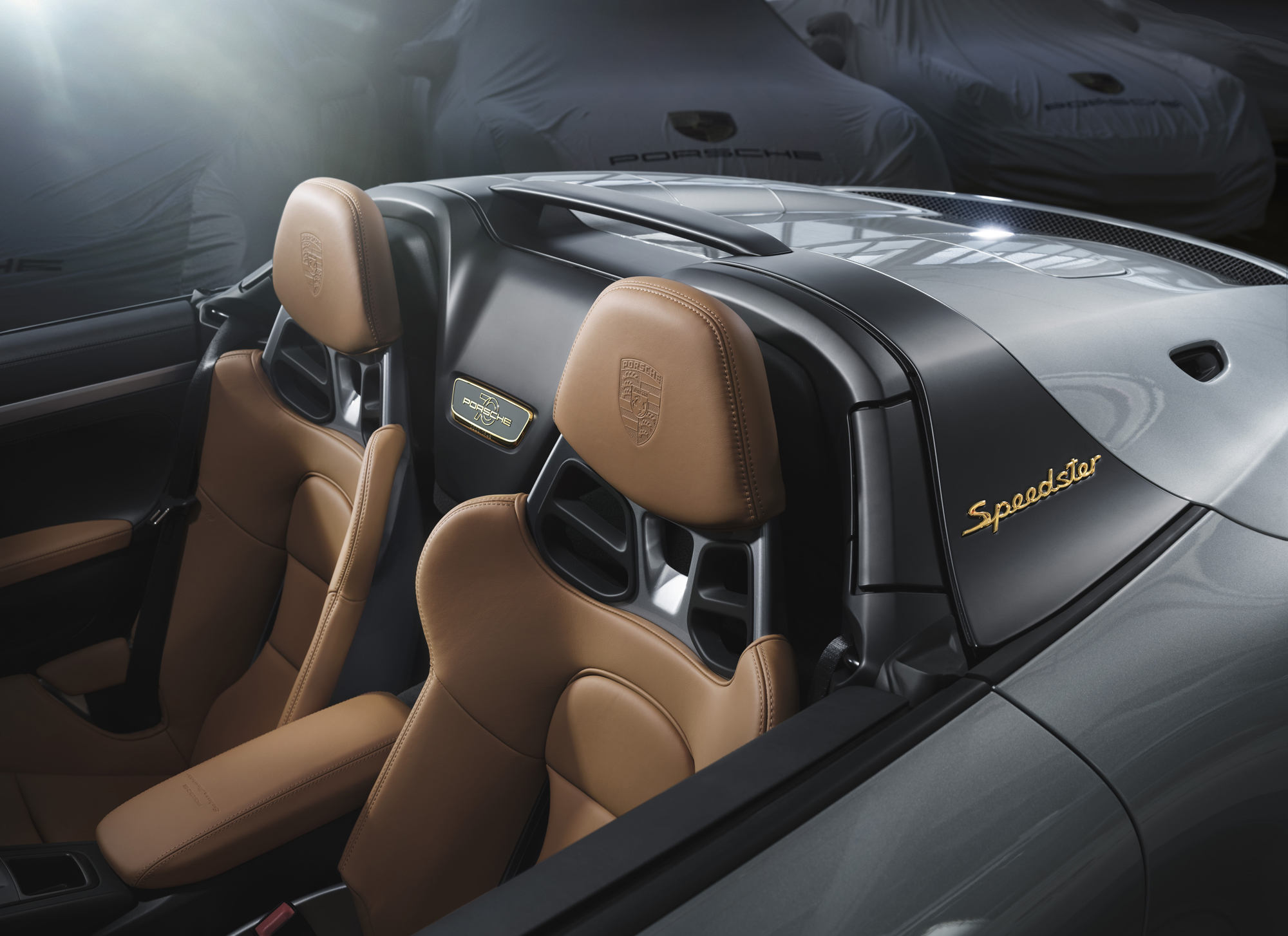 Главная изюминка двухместной модели, как и у прошлых Porsche с приставкой Speedster в названии, — лёгкий тканевый верх, снимаемый и устанавливаемый вручную (только фиксирующая защёлка имеет электрический актуатор). Лобовое стекло тут ниже, чем на исходном открытом 911-м, сзади появился сдвоенный колпак из углепластика. Из того же материала выполнены крышка переднего багажника и задняя крышка моторного отсека, передние крылья. В штатный набор входят 20-дюймовые колёса с центральным замком.