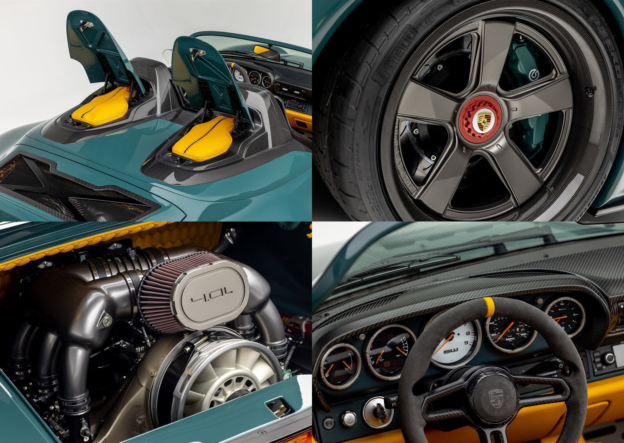 В движение 993 Speedster Remastered by Gunther Werks (так имя модели предпочитает писать ателье) приводится атмосферным шестицилиндровым мотором 4.0 от Rothsport Racing (штат Орегон), с воздушным охлаждением, как у оригинала. Поршни Mahle, блок управления Motec, свечи с индивидуальными катушками, отдельные выточенные корпуса дроссельных заслонок, кованые шатуны и коленвал, трубы выхлопной системы равной длины, выполненные из нержавейки: мотор заметно отличается от двигателя исходника родом из 1990-х. Мощность его указана неточно (в спецификации Спидстера написано «441+ л.с.»), а крутящий момент равен 454 Н•м. При этом красная черта для оппозитника находится на отметке 7800 об/мин.
