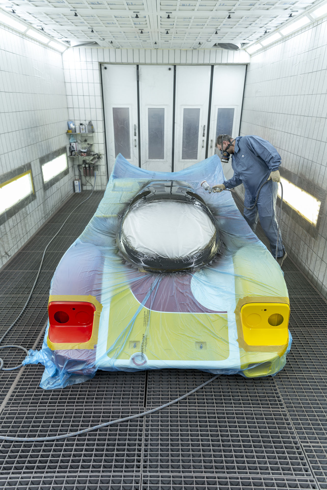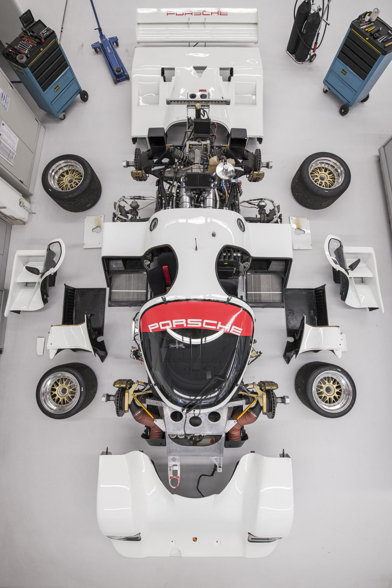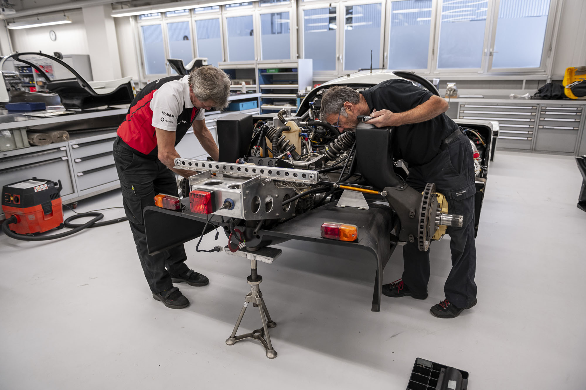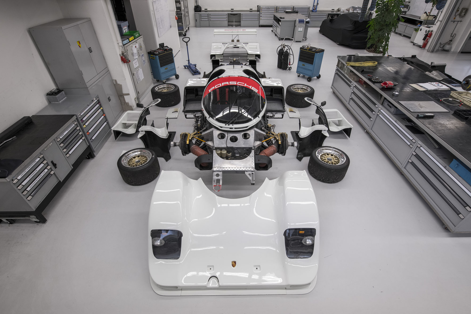 Этот Porsche 962 C после участия в ряде гонок отправился работать в отдел аэродинамики центра разработок в Вайссахе для исследований и опытов. Кстати, в Вайссахе 962 C когда-то и был создан. Потом машина попала в коллекцию компании. Полтора года назад сотрудники отдела Historic Motorsport Армин Бургер и Трауготт Брехт приметили 962 C на складе и задумали полностью его восстановить. Прототип перевезли в мастерскую Historic Motorsport и привлекли специалистов Центра разработок к реставрации. А ещё пригласили в качестве консультантов гоночного инженера Штука, Норберта Зингера, и дизайнера Роба Пауэлла, придумавшего 35 лет назад гоночные ливреи для этой модели.