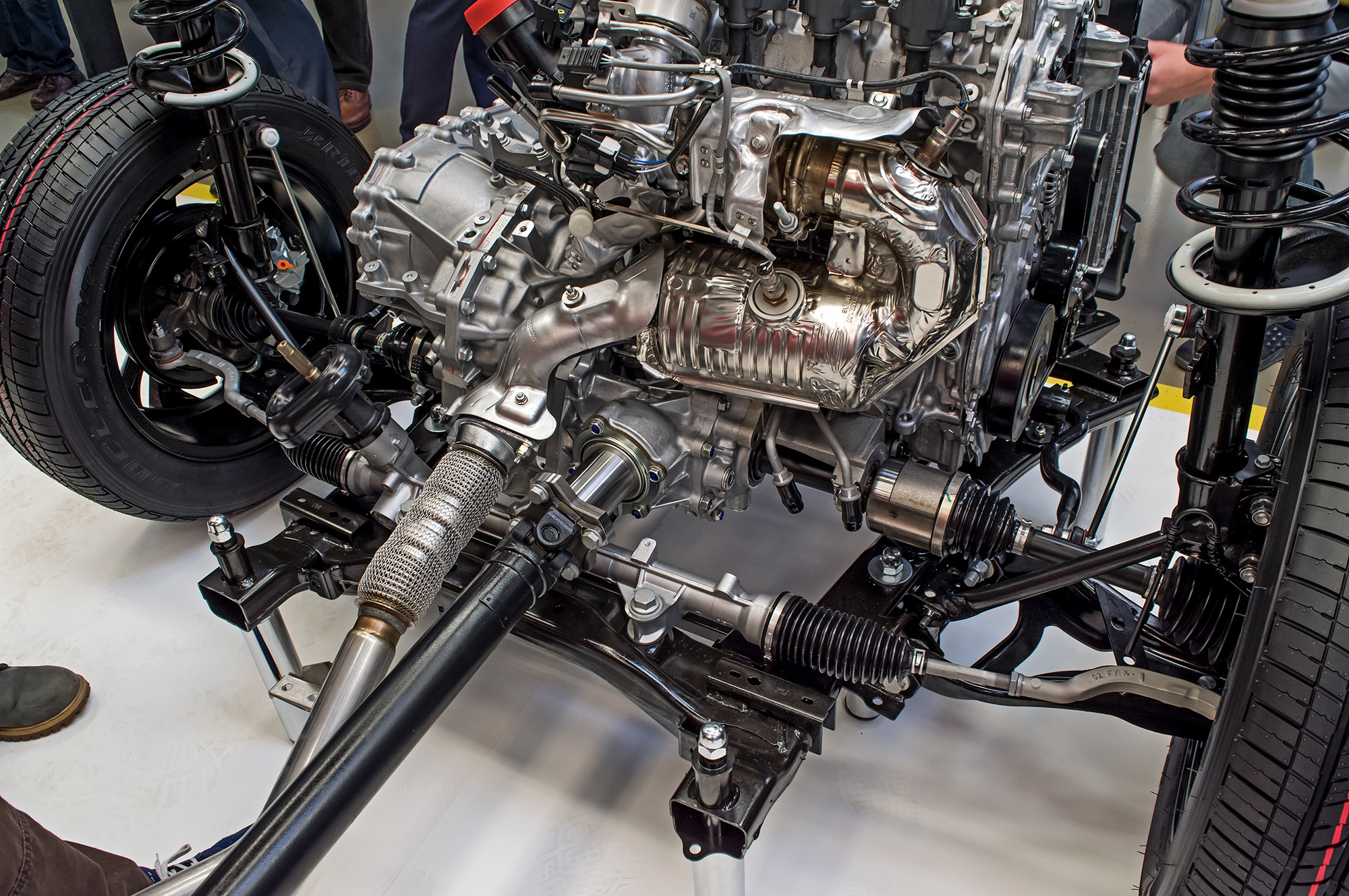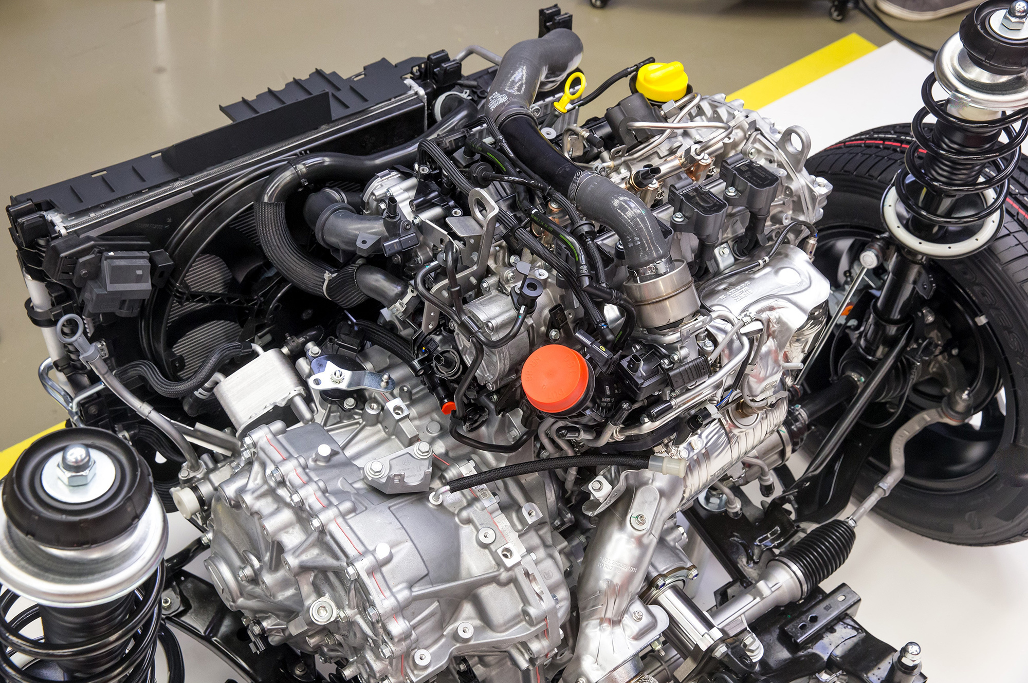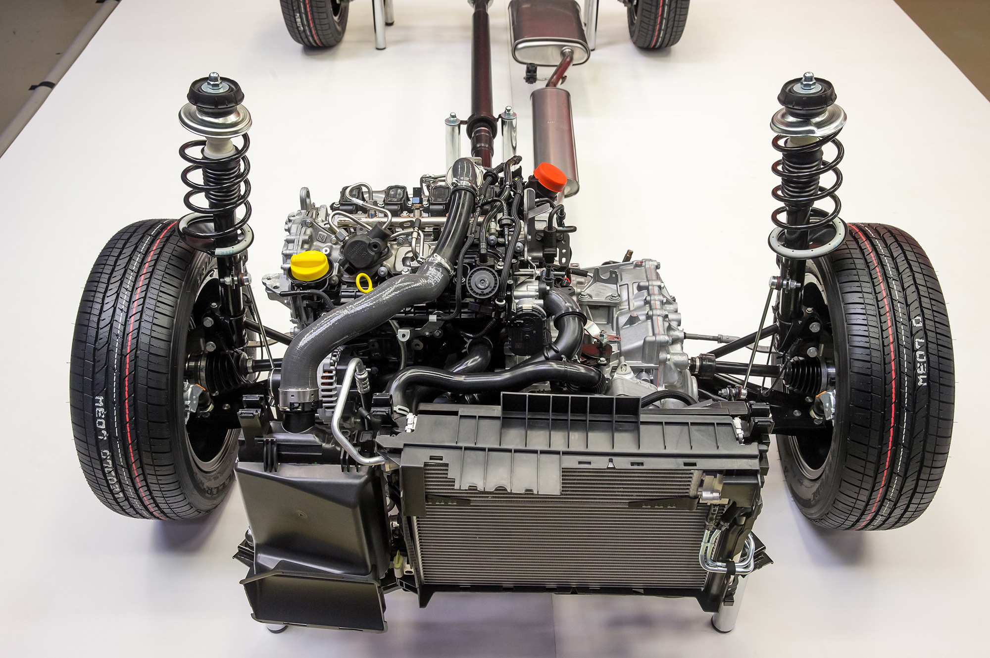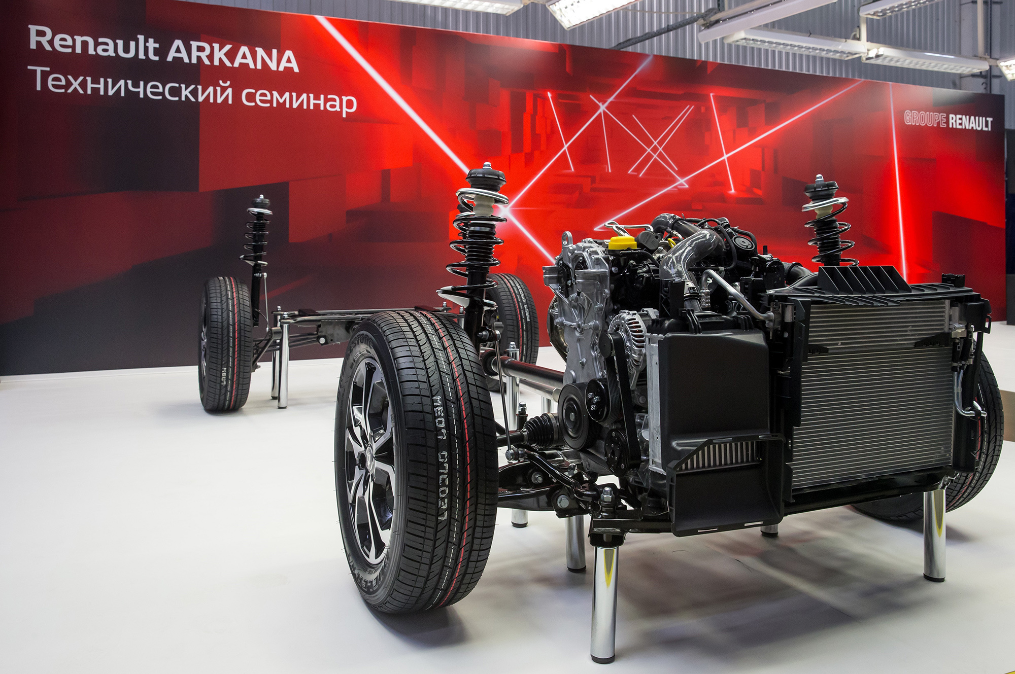 Продажи кроссовера Arkana (заводской индекс LJC) должны стартовать до конца июня. В ближайшие недели будут рассекречены внешность и интерьер серийной машины. Кое-кому из журналистов её уже показали. Я увижу всё одновременно с вами. Пока же на московском заводе Renault, где налаживается выпуск Арканы, осматриваю демонстрационное шасси с установленным на нём необычным силовым агрегатом — 150-сильным турбомотором 1.33 (250 Н•м) и вариатором CVT8 фирмы Jatco.