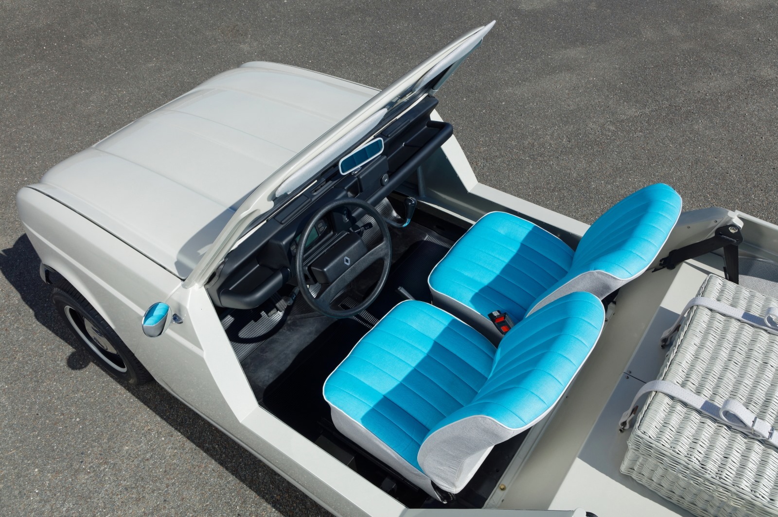 У хэтчбека Renault 4, выпускавшегося с 1961-го по 1994 год, была модификация Plein Air (1964) без дверей и крыши, зато с большим клиренсом и полным приводом. Французская армия машину забраковала, выбрав более дешёвый и способный Citroen Mehari. Гражданское население кабрик тоже не впечатлил, поэтому в 1970-м проект был свёрнут. Вернулись к нему реношники из-за десятого по счёту международного фестиваля 4L International, проходившего 19–21 июля на французском автодроме Circuits du Val de Loire. Там была показана электрическая версия e-Plein Air с агрегатом от Renault Twizy.