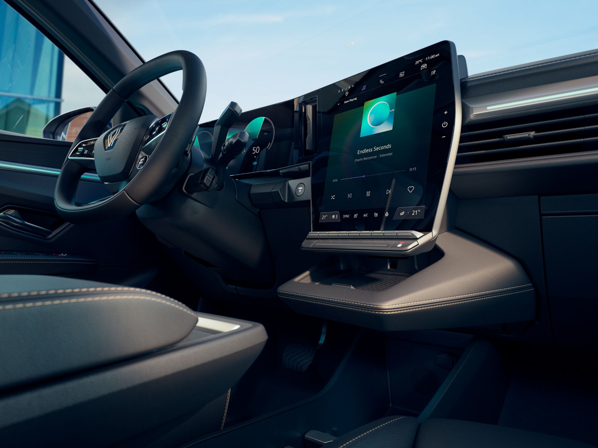 В интерьере широко применены переработанные материалы. Для начала заявлено три варианта исполнения: Equilibre, Techno и Iconic. При максимальном оснащении водителя порадует аудиосистема Harman/Kardon, зеркало со встроенным дисплеем и контурная подсветка из 48 цветов на выбор, которая может работать в «живом» режиме, самостоятельно подбирая цвета каждые 30 минут в зависимости от времени суток. Комплекс безопасности представляет собой адаптивный круиз-контроль с мониторингом скоростных ограничений, мёртвых зон, системой удержания в полосе, экстренным торможением при движении назад и безопасным выходом пассажиров.