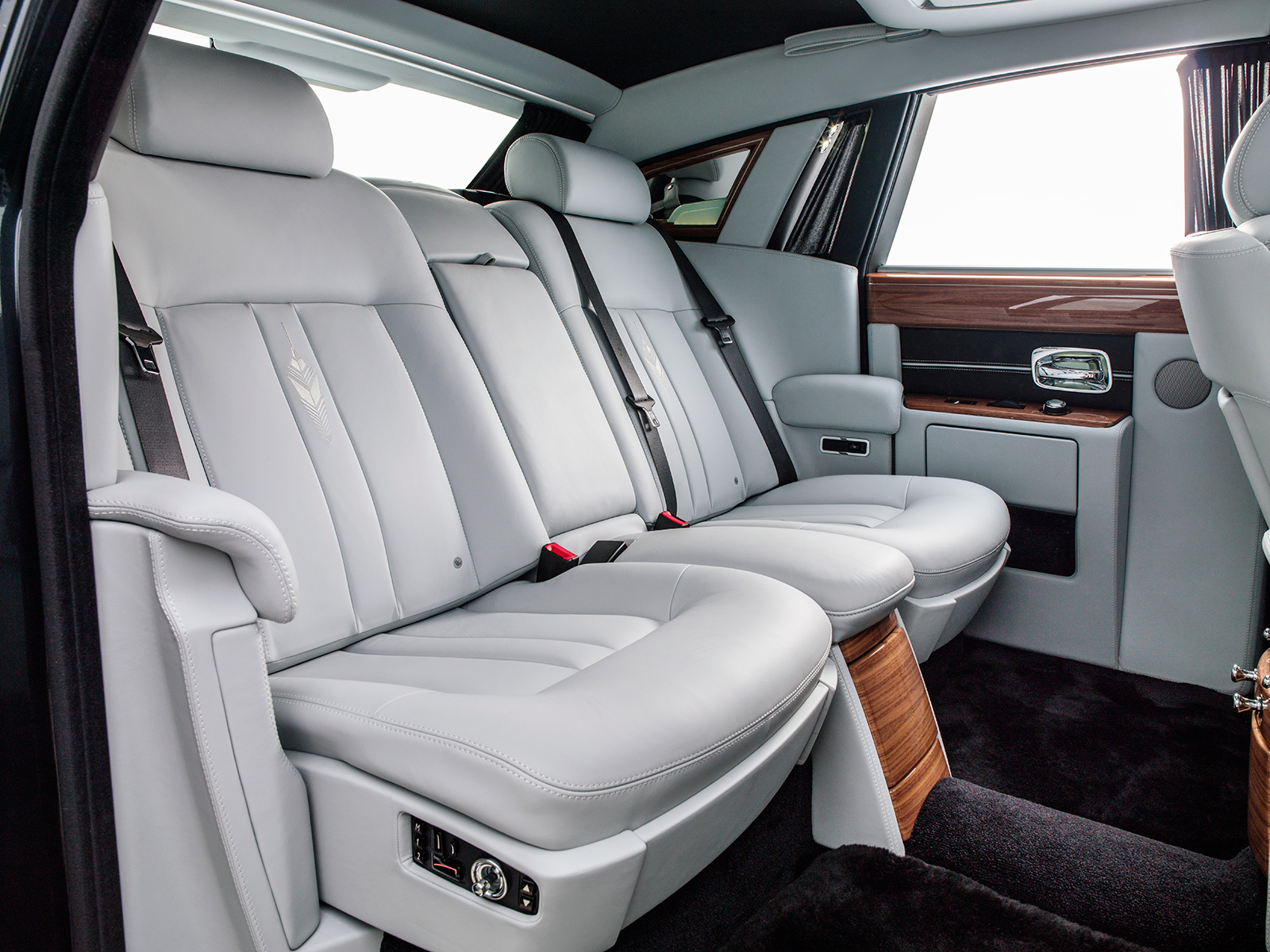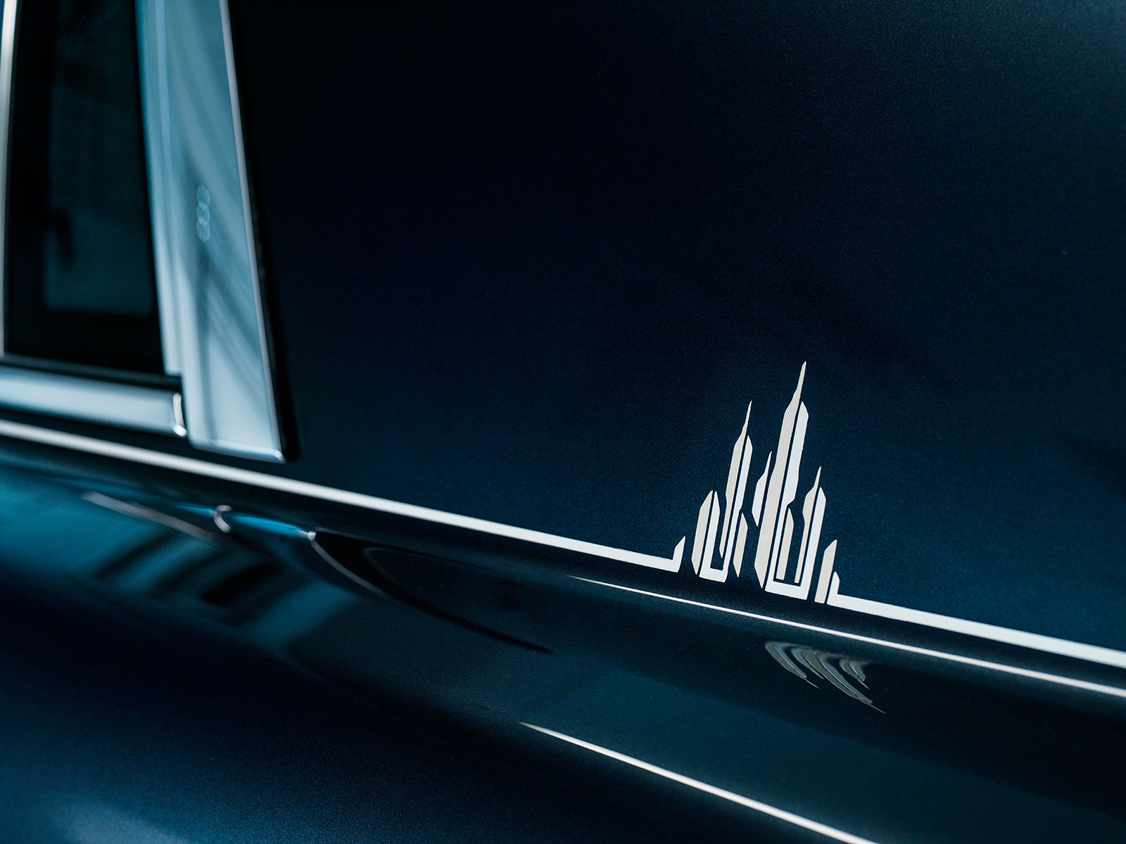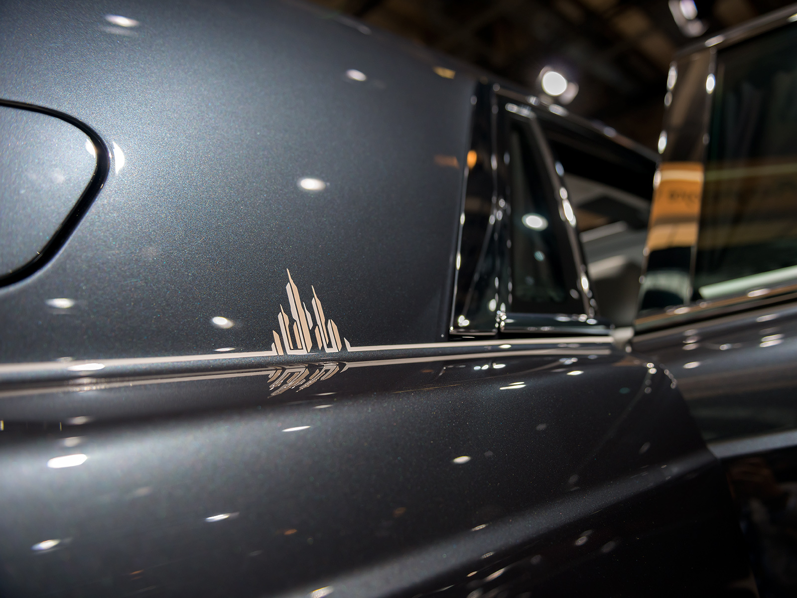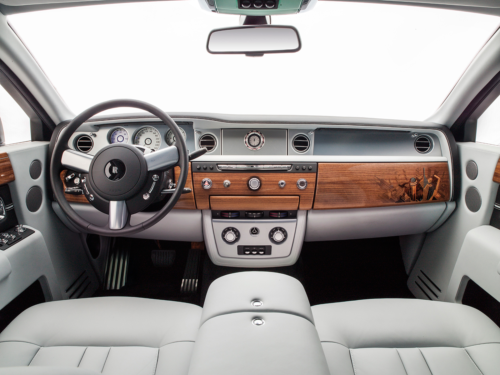 Мастера из Гудвуда вручную украсили переднюю панель, центральный тоннель, двери и столики в спинках передних сидений инкрустациями из натурального шпона, обработанного горячим песком. Мозаика из кусочков дерева изображает небоскрёбы мировых столиц с высоты птичьего полёта. Абстрактные здания вышиты и на спинках задних кресел: для этого пришлось сделать 6800 двухцветных стежков.