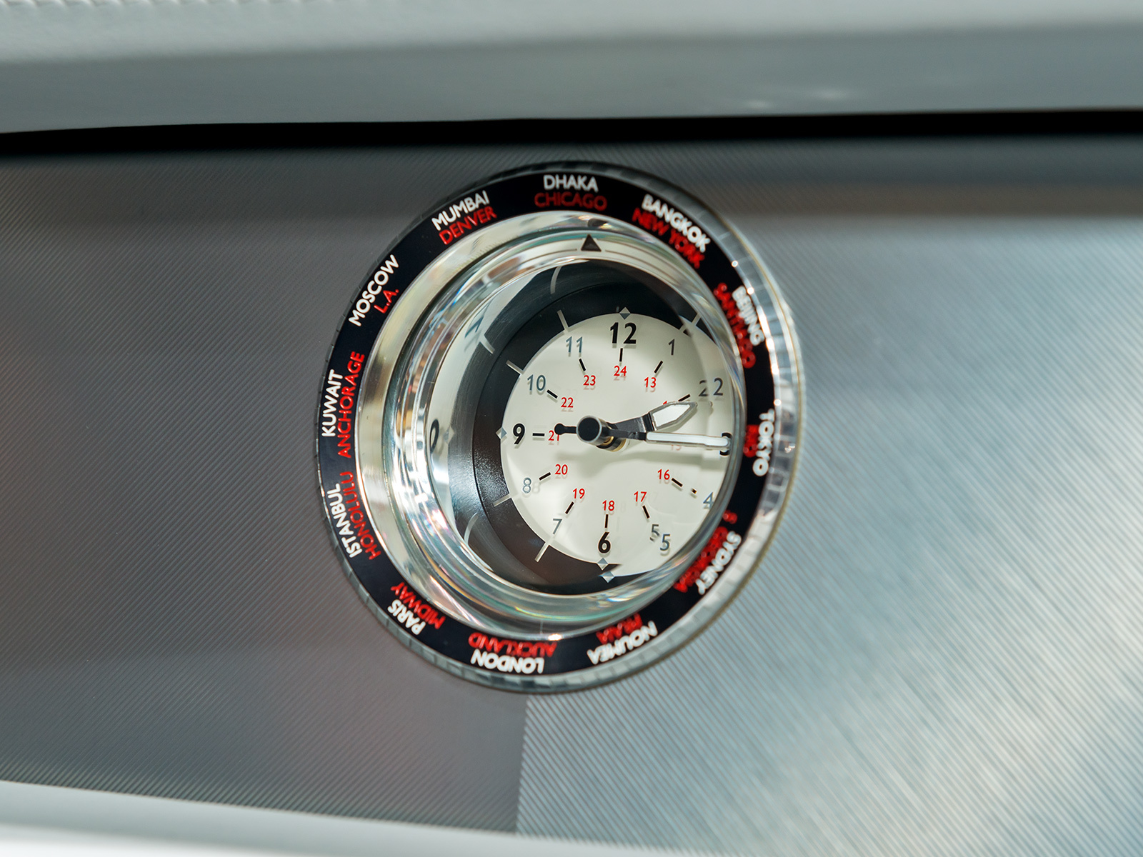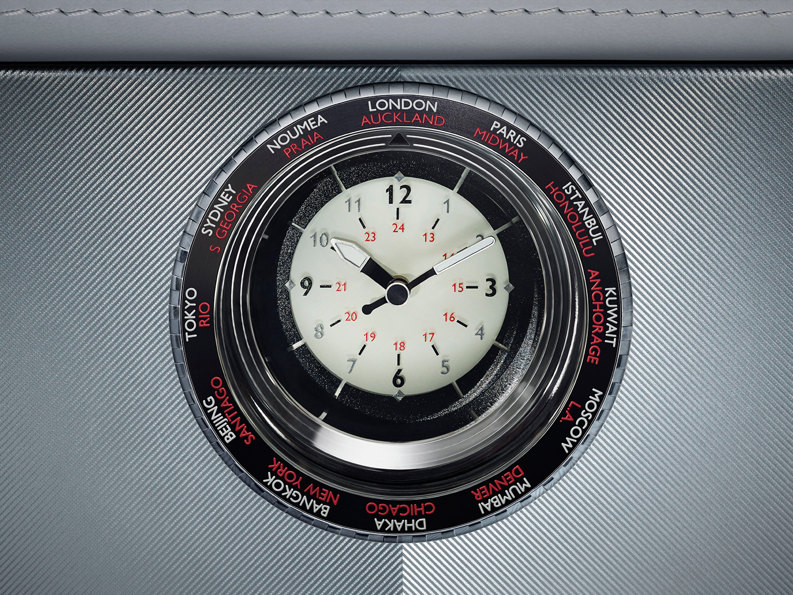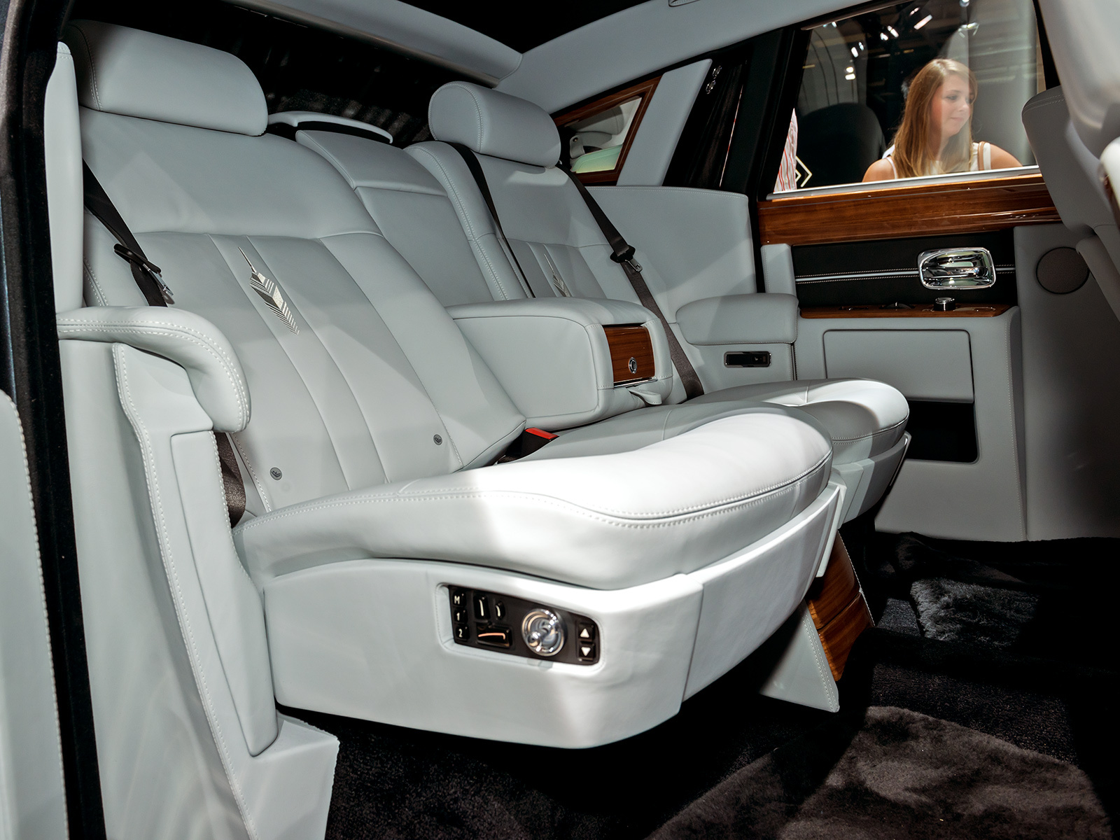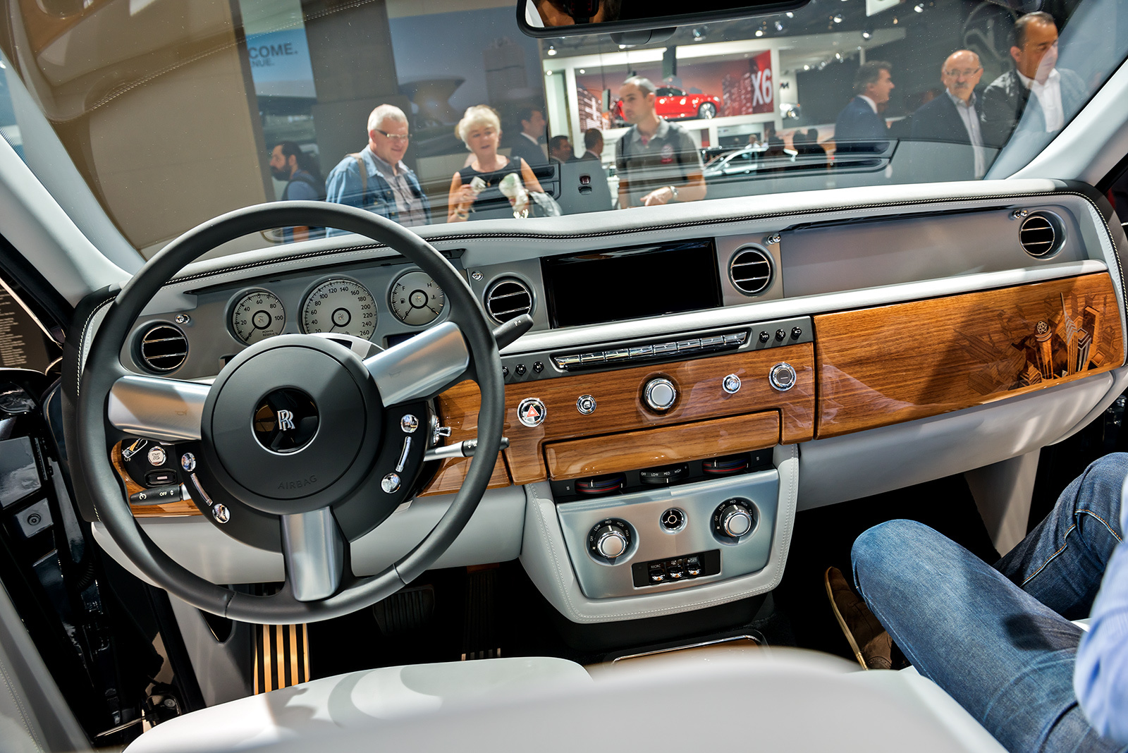 Мастера из Гудвуда вручную украсили переднюю панель, центральный тоннель, двери и столики в спинках передних сидений инкрустациями из натурального шпона, обработанного горячим песком. Мозаика из кусочков дерева изображает небоскрёбы мировых столиц с высоты птичьего полёта. Абстрактные здания вышиты и на спинках задних кресел: для этого пришлось сделать 6800 двухцветных стежков.