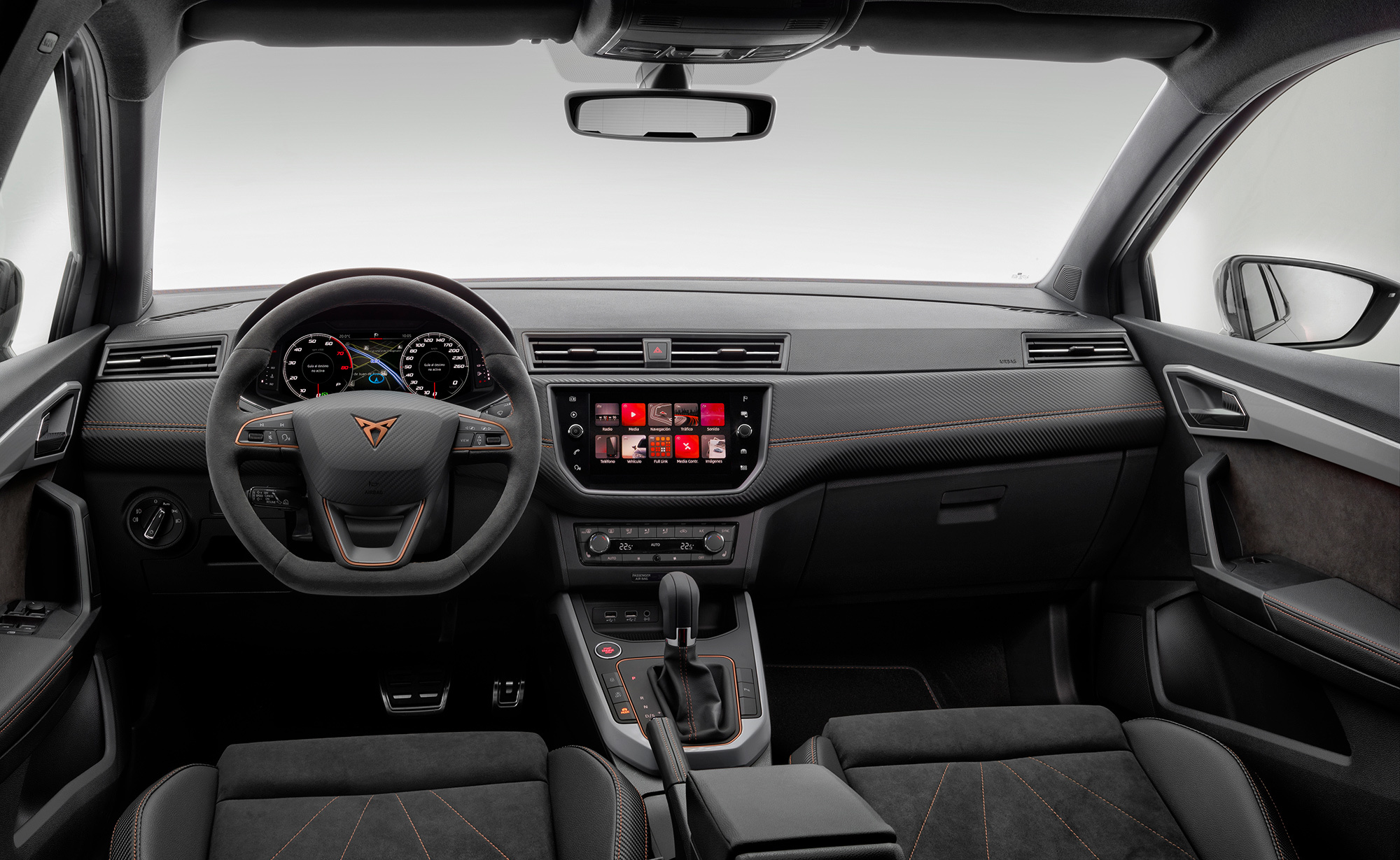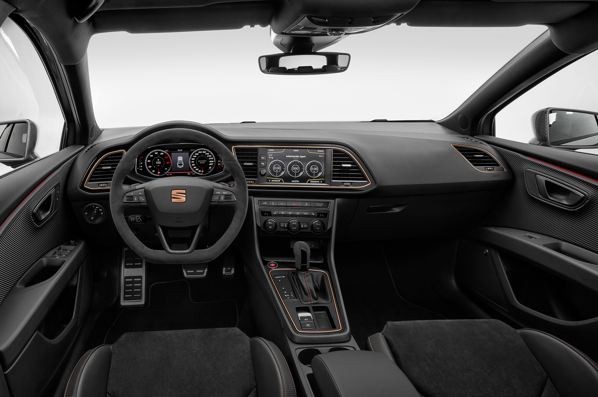 Если встречать новинку по одёжке, то впечатление самое положительное. От донора Cupra Ateca отличается решёткой радиатора, передним бампером с увеличенными воздухозаборниками и 19-дюймовыми легкосплавными колёсами, через которые видны чёрные тормозные суппорты. Не менее грозно выглядит автомобиль сзади, благодаря рельефному бамперу с диффузором и квартетом выпускных патрубков. И во внешней отделке вы не найдёте хромированных деталей ― их заменили на глянцевые элементы чёрного цвета. В салоне установлены спортивные сиденья с комбинированной отделкой кожей и алькантарой, скошенный по хорде руль и металлические накладки на педалях.