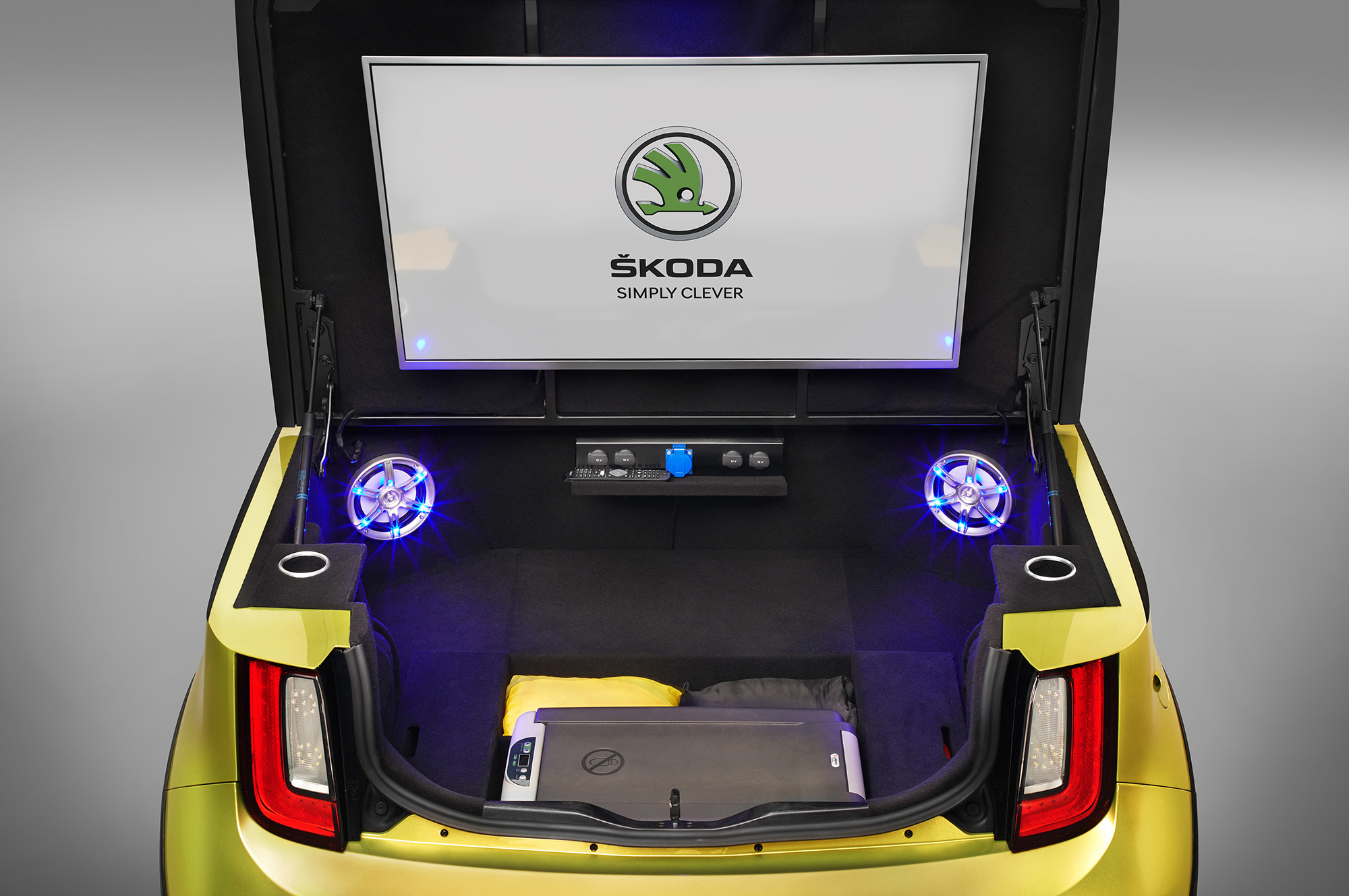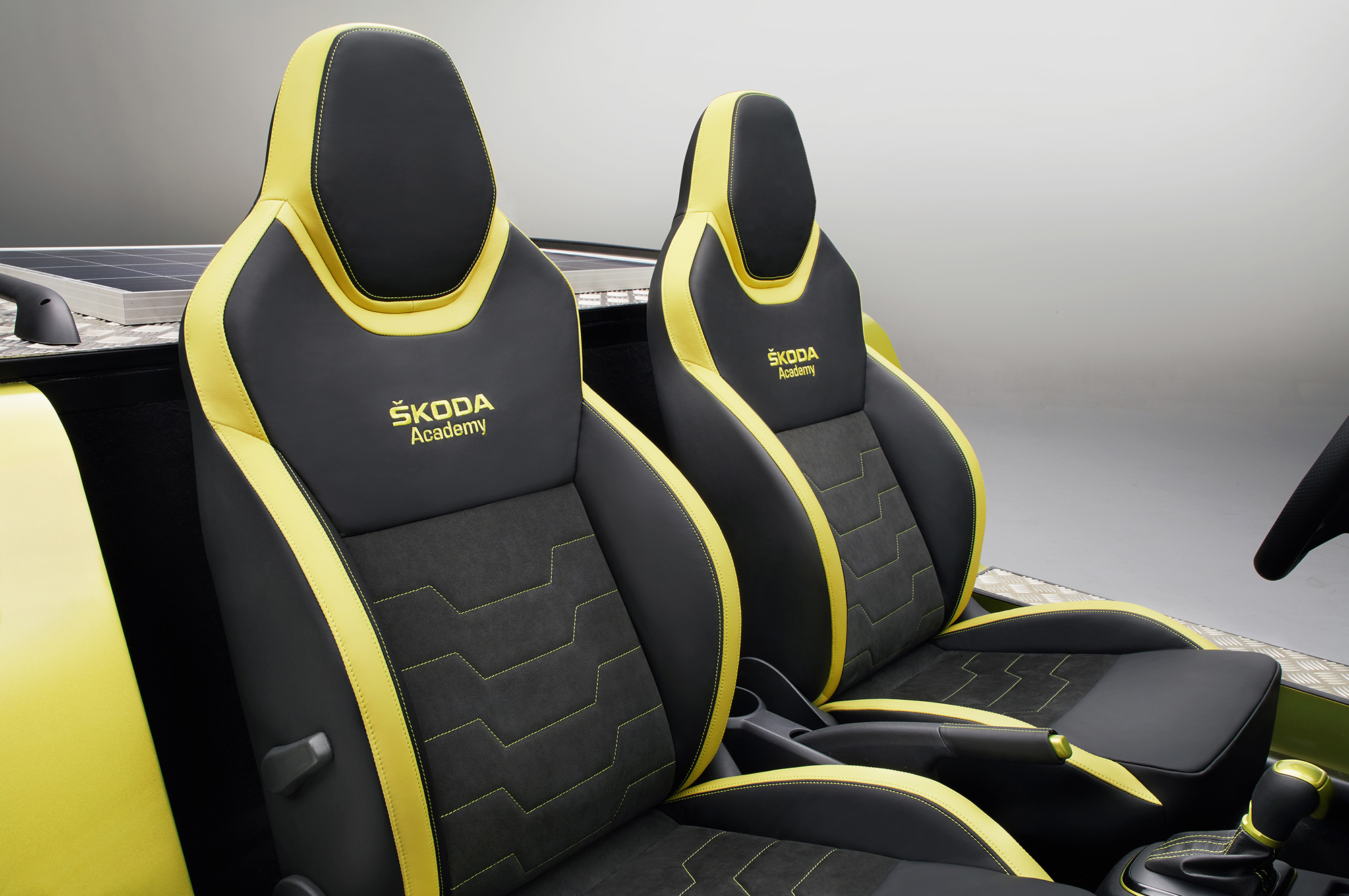 Академия Шкоды особенно гордится вниманием ребят к деталям, таким как окрашенные в жёлтый цвет Dragon Skin тормозные суппорты, алюминиевые накладки на порогах, декоративная прострочка в интерьере. Но, судя по всему, у «исследования электрического дизайна» серийного будущего нет, хотя, например, Ситроену хватило смелости поставить на поток электрокабриолет E-Mehari.