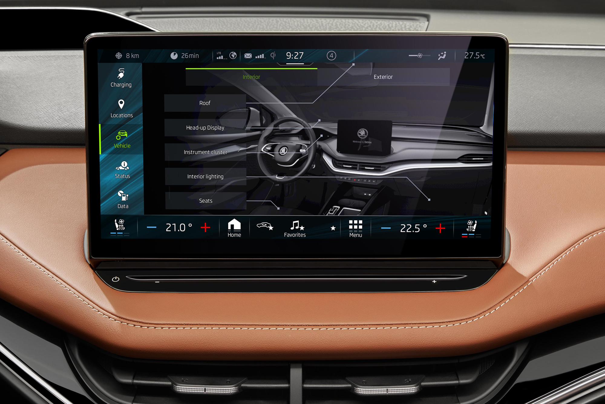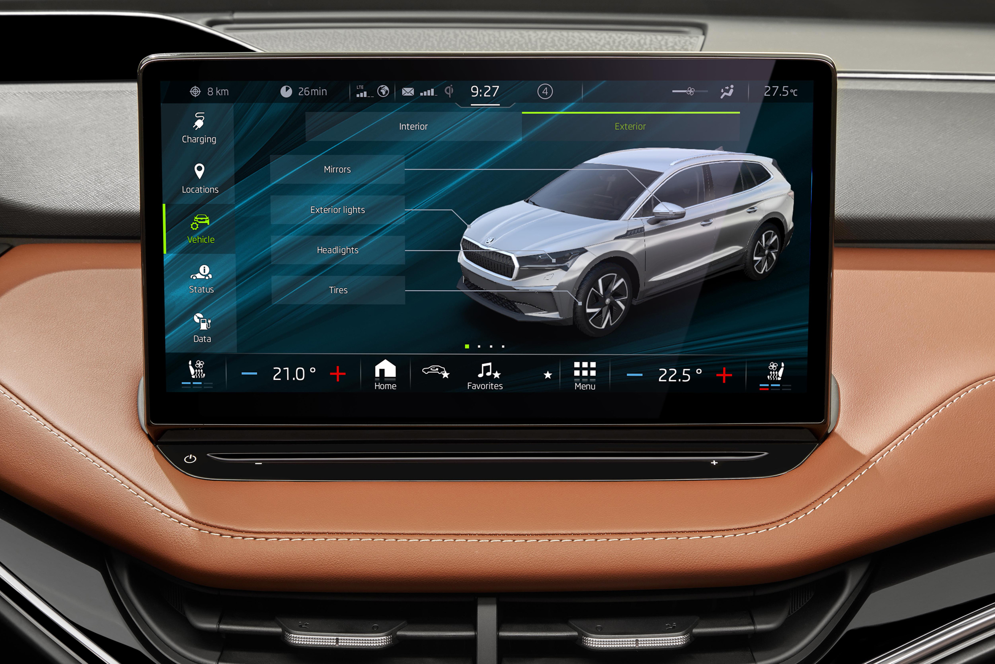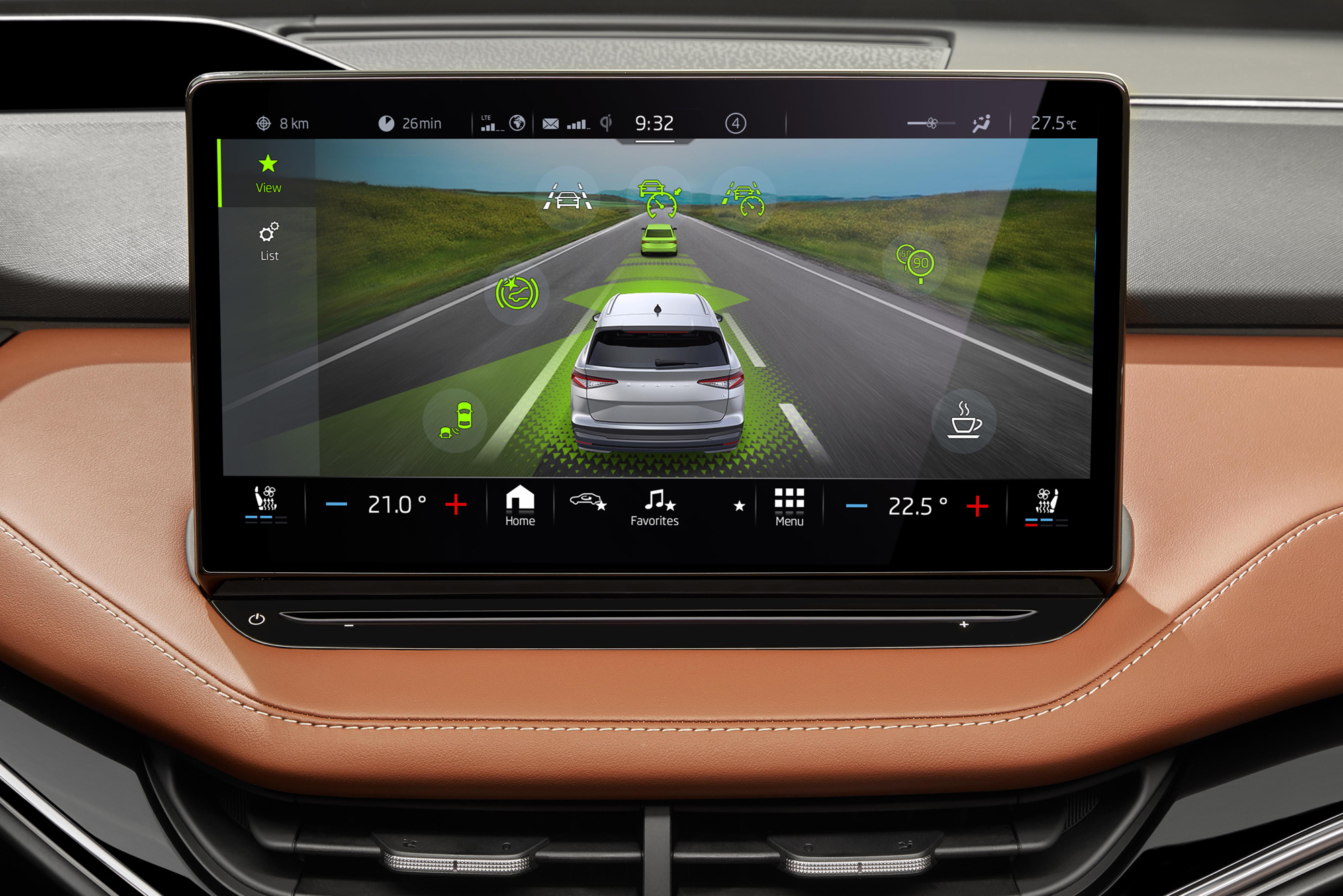 Первенец Шкоды на электрической платформе MEB, кроссовер Skoda Enyaq iV, оказался интересен не только собственно самим электроприводом. Паркетник в старших комплектациях похвастал 13-дюймовым центральным экраном (больше, чем на любой Шкоде, базовый экран — на 10) и впервые для марки получил проекционный дисплей с дополненной реальностью. Он выводит крупные подсказки навигации, а также информацию о работе помощников водителя — от автоматического удержания в полосе до адаптивного круиз-контроля.