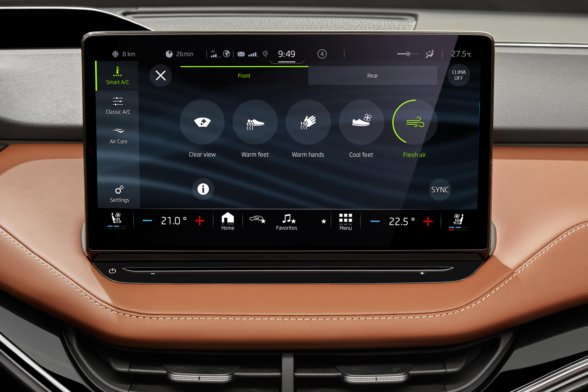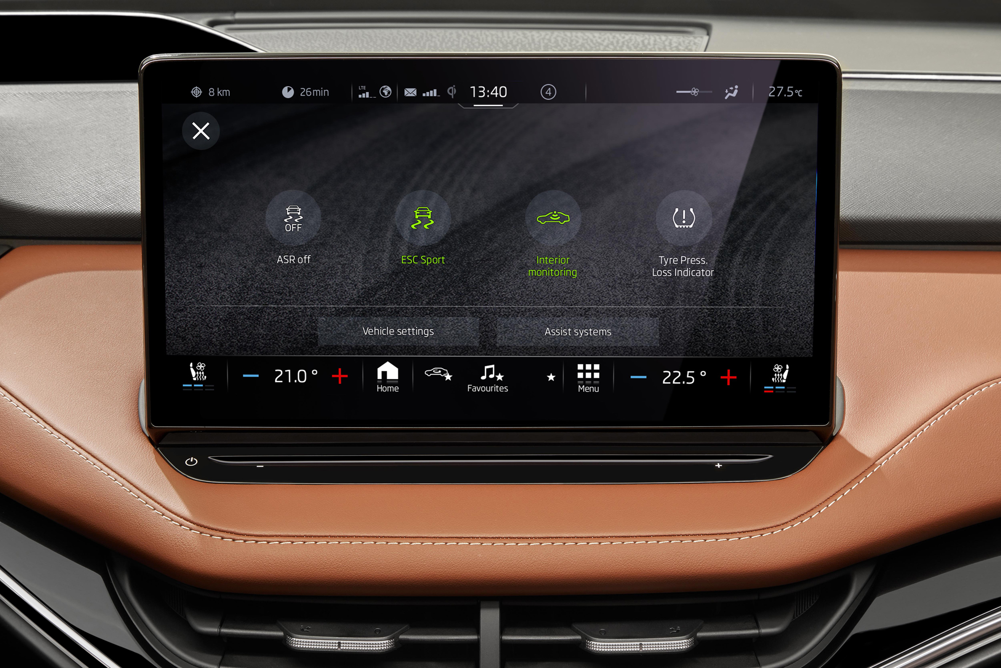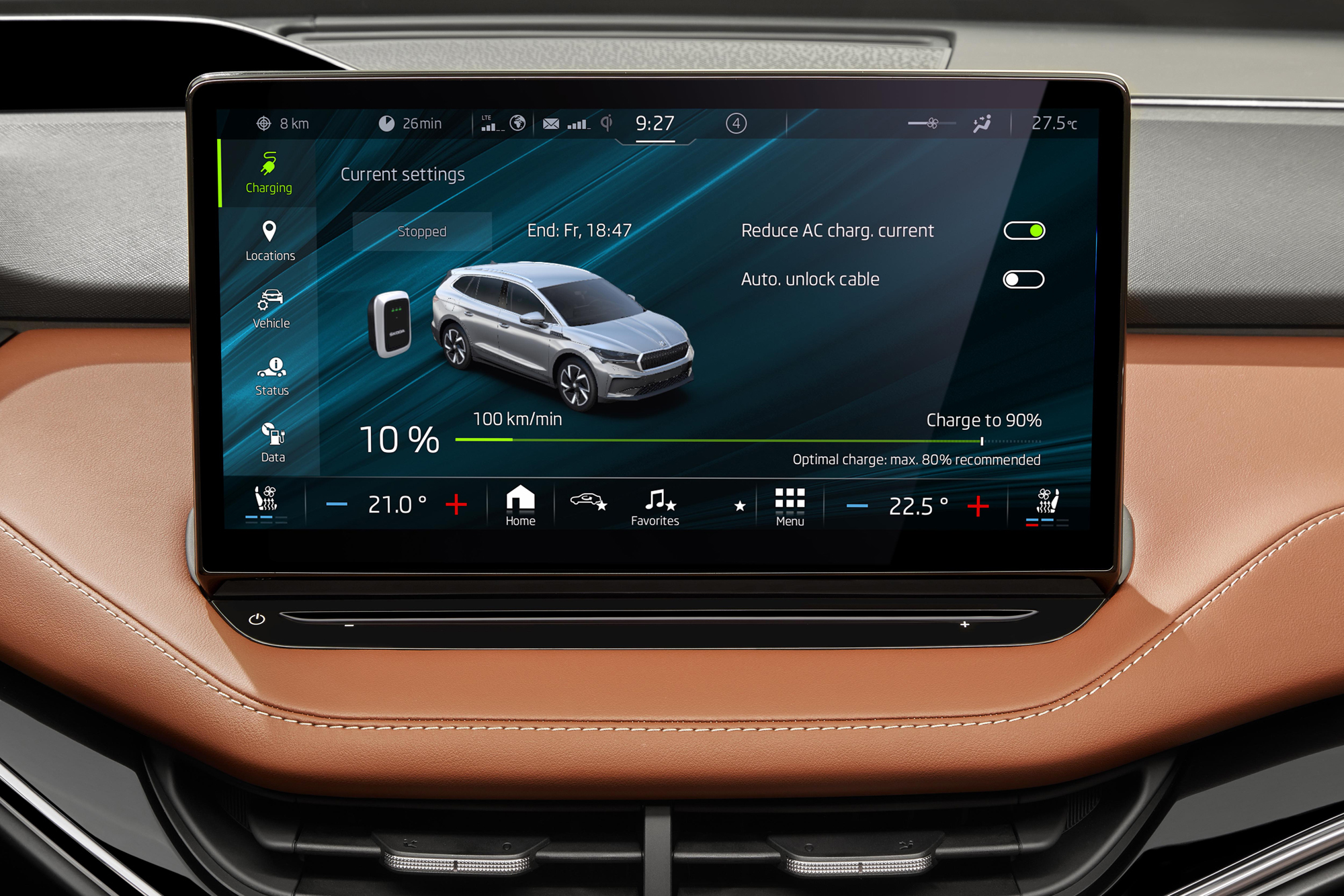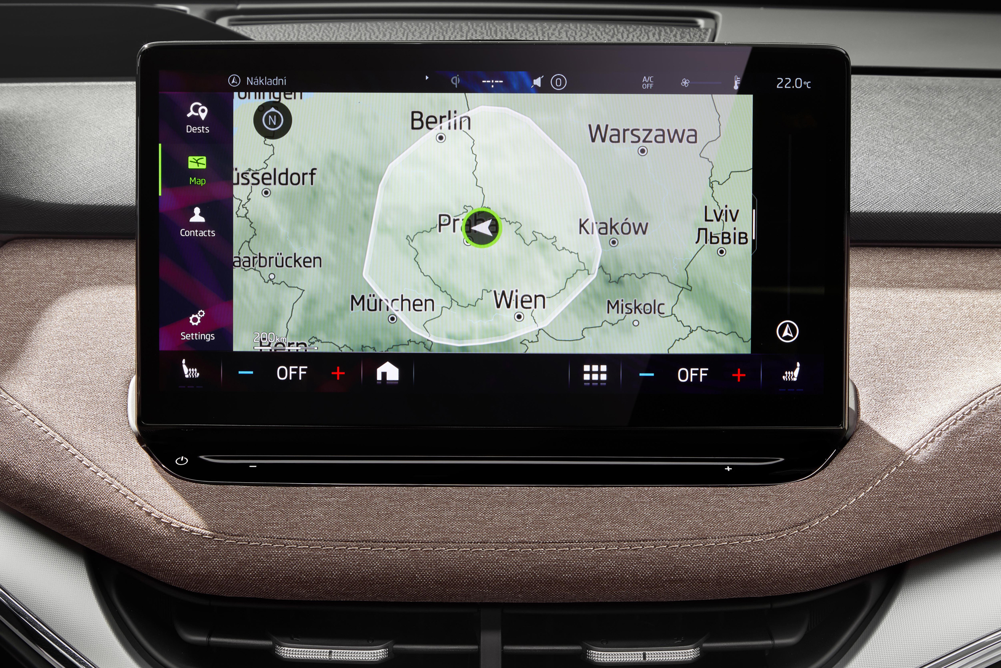 Первенец Шкоды на электрической платформе MEB, кроссовер Skoda Enyaq iV, оказался интересен не только собственно самим электроприводом. Паркетник в старших комплектациях похвастал 13-дюймовым центральным экраном (больше, чем на любой Шкоде, базовый экран — на 10) и впервые для марки получил проекционный дисплей с дополненной реальностью. Он выводит крупные подсказки навигации, а также информацию о работе помощников водителя — от автоматического удержания в полосе до адаптивного круиз-контроля.
