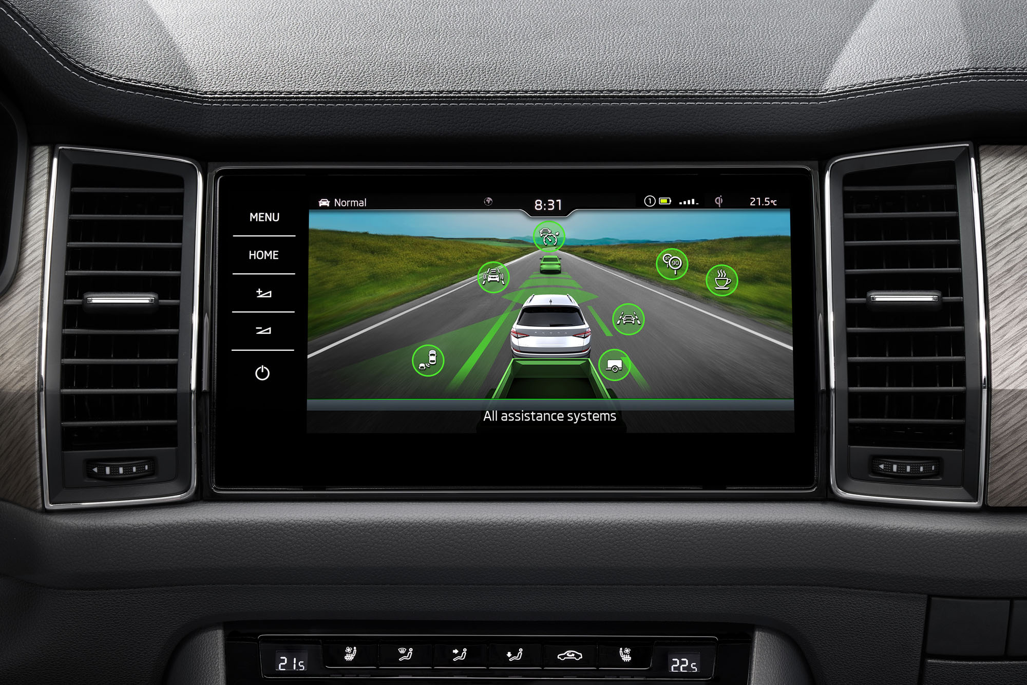 Окружающая светодиодная подсветка расширена на дверные панели и вещевые отсеки (белый цвет) и пространство для ног (переключение между десятью оттенками). Она является опцией для Ambition и Style и базовым оборудованием в L&K, Sportline и RS. Впервые в виде опции в ассортимент добавлены эргономичные сиденья с обивкой из перфорированной кожи, с электроприводом, вентиляцией и массажем. Можно заказать сиденья Eco из переработанного растительного сырья.