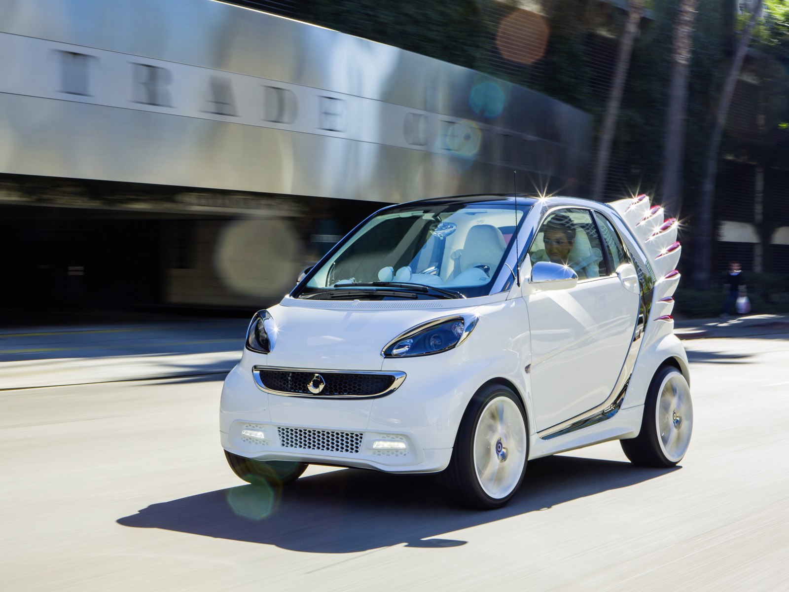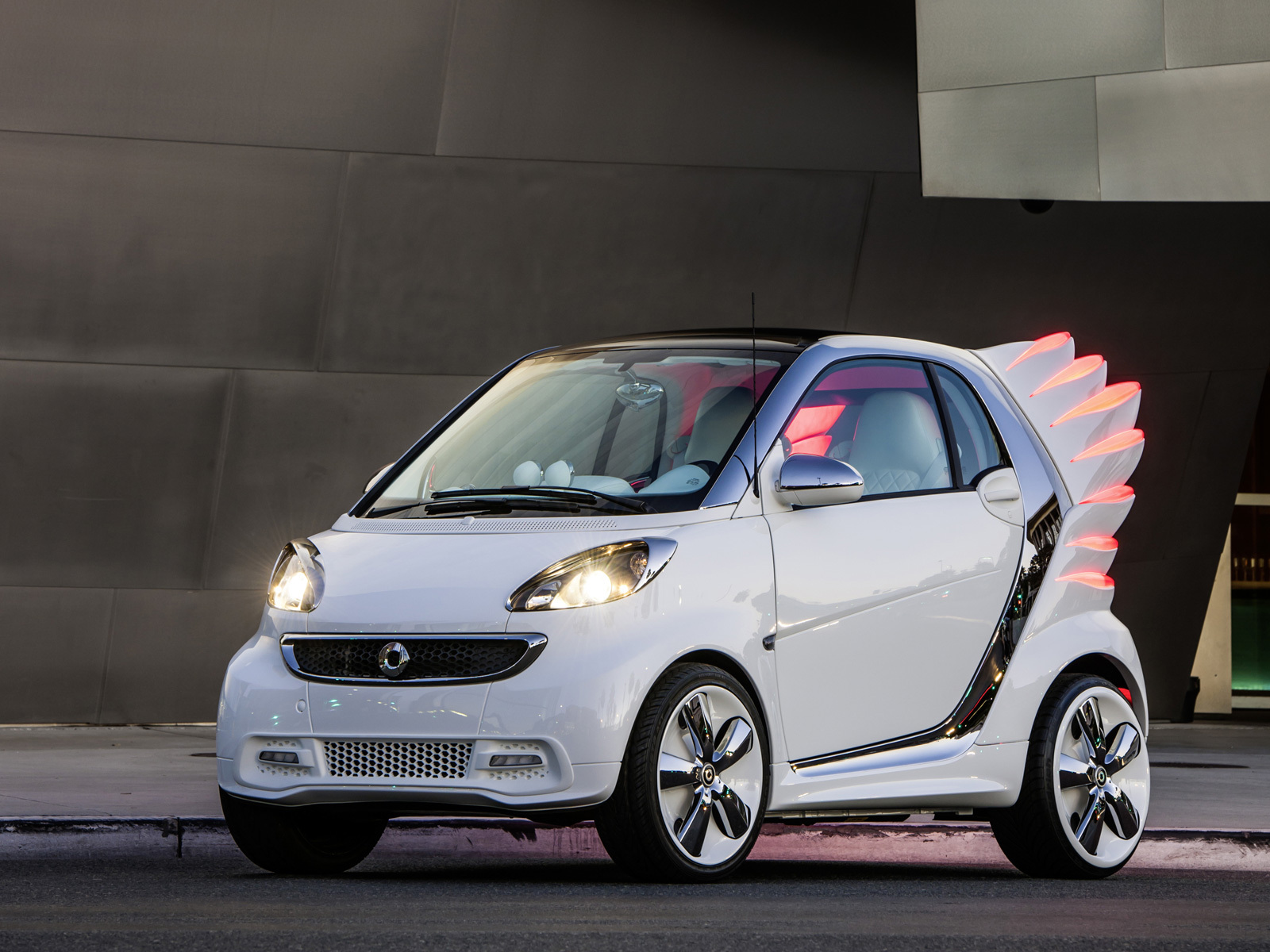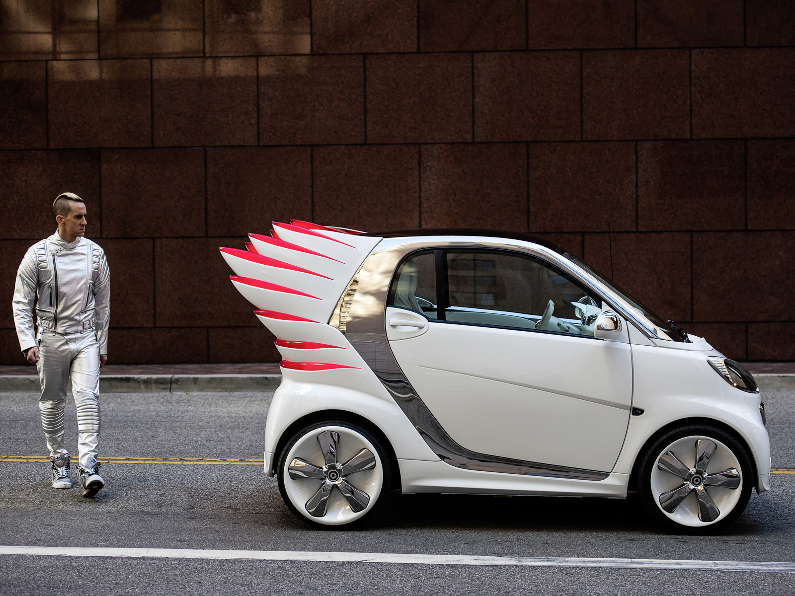 Диковинная версия электрического Смарта названа в честь известного американского модельера Джереми Скотта и скроена по его эскизам в калифорнийском дизайн-центре Mercedes-Benz Cars Advanced Design Studios. Smart forjeremy Concept стал новаторским опытом для марки: впервые модельеру позволили не только изменить интерьер, подобрать материалы или цветовые схемы для автомобиля, но и вмешаться непосредственно в кузов. В результате у концепта выросли большие стеклопластиковые «крылья» сзади. Причём они полупрозрачные и зажигаются красным, играя роль габаритов и стоп-сигналов.