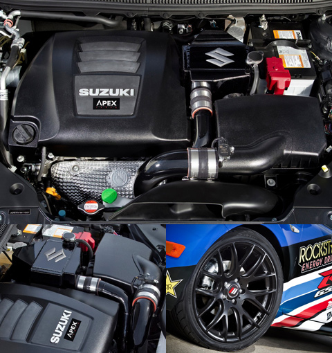Соседствующий с гибридом концепт Kizashi Apex — совсем другая песня. Изюминка «заряженного» седана, раскрашенного на манер гоночного супербайка Suzuki GSX-R, — это модифицированная при помощи турбонагнетателя и ещё целого комплекса мер штатная бензиновая «четвёрка» 2.4. Её мощность японцы довели до