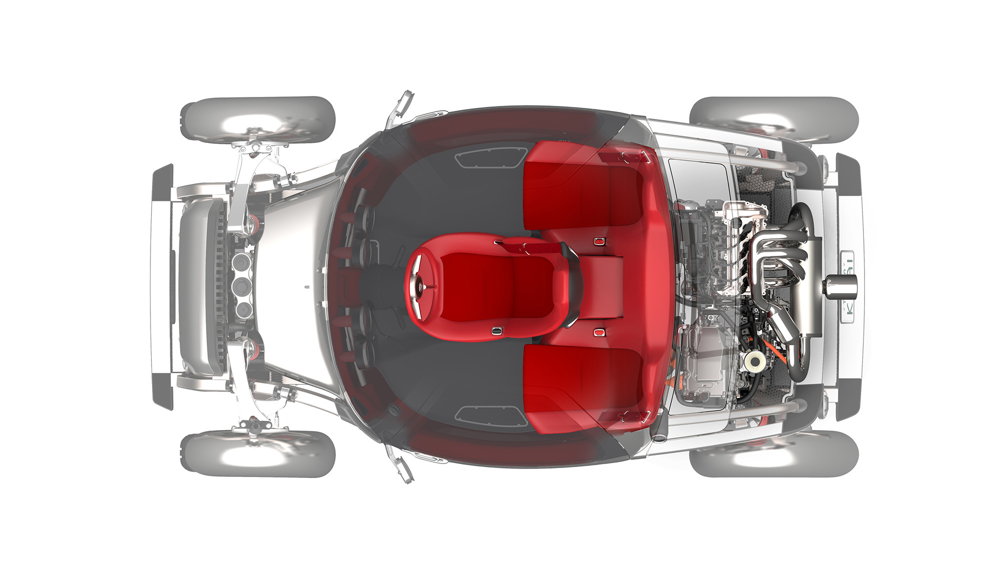Так или иначе, здесь мы видим переднее расположение мотора со значительным смещением вглубь базы, независимую подвеску, шестиступенчатую «механику» и задний привод. Масса не указана, но компания упоминает об очень лёгком кузове, а неофициально известно, что машина весит не более тонны.